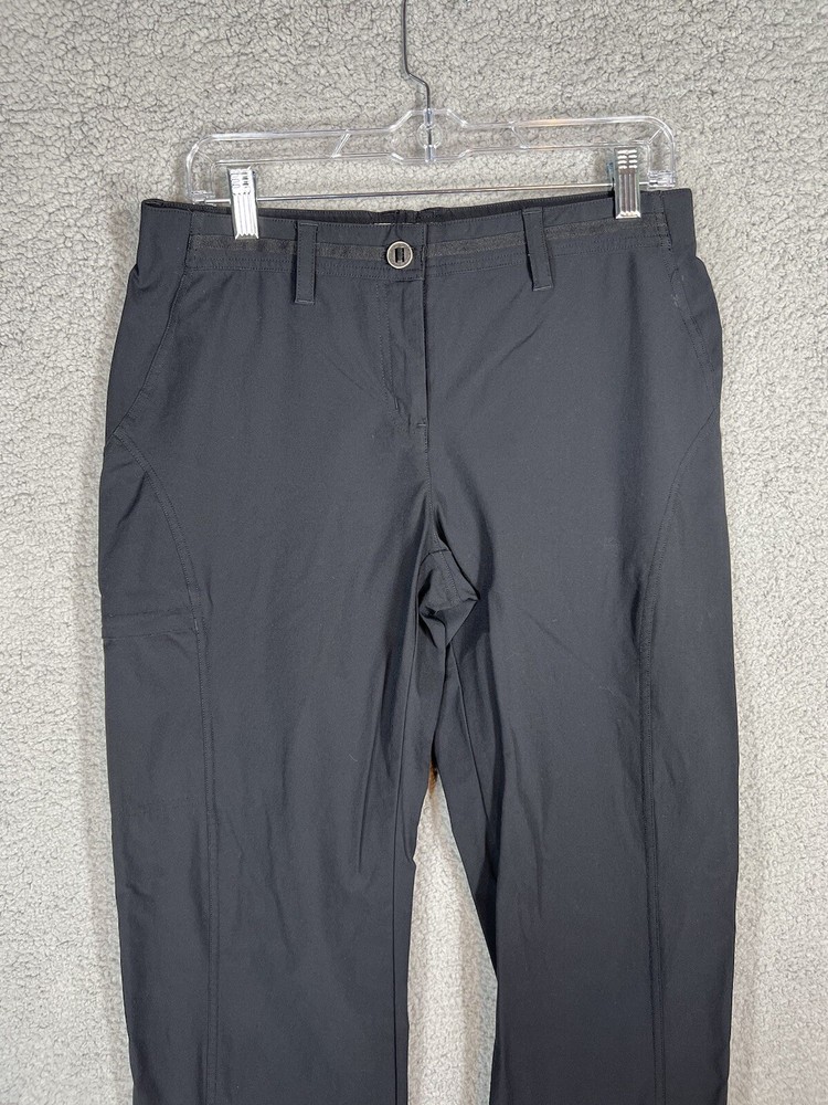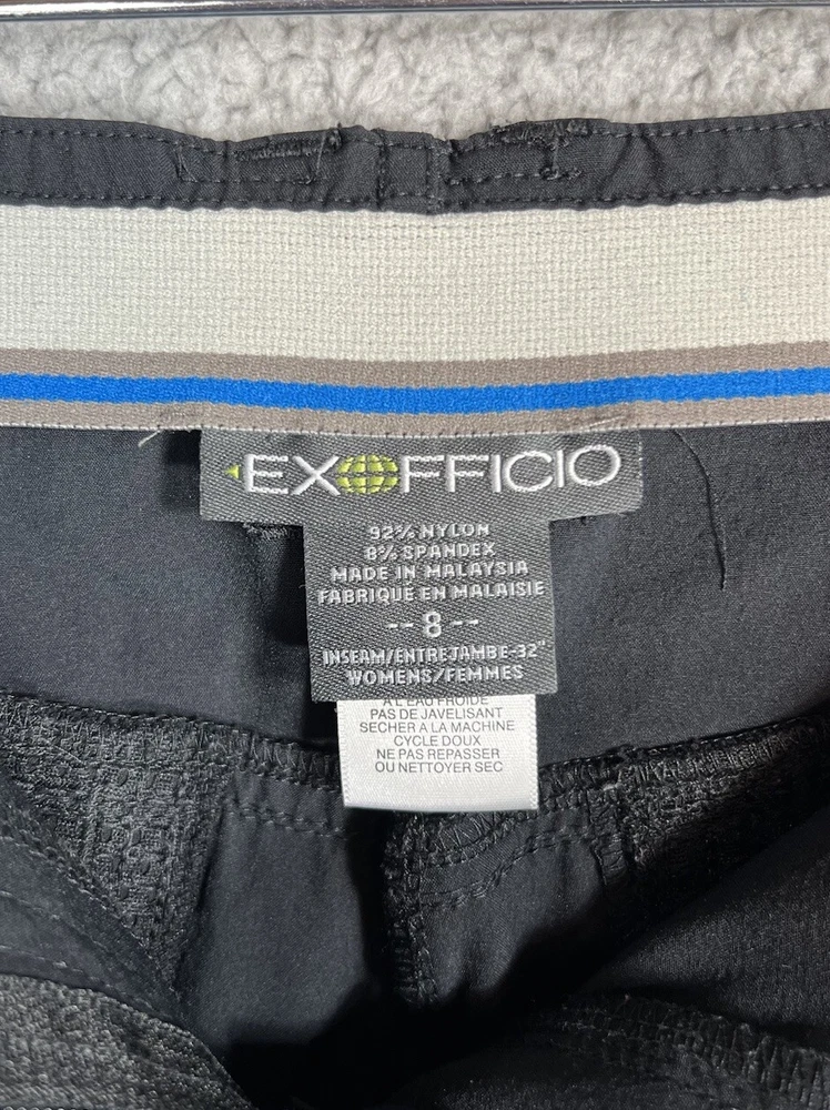 ExOfficio Black Nylon Golf Hiking Cargo Pants. Women's Size 8. Zipper and button closure with elastic waist and beltloops. These pants have 3 pockets with zipper closures (2 back and 1 cargo). Nylon/Spandex blend material. Excellent pre-owned condition. A pproximate measurements: Waist: 16 inches flat Rise: 10.5 inches Inseam: 31.5 inches Please see measurements as all brands can vary in size.