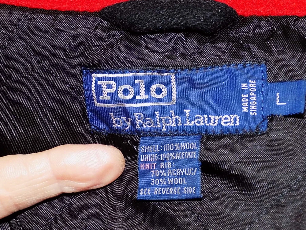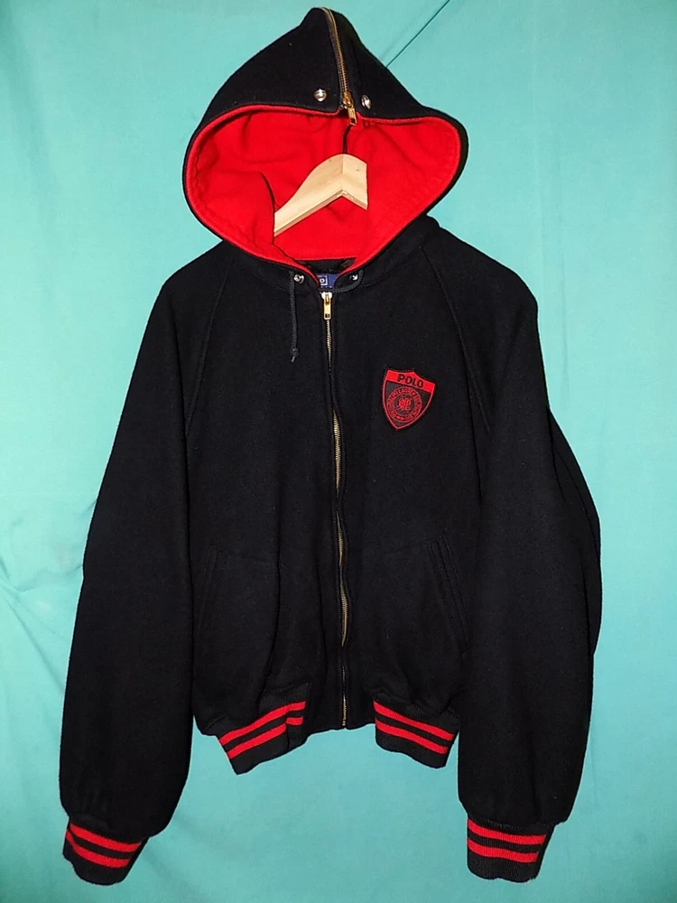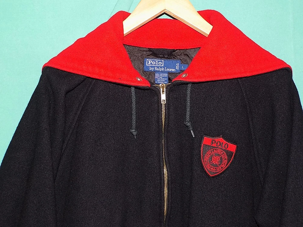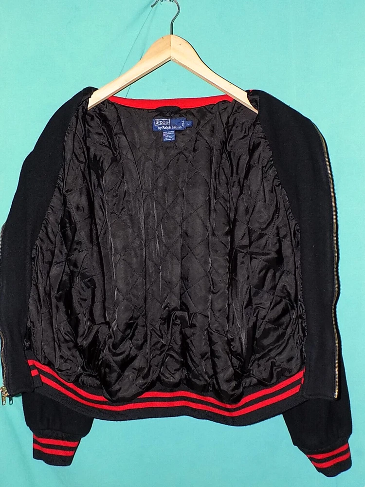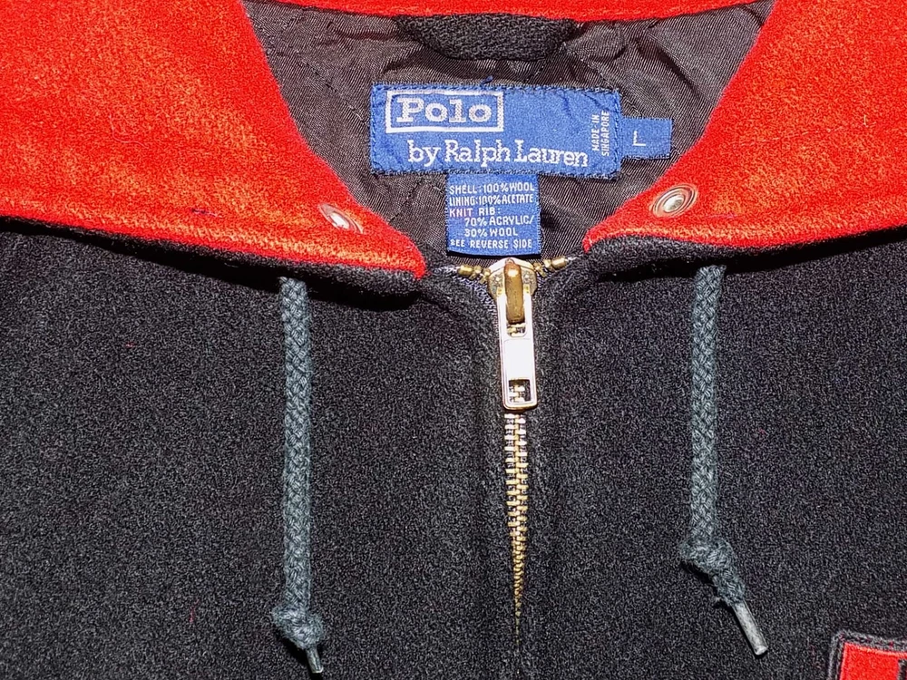 Fantastic vintage Ralph Lauren Polo varsity jacket. Scribble logo badge logo on front (see closeup pic.) In EXCELLENT condition. No flaws outside. The only flaw is on the inside tag where some red dye that transferred on to the blue and white tag (see pic ) The material on the outside is 100% wool. Full zipper up the front with a tie cord at the top neck. Split hood with zipper - we took a lot of pictures with the hood both zipped and unzipped. 2 front lined pockets. Quilted acetate lining on the inside. The colors are black and red. We took lots of pics so you can see for yourself. The tag size is L and as is typical of Ralph Lauren clothing it actually measures a size larger - as an XL EXACT MEASUREMENTS: - LENGTH MEASURED FROM THE BASE BACK COLLAR SEAM TO THE BOTTOM EDGE: 23 1/2" - SHOULDERS ESTIMATED ACROSS THE TOP BACK SHOULDERS: 20" (THIS STYLE DOES NOT HAVE SHOULDER SEAMS) - ARMPIT SEAM TO ARMPIT SEAM MEASURED ACROSS OUTSIDE FRONT: 24" - CHEST MEASURED ARMPIT TO ARMPIT ACROSS OUTSIDE FRONT, x2 FOR STANDARD CHEST SIZE:48" - WAIST MEASURED ACROSS OUTSIDE FRONT WITH ELASTICITY RENDERED BY RIBBINGS (x2): 44" to 46" - SLEEVES LENGTH MEASURED IN THE TRADITIONAL WAY FROM THE CENTER BACK OF THE COLLAR TO THE SHOULDER AND THEN DOWN THE LENGTH OF THE SLEEVE TO THE EDGE OF THE CUFF: 36" - SLEEVES MEASURED FROM THE SHOULDER SEAM TO THE EDGE OF THE CUFF: 26" We take exact measurements - please go by these instead of the tag size to ensure a good fit. To be certain, measure a similar article of clothing that you wear and compare numbers. We have other vintage clothing on auction and when you buy multiple items I'll ship them together & you will pay only the exact shipping cost. Please wait for us to send you an adjusted invoice before you pay. If you have any questions please email before winning the auction. U.S. buyers to pay for Priority Mail shipping with a tracking number which takes 1-4 business days. International buyers to pay for eBay International Shipping. We can ship only to the address eBay has on file for you. We ship quickly and will send an email with the tracking number & shipping date. Thanks!