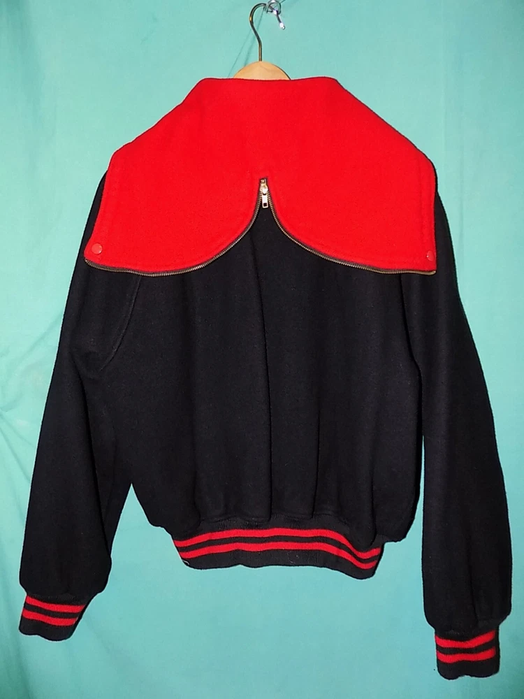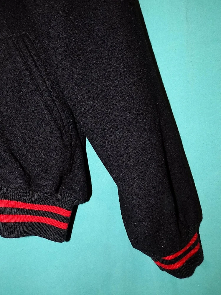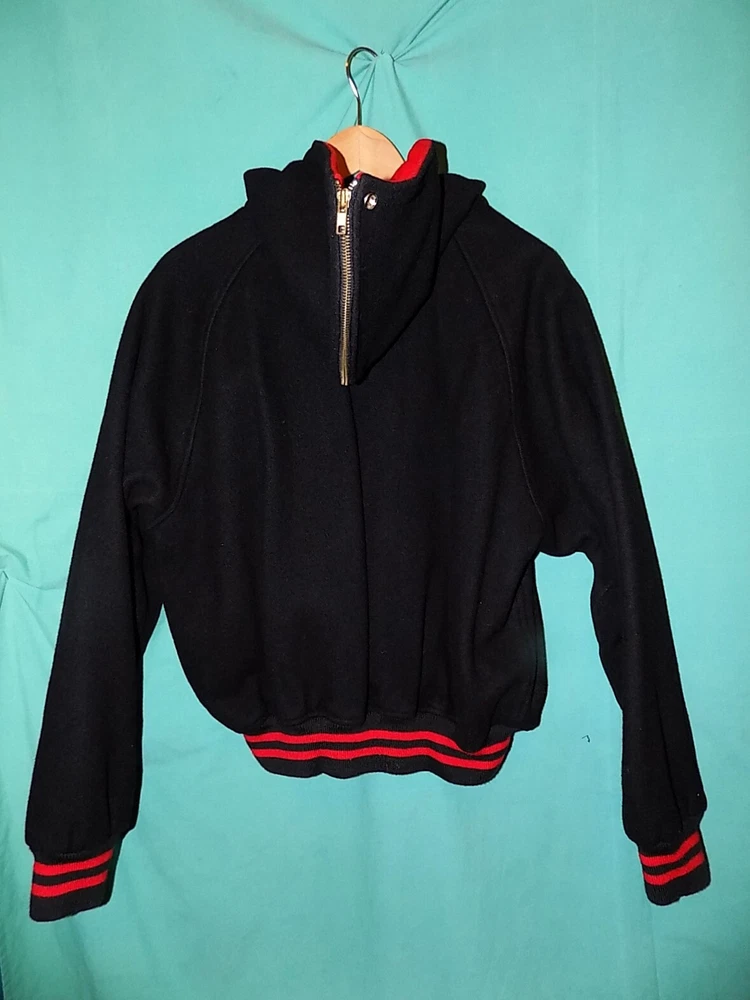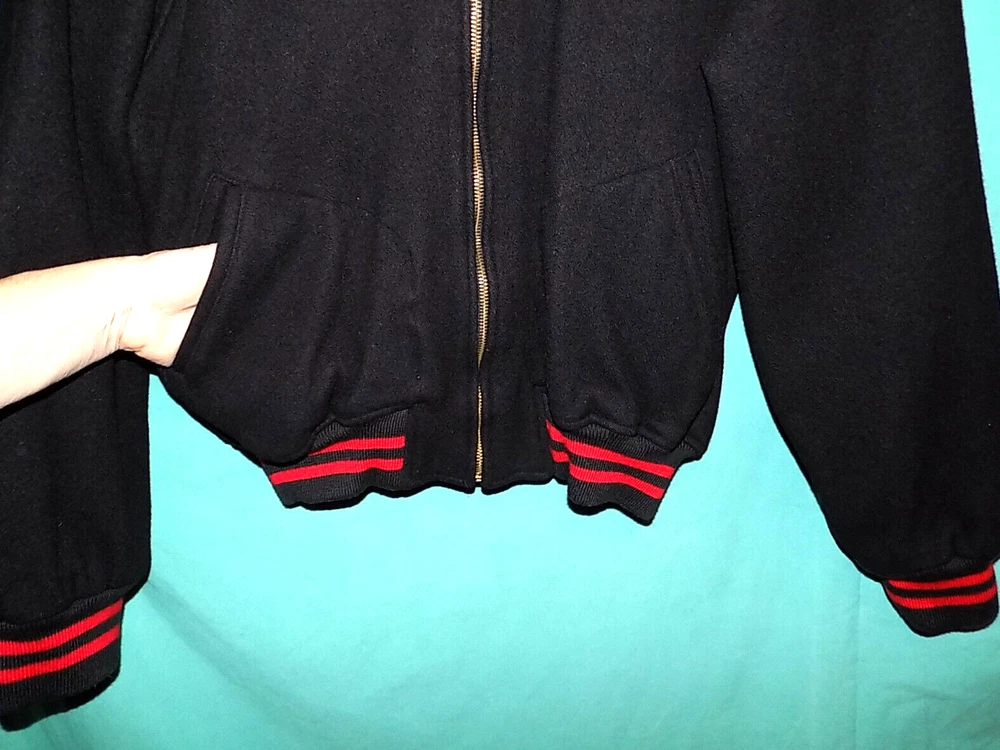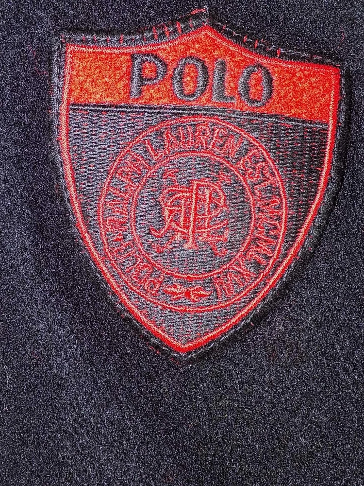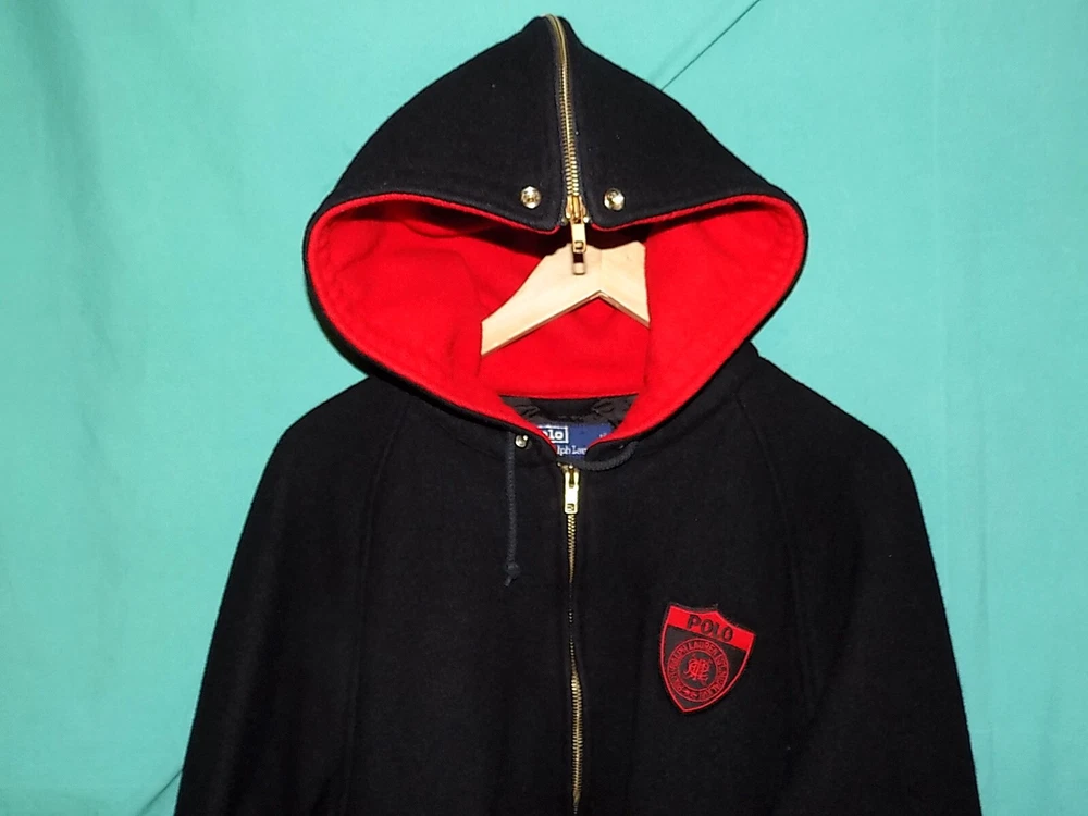 Fantastic vintage Ralph Lauren Polo varsity jacket. Scribble logo badge logo on front (see closeup pic.) In EXCELLENT condition. No flaws outside. The only flaw is on the inside tag where some red dye that transferred on to the blue and white tag (see pic ) The material on the outside is 100% wool. Full zipper up the front with a tie cord at the top neck. Split hood with zipper - we took a lot of pictures with the hood both zipped and unzipped. 2 front lined pockets. Quilted acetate lining on the inside. The colors are black and red. We took lots of pics so you can see for yourself. The tag size is L and as is typical of Ralph Lauren clothing it actually measures a size larger - as an XL EXACT MEASUREMENTS: - LENGTH MEASURED FROM THE BASE BACK COLLAR SEAM TO THE BOTTOM EDGE: 23 1/2" - SHOULDERS ESTIMATED ACROSS THE TOP BACK SHOULDERS: 20" (THIS STYLE DOES NOT HAVE SHOULDER SEAMS) - ARMPIT SEAM TO ARMPIT SEAM MEASURED ACROSS OUTSIDE FRONT: 24" - CHEST MEASURED ARMPIT TO ARMPIT ACROSS OUTSIDE FRONT, x2 FOR STANDARD CHEST SIZE:48" - WAIST MEASURED ACROSS OUTSIDE FRONT WITH ELASTICITY RENDERED BY RIBBINGS (x2): 44" to 46" - SLEEVES LENGTH MEASURED IN THE TRADITIONAL WAY FROM THE CENTER BACK OF THE COLLAR TO THE SHOULDER AND THEN DOWN THE LENGTH OF THE SLEEVE TO THE EDGE OF THE CUFF: 36" - SLEEVES MEASURED FROM THE SHOULDER SEAM TO THE EDGE OF THE CUFF: 26" We take exact measurements - please go by these instead of the tag size to ensure a good fit. To be certain, measure a similar article of clothing that you wear and compare numbers. We have other vintage clothing on auction and when you buy multiple items I'll ship them together & you will pay only the exact shipping cost. Please wait for us to send you an adjusted invoice before you pay. If you have any questions please email before winning the auction. U.S. buyers to pay for Priority Mail shipping with a tracking number which takes 1-4 business days. International buyers to pay for eBay International Shipping. We can ship only to the address eBay has on file for you. We ship quickly and will send an email with the tracking number & shipping date. Thanks!