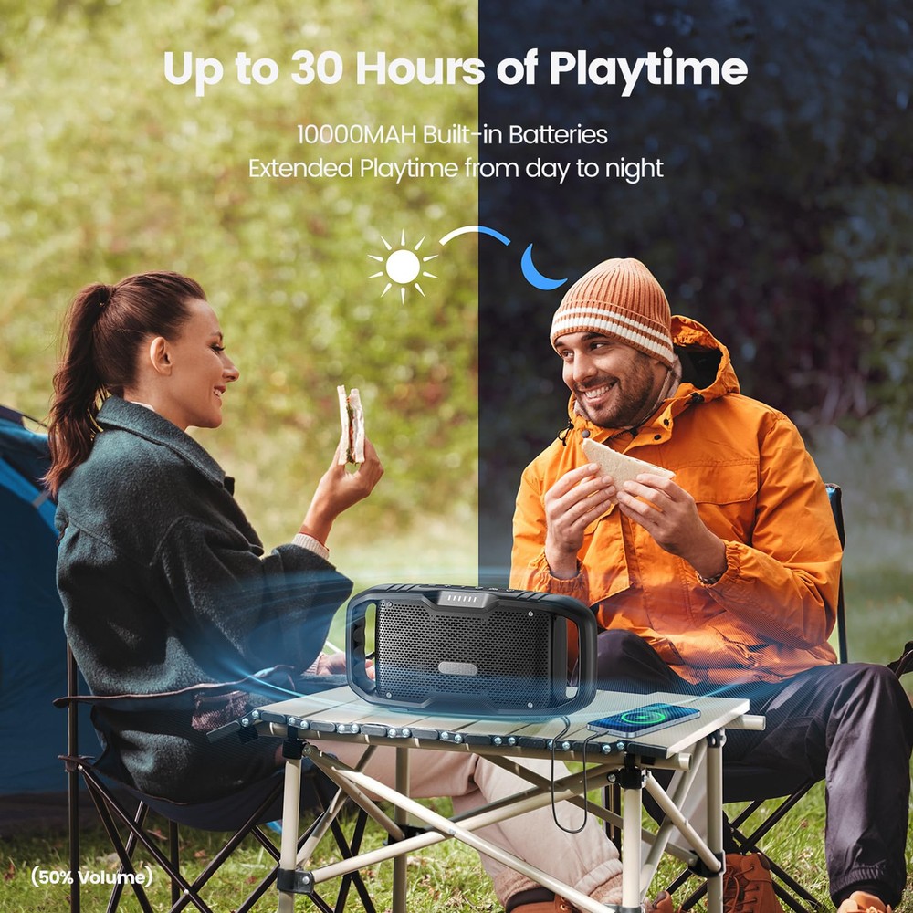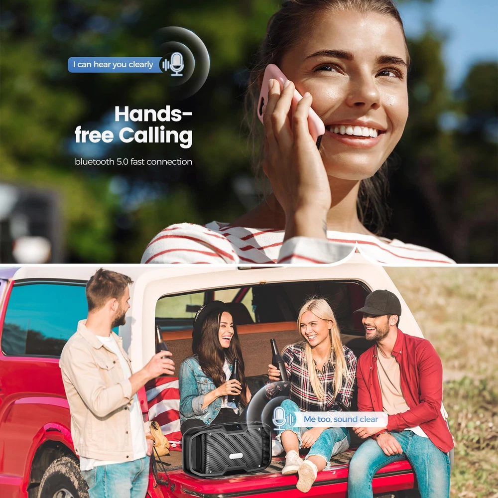 [Loud Powerful Sound]: With its dual tweeters, dual subwoofer, dual passive radiators and EX-BASS (Exclusive Bass)technology, this Bluetooth speaker deliver a 50W(70W Peak) powerful full-range sound, releases with greater clarity and zero distortion. Unique bass enhancement technology, press the EX-BASS button, it can produce a deeper, thicker and more elastic bass.Upgraded speakers, More Power, Better sound. It has the sound quality and capacity of a large speaker and the portability of a small speaker. [10000MAH Built-in Batteries & 30H Playtime]: This portable bluetooth speaker built-in 10000mAh rechargeable battery can up to 30 hours of playtime at 50% volume. No matter what outdoor activities you participate in, this speaker covered with its reliable and long-lasting battery performance. Plus,You can also play music from your PC,TV,and other non-Bluetooth devices via the 3.5mm audio jack. [IPX5 Waterproof Portable Bluetooth Speaker]: IPX5 waterproof bluetooth speakers on the go no longer have to worry about water spray, splashes, rain, accidental spills or dust! This is perfect for the beach, shower room, poolside, garage, patio, yard, boat, garden, bedroom, parties, camping, and more! Embrace your outdoor adventures with 50W real waterproof bluetooth speaker. [Stable Bluetooth Connection & TWS Pairing]: Adopting Bluetooth 5.0 technology, ensures a more stable bluetooth wireless connection, the most perfect sound quality transmission and 100ft bluetooth range. Sync and pair 100+ this outdoor speakers for a ture stereo surround sound experience,give you much louder volume and sound quality of live concert! Wirelessly pair 2 bluetooth speaker to get 100W powerful stereo and an immersive sound experience.Perfect for gaming, music, and movie playback. [Hands-Free of Your Call & An Ideal Gift]: Pick up a call very conveniently when playing music due to the built-in microphone in this wireless speaker. it is an perfect gift for your friend and family. it can used at any occasions,such as Birthday, Easter, Christmas, Party, Anniversary, Fathers Day, Wedding,et.