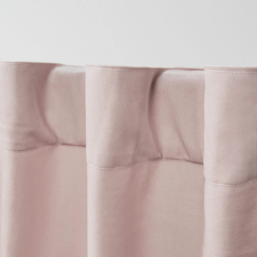 The Velvet Heavyweight Hidden Tab Top Window Curtain Panels in blush bring a luxurious look and feel to any room and offer a simple way to add color and texture to your decor. These plush velvet panels have a light-filtering opacity and filter light beautifully into your space while also providing privacy. Hang 3 ways: using the rod pocket, the back tabs, or with curtain clips (not included). For proper look and fullness, the curtains should measure 2-3 times the width of your window. LUXURIOUS: The Exclusive Home Velvet Heavyweight Hidden Tab Top Curtains offer a luxurious look for your windows in any room. The light-filtering fabric filters light beautifully into your space while also adding color and texture to your decor. LIGHT FILTERING OPACITY: light filtering opacity provides privacy to your room while still allowing natural light to shine through. It's perfect for diffusing light beautifully into your space. 3 HANGING OPTIONS: Drape these curtain panels (1) from the rod pocket for a classic look, (2) using the hidden tabs to create an elegant pleated effect, or (3) using clip rings for easy, slide open and closed (clip rings are not included). Fits up to 1.5" diameter rod. SET OF TWO CURTAIN PANELS: Includes two (2) curtain panels, each measuring 52"W x 96"L. PLUSH VELVET: These well-crafted, plush velvet panels enhance any space in your home with vivid color and lavish texture, Hang them in your living room, dining room, bedroom, office, hallway, or entryway.