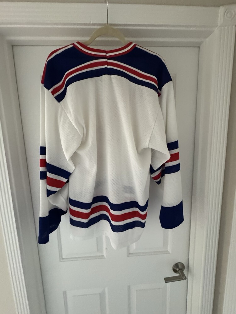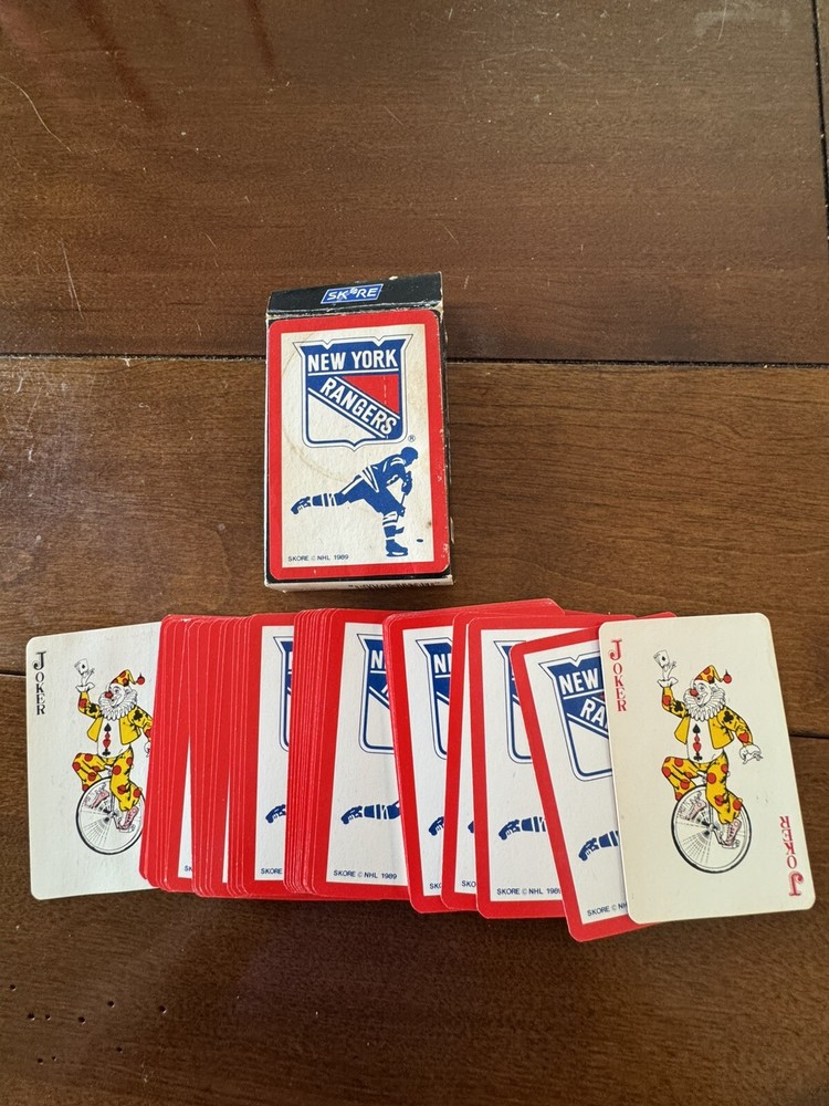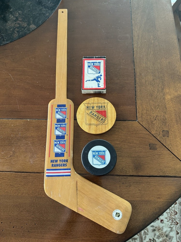 New York Rangers items - Men’s medium jersey, Puck, Souvenir goalie stick, coaster, playing cards. Ideal for any Rangers fan. Whoaaa, whoaaa, whoaaa, hey, hey, hey, hey, hey. Don’t miss out on this. Used items in good shape.
