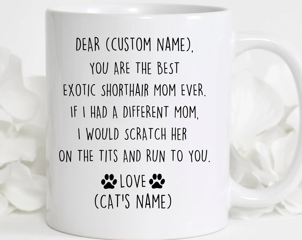 Exotic Shorthair Mom Birthday Gift Funny Exotic Cat Mom Christmas Gift Exotic Cat Mom Valentine Gift Funny Exotic Cat Mom Appreciation Product Details.. This high quality 11oz. ceramic white mug has a premium hard coat that provides crisp and vibrant color reproduction sure to last for years. Perfect for all hot & cold beverages. The highest quality printing possible is used. It will never fade no matter how many times you wash it. Material: 100% Ceramic. Print both sides. Dishwasher and Microwave Safe. High Gloss + Premium White Finish. Printed in the U.S.A. Personalized & Custom. We support personalized and custom mug to add custom, when placing an order, you can add notes to the "order note" in shipping address section. Also you can contact us directly via message. Shipping Info. Ready to ship in 1 to 2 business days, All products are made-to-order and proudly printed in the United States. Shipped by USPS and DHL, You will receive your order in 5-7 days. Replace & Refund. All products are defective during shipping broken, chipped will be replaced free of charge. You are not satisfied with the product, we will refund 100% money to you. If any other issues arise, please do not hesitate to message, we would be more than happy to assist you.