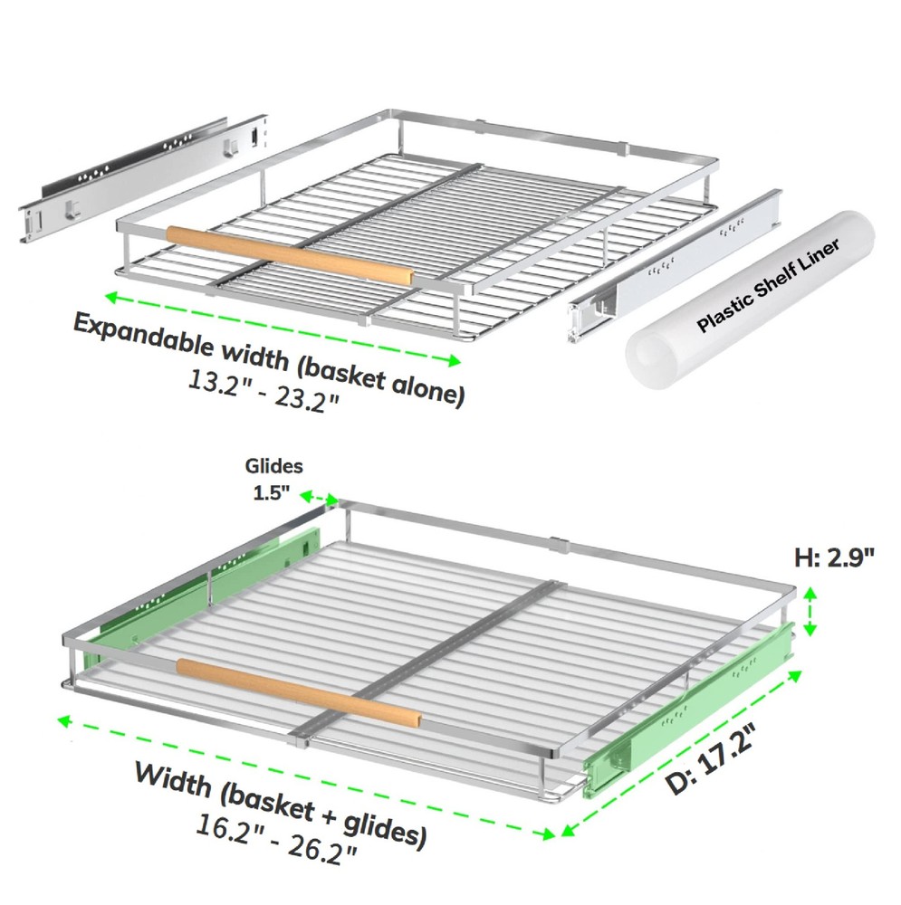 EXPANDABLE DESIGN: This pull out cabitnet shelf is designed to fit in most cabinets. The width of the wire basket can be adjusted from 16.2“ to 26.2”. The new expandable design gives you a better experience and saves your space SMOOTH SLIDE-OUT ORGANIZER: Industrial-grade ball bearing system ensures quiet and smooth sliding every time. Don't have to worry about noise when you pull out and push in HIGH QUALITY STAINLESS STEEL: This pull-out storage shelf is made of high quality stainless steel. Its stability and durability make it great for your kitchen, bathroom, under sink, wardrobe and pantry storage organizing EASY TO INSTALL: The slide out drawer is side-mounted. Its excellent design allows you to install it quickly. The installation height can be adjusted according to your needs. It can fit in cabinets with a width of 16.2" ~26.2 " and a depth of 17.2" BETTER CUSTOMER EXPERIENCE: Customer satisfaction is our goal. Please feel free to contact us if you require any further information