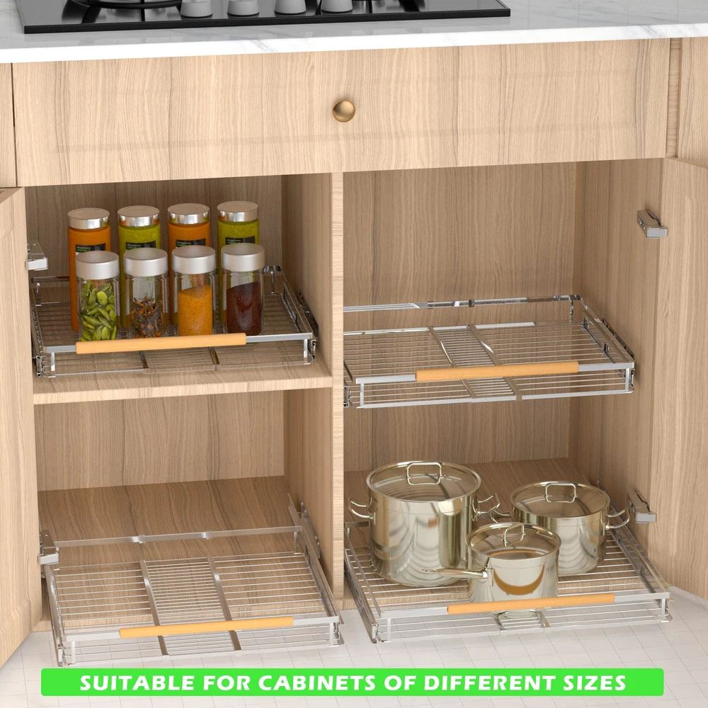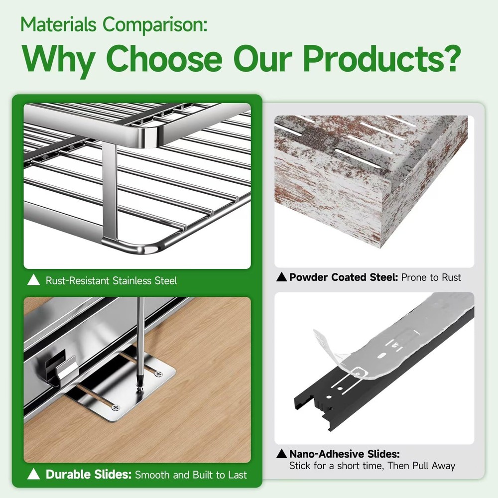EXPANDABLE DESIGN: This pull out cabitnet shelf is designed to fit in most cabinets. The width of the wire basket can be adjusted from 16.2“ to 26.2”. The new expandable design gives you a better experience and saves your space SMOOTH SLIDE-OUT ORGANIZER: Industrial-grade ball bearing system ensures quiet and smooth sliding every time. Don't have to worry about noise when you pull out and push in HIGH QUALITY STAINLESS STEEL: This pull-out storage shelf is made of high quality stainless steel. Its stability and durability make it great for your kitchen, bathroom, under sink, wardrobe and pantry storage organizing EASY TO INSTALL: The slide out drawer is side-mounted. Its excellent design allows you to install it quickly. The installation height can be adjusted according to your needs. It can fit in cabinets with a width of 16.2" ~26.2 " and a depth of 17.2" BETTER CUSTOMER EXPERIENCE: Customer satisfaction is our goal. Please feel free to contact us if you require any further information