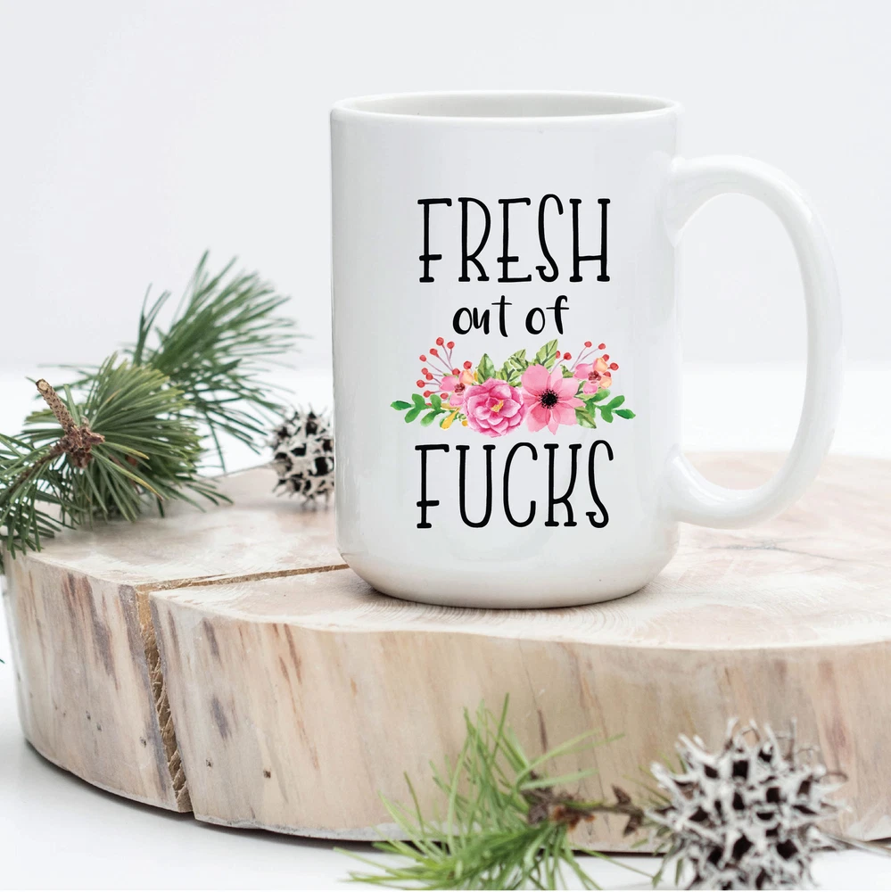 Expletive Coffee Mug Fresh Out Of F*cks Cup Product Details.. This high quality 11oz. ceramic white mug has a premium hard coat that provides crisp and vibrant color reproduction sure to last for years. Perfect for all hot & cold beverages. The highest quality printing possible is used. It will never fade no matter how many times you wash it. Material: 100% Ceramic. Print both sides. Dishwasher and Microwave Safe. High Gloss + Premium White Finish. Printed in the U.S.A. Personalized & Custom. We support personalized and custom mug to add custom, when placing an order, you can add notes to the "order note" in shipping address section. Also you can contact us directly via message. Shipping Info. Ready to ship in 1 to 2 business days, All products are made-to-order and proudly printed in the United States. Shipped by USPS and DHL, You will receive your order in 5-7 days. Replace & Refund. All products are defective during shipping broken, chipped will be replaced free of charge. You are not satisfied with the product, we will refund 100% money to you. If any other issues arise, please do not hesitate to message, we would be more than happy to assist you.