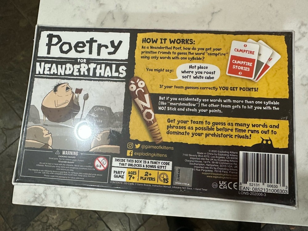 Gender:Boys & GirlsMPN:POETRY-CORE-1Game Title:Poetry for NeanderthalsType:Complete GameYear:2021Game Type:Word GameMin. Number of Players:2 playersgtin13:0852131006303Recommended Age Range:7+ yearsBrand:Exploding KittensAge Level:12-16 Years, 8-11 Years, 17 Years & UpUPC:0852131006303Theme:Strategy