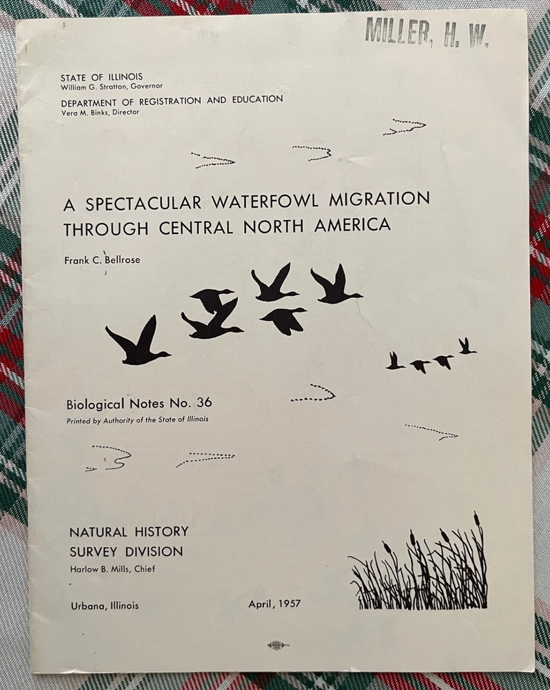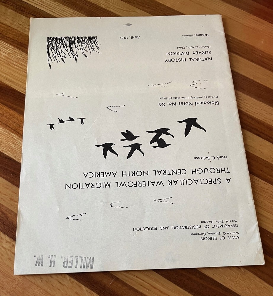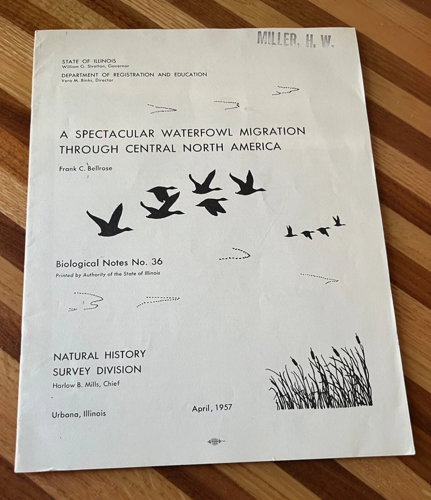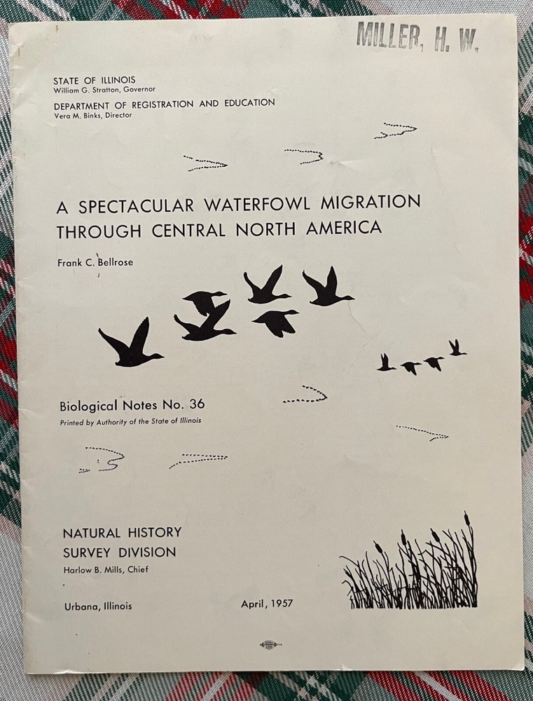 A spectacular waterfowl migration through central North America, 1957. Author is Frank C. Bellrose. Illinois Natural History Survey, Biological Notes No. 36. Paperback, Staple Bound. 24 pages. A waterfowl conservation classic. Nice condition. There is a name stamp on the front cover. Some wear (rubbing, mild staining) to the front and back cover. There is a small tear near the bottom center of the front cover and mild bending to the outer bottom corner. If additional books are purchased, I will gladly combine all into one shipment to reduce postage costs. Savings on postage will be returned to the buyer. Note that there is an additional Frank Bellrose publication listed.
