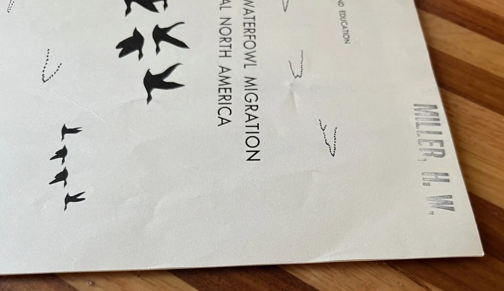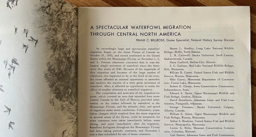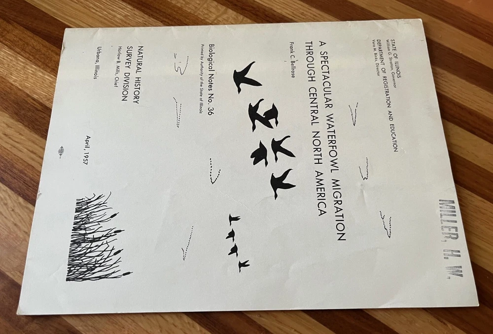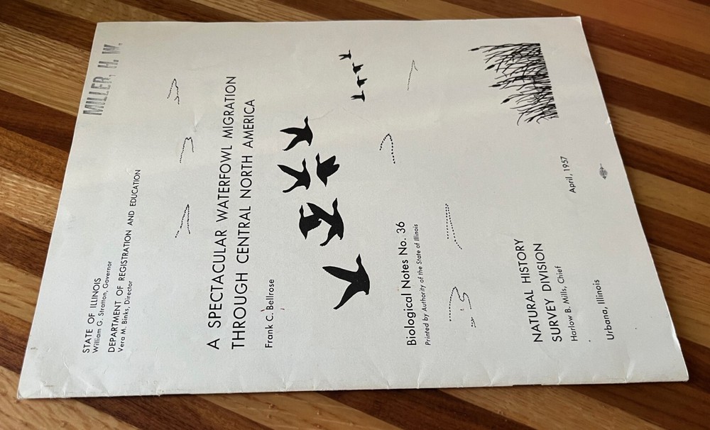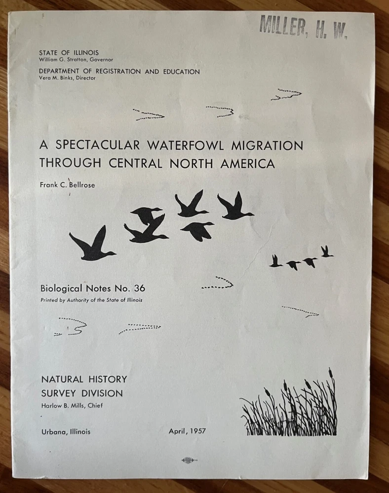 A spectacular waterfowl migration through central North America, 1957. Author is Frank C. Bellrose. Illinois Natural History Survey, Biological Notes No. 36. Paperback, Staple Bound. 24 pages. A waterfowl conservation classic. Nice condition. There is a name stamp on the front cover. Some wear (rubbing, mild staining) to the front and back cover. There is a small tear near the bottom center of the front cover and mild bending to the outer bottom corner. If additional books are purchased, I will gladly combine all into one shipment to reduce postage costs. Savings on postage will be returned to the buyer. Note that there is an additional Frank Bellrose publication listed.
