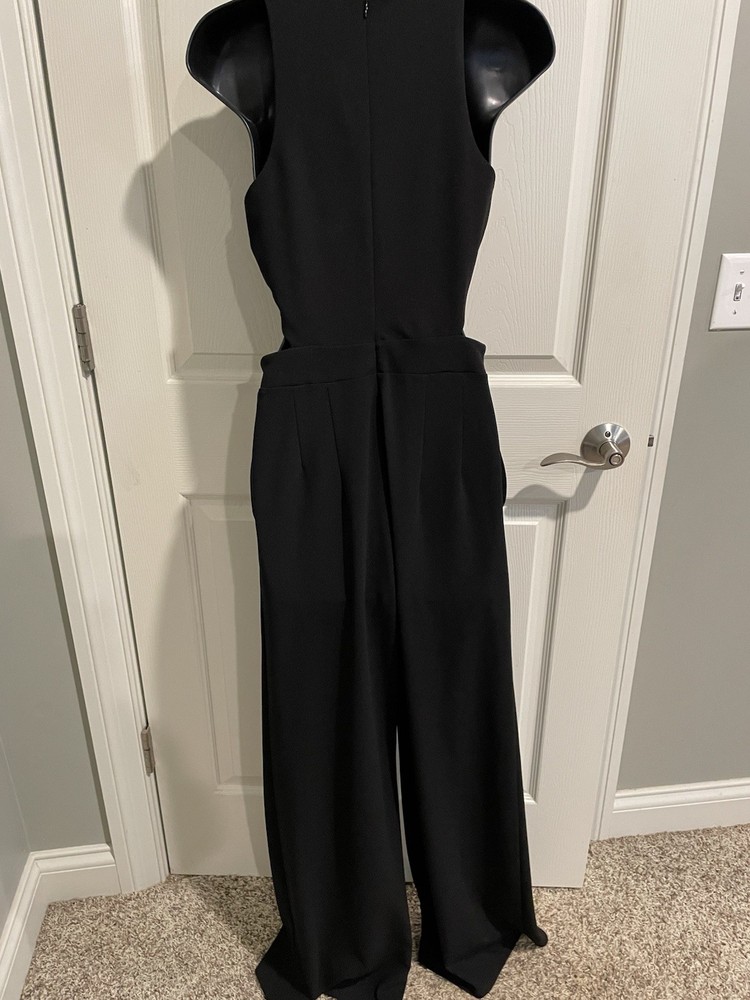 The Express Jumpsuit in women's XS size is a stylish black one-piece featuring cut-outs and a sleeveless design. Made from a blend of polyester and spandex, this jumpsuit is comfortable and flexible. The zip closure makes it easy to put on and take off, while the 34.5-inch inseam provides a sleek and flattering fit. With its solid pattern and on-trend style, this jumpsuit from Express is a perfect addition to any woman's wardrobe. 31 chest two pockets smoke and pet free home