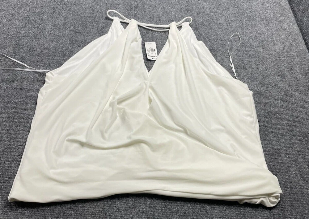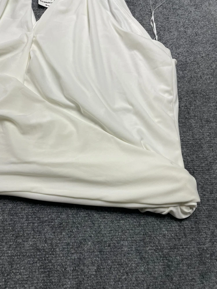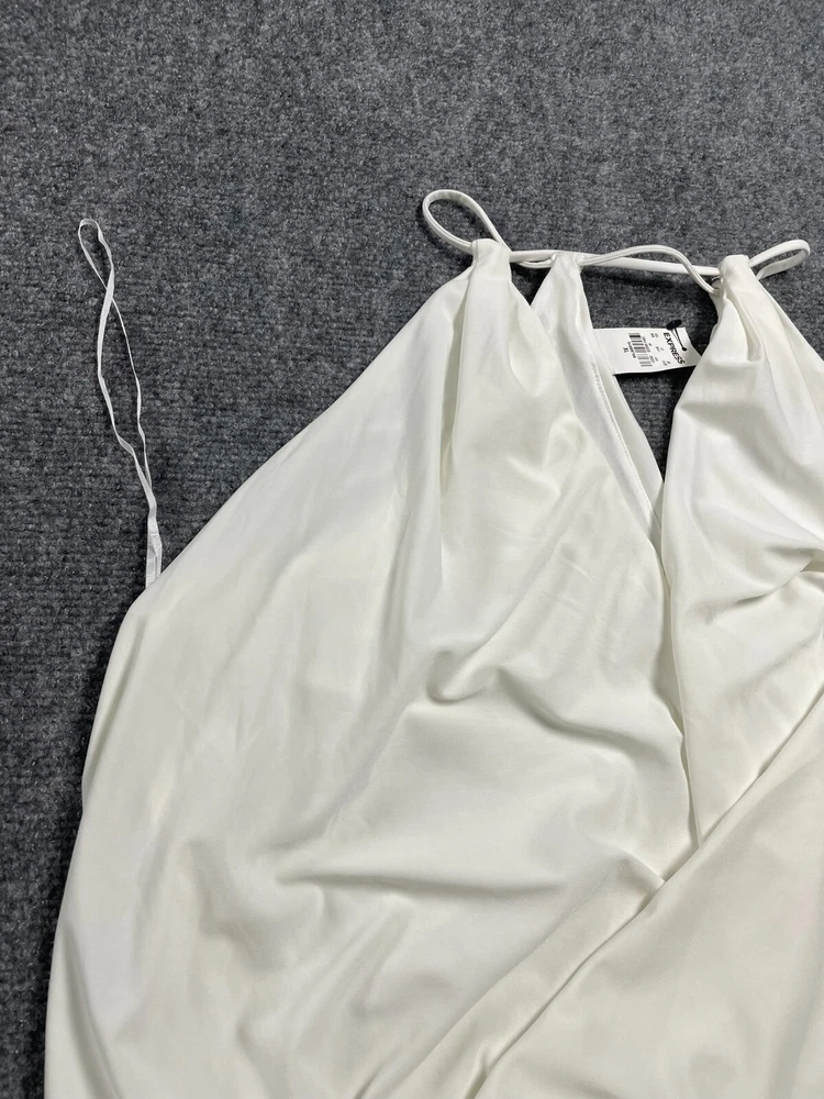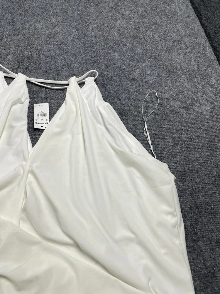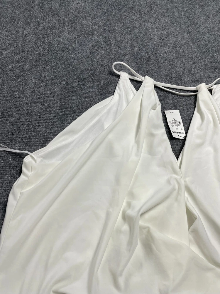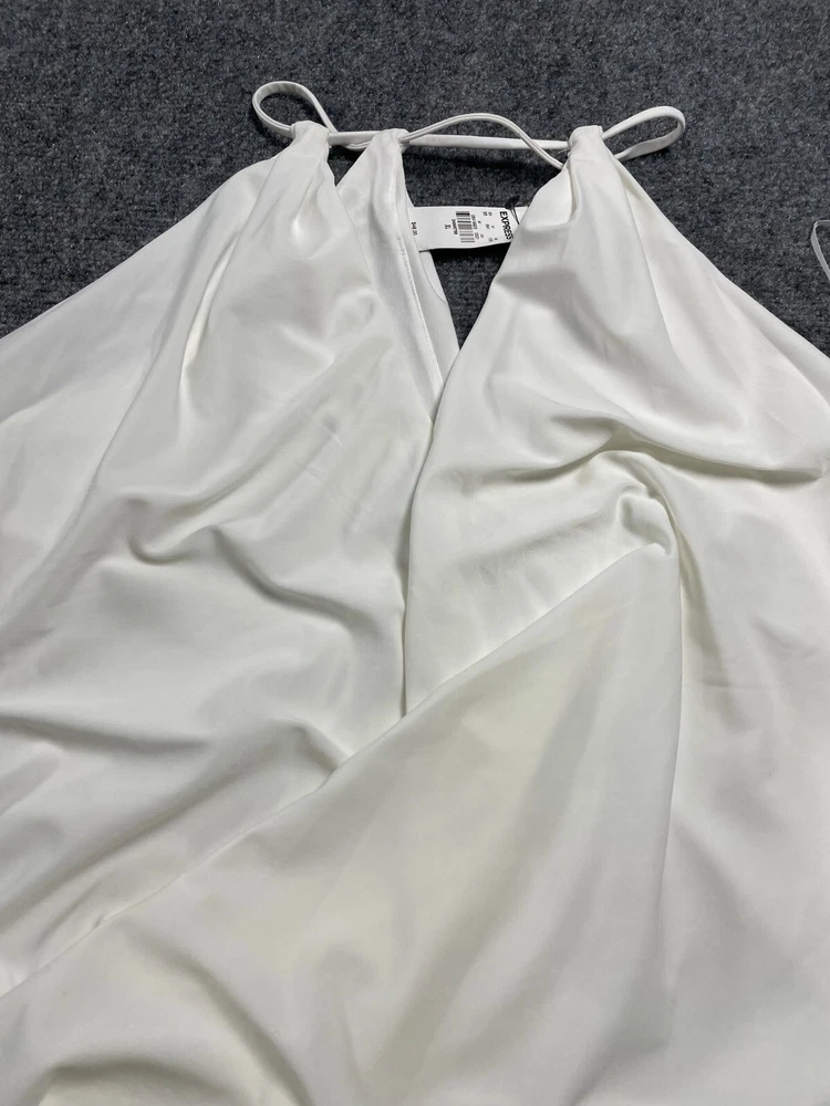 Elevate your wardrobe with this Express women's halter blouse top in a stunning white color. This soft and comfortable top features a V-neckline and pullover closure, with a sleeveless design that makes it perfect for summer, fall, or spring. The lightweight and stretchy fabric makes it easy to move in, while the satin finish adds a touch of elegance. Ideal for travel, party/cocktail, or casual occasions, this top is made of a blend of polyester and spandex, making it easy to care for with machine washable instructions. The XL size and regular fit make it suitable for any body type, while the 80s and 90s theme adds a touch of nostalgia. This blouse is a basic yet stylish addition to any wardrobe, perfect for any fashion-conscious woman.