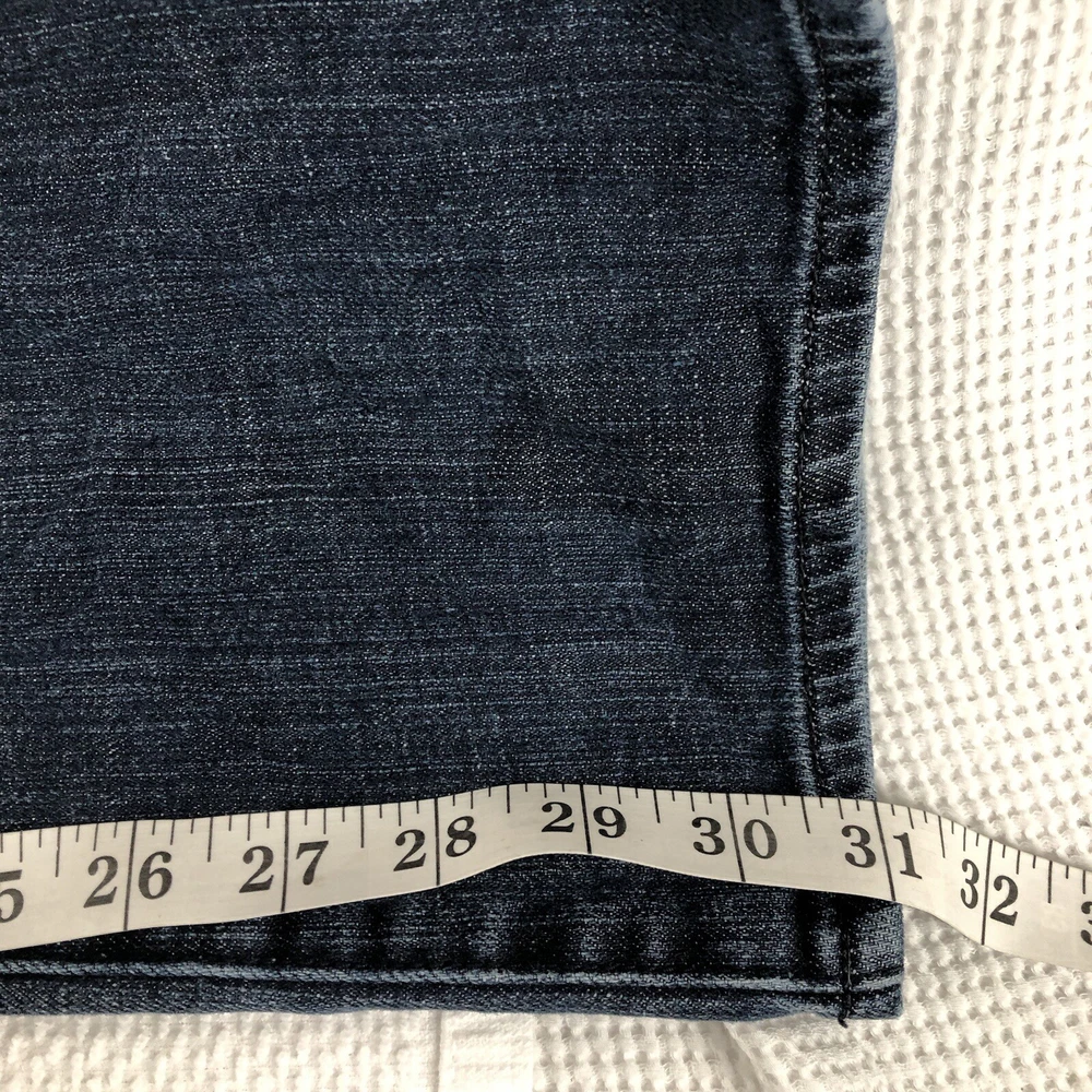 Elevate your denim collection with these Express bootcut jeans for women. The dark wash and solid pattern of these jeans make them a versatile addition to your wardrobe. The denim fabric with a touch of stretch provides comfort and ease of movement, while the button, zipper, and logo accents add a touch of style. These jeans are perfect for any casual occasion and can be paired with a variety of tops and shoes.