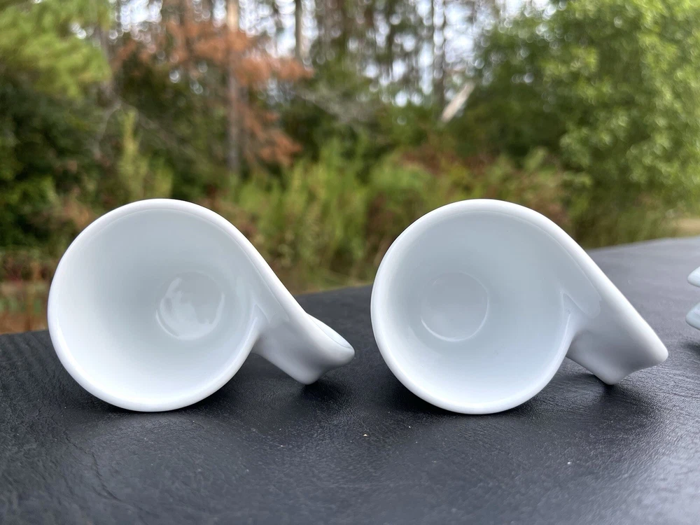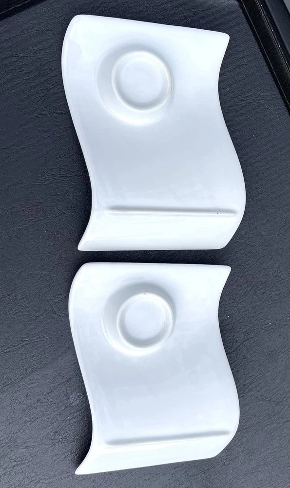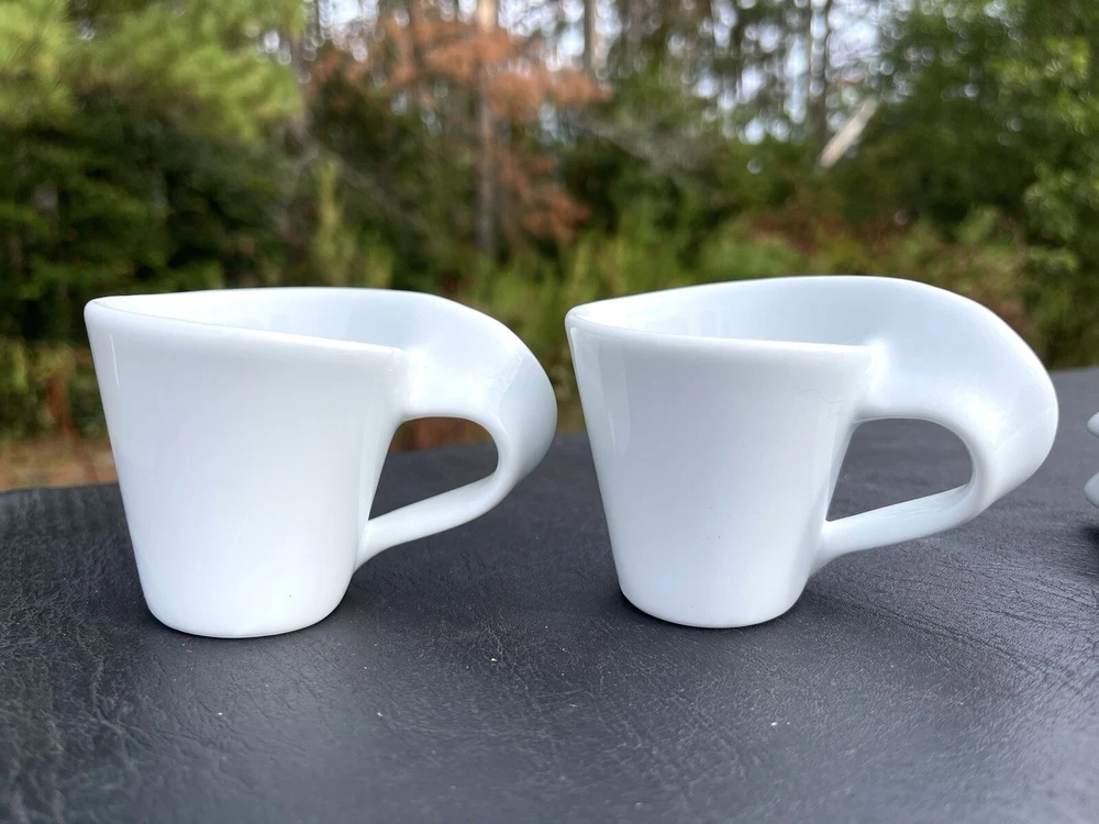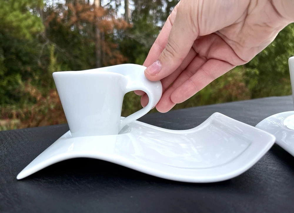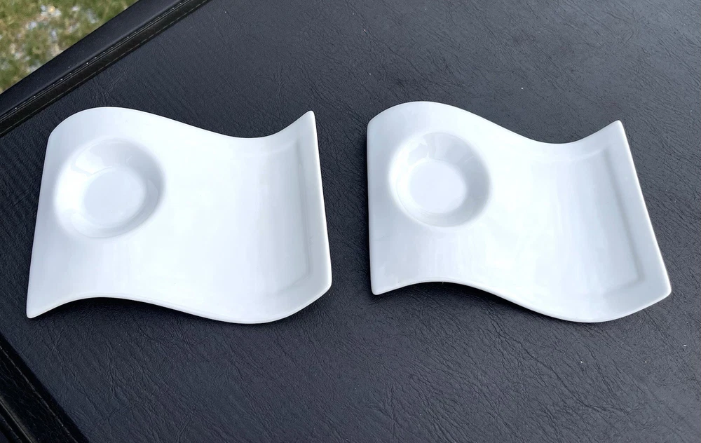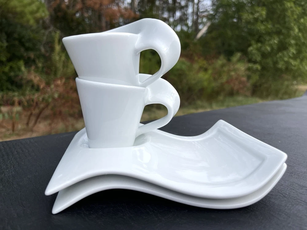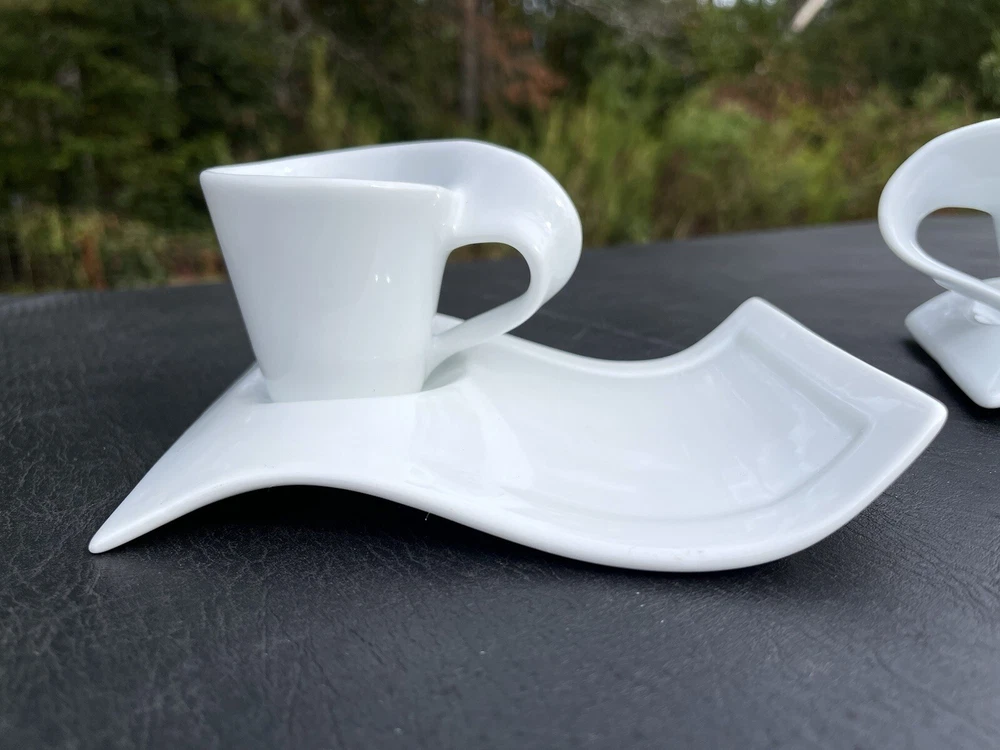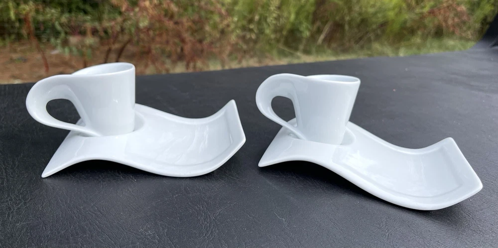 Please note: There is x2 expresso mugs and x2 wave plates only does not come with original box or paper work. They are unbranded but look identical to name brands for a great price. Good used condition no chips or cracks. Please see all photos before purchasing. Thanks for looking and supporting small business. Each wave plate measures about 6.5” long and 4.5” inches wide at the wider part of the wave Each expresso mug is 2.5” tall and has a diameter of 2.5”