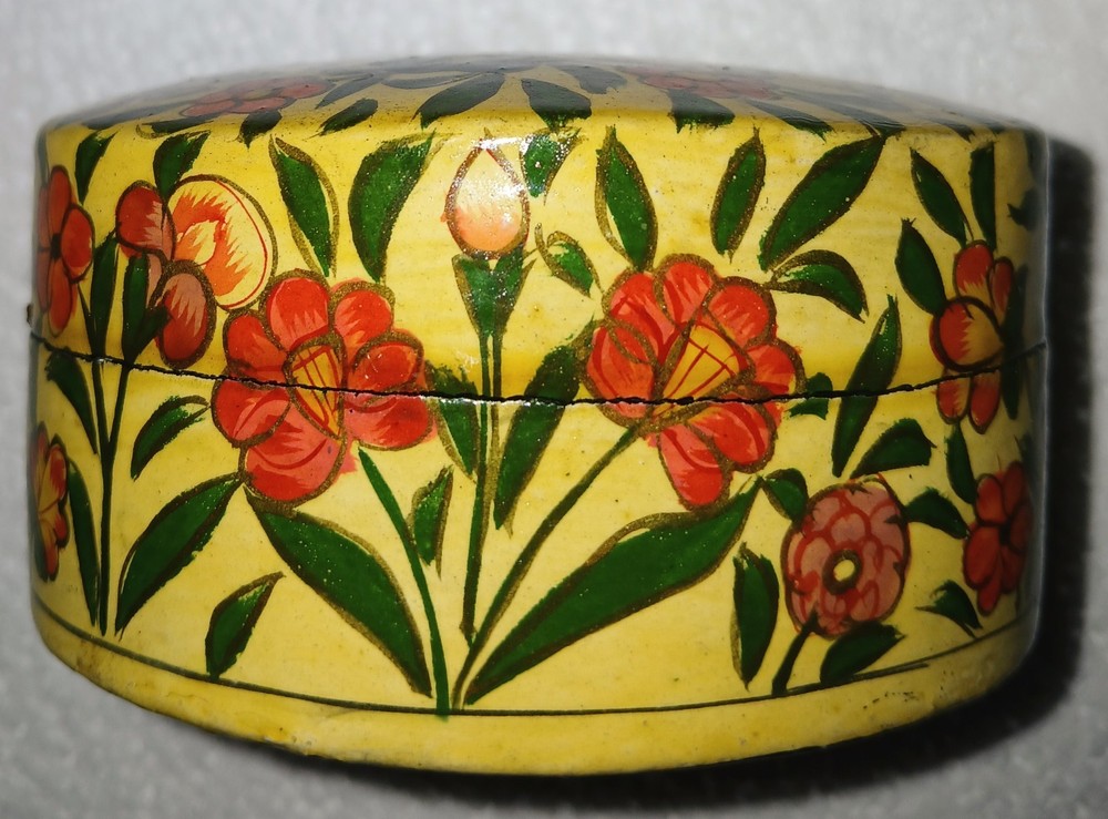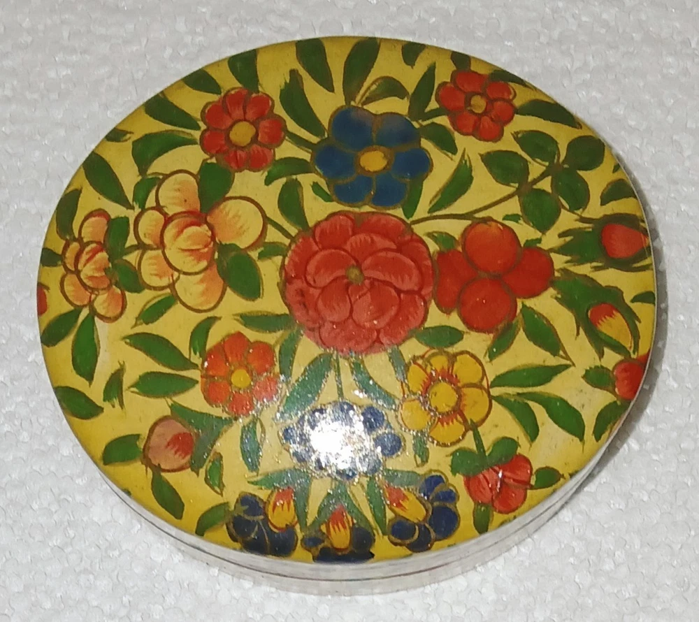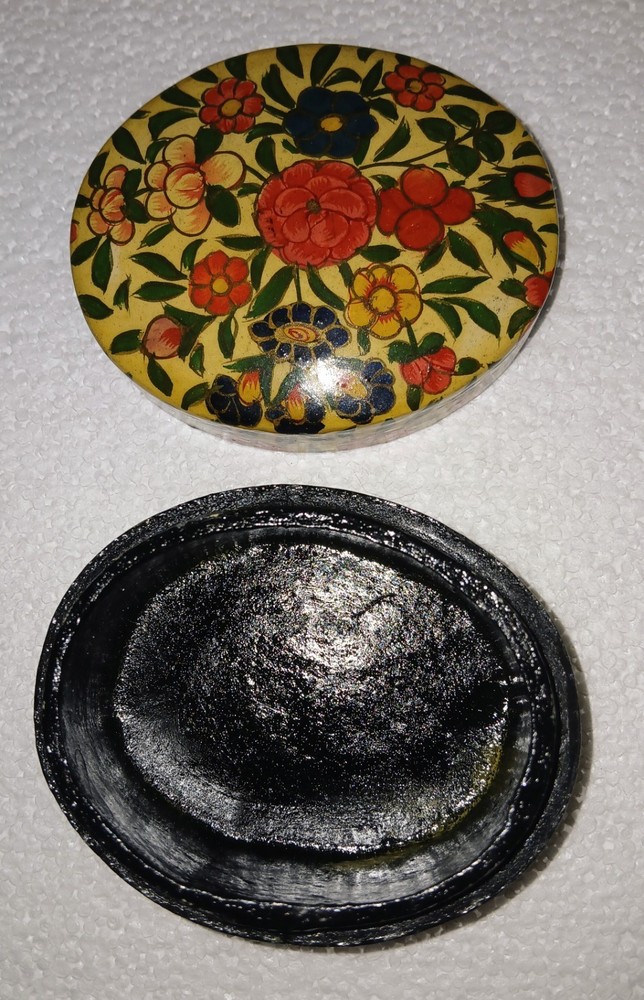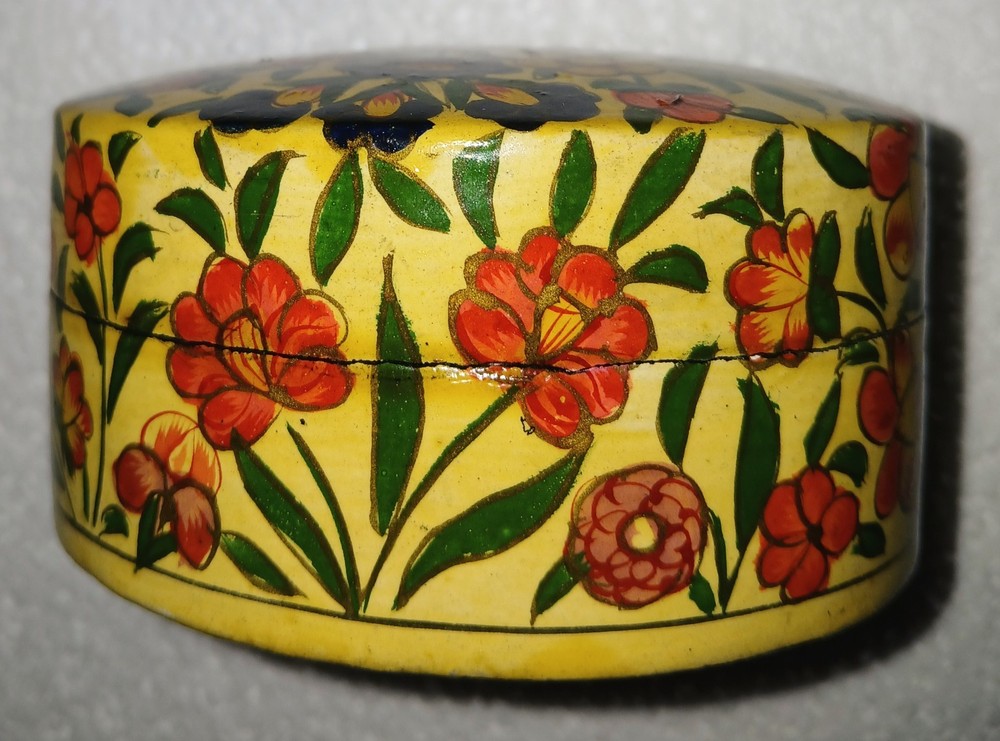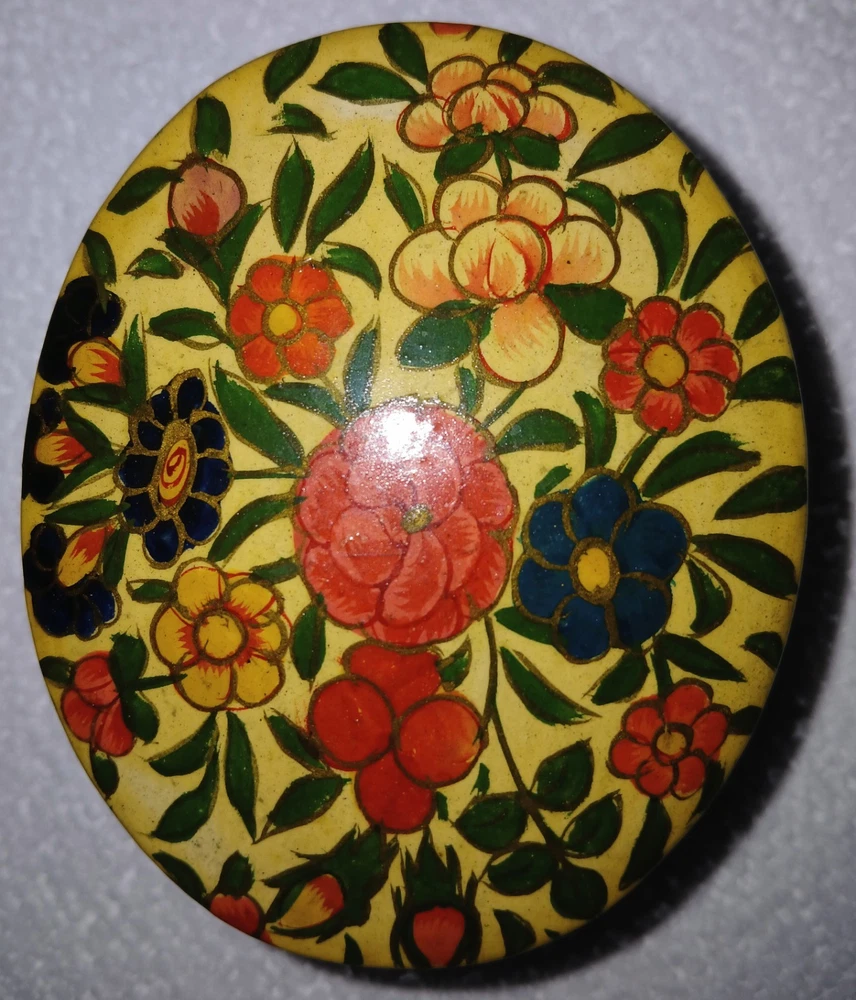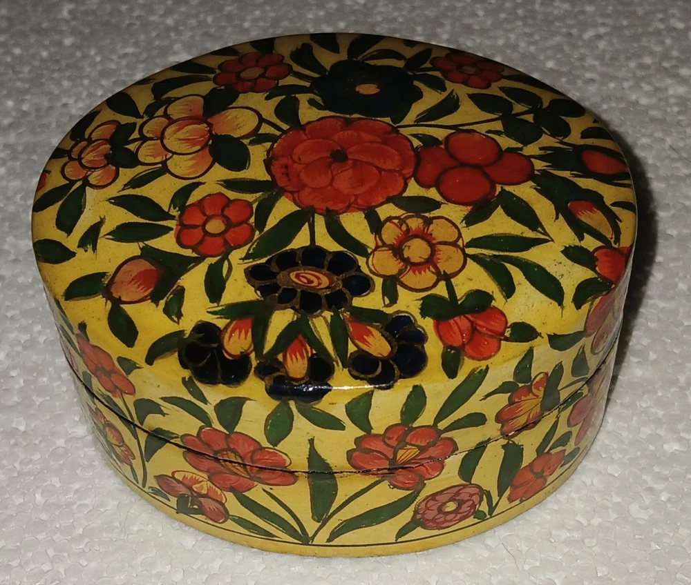 KASHMIR INDIA TRINKET BOX 1.) PLEASE CHECK THE EXPECTED DELIVERY DATES 2.) PLEASE BE PATIENT, there's a longer handling time on my auctions, but I try to ship faster... I work around chemo, dialysis and I'm mostly paralyzed so I rely on family members in their spare time for all of my shipping+ THERE IS ABSOLUTELY NO WHITE ON THIS PIECE, ANY AND ALL WHIT E IS GLARE 3.) KASHMIR INDIA LIDDED TRINKET BOX 4.) MEASURES 3-1/8" X 2-3/8" X 1-3/4" TALL 5.) HAND PAINTED AND LACQUERED 6.) EXCELLENT CONDITION WITH VERY BRIGHT VIBRANT COLORS 7.) I DO COMBINE SHIPPING AND ANY OVERPAID AMOUNT IS REFUNDED ***