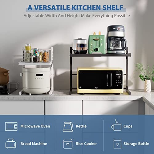 Return Policy Fast Delivery Trusted seller Extendable Microwave Oven Rack Adjustable Microwave Stand Kitchen Counter Shelf Kitchen Countertop Organizer Microwave Shelf 2 Tier with 3 Hooks Product Description 【UPGRADED HEIGHT ADJUSTMENT】 Our microwave stand has been upgraded to include 10 levels of height adjustment, making height adjustments simple and hassle-free. Forget cumbersome screws of the past, easily adjust the height by clamping the storage board on the corresponding snaps. 【FLEXIBLE WIDTH】This microwave shelf has a flexible width that can adjust between 14.48-23.62 inches (36.8-60cm). Coupled with its adjustability in height, it is the perfect space-saving solution for your kitchen. 【Premium Material】Our kitchen counter rack stands out for its high-quality carbon steel material, making it practical, stain-resistant, wear-resistant and rust-proof. You won't be disappointed with its sturdy construction. 【STRONG BEARING CAPACITY】Capable of supporting up to 132lbs (60kg), this countertop shelf can hold various items such as microwave ovens, coffee makers, air fryers, bread maker and so much more. We provide 3 complimentary hooks for extra storage and easy access to your kitchen tools. 【EASY INSTALLATION】 No need to worry about complicated procedures or drilling holes with this shelf. Our female customers reported a 20-minute installation time on average. If you encounter any issues, please contact us through and we will promptly assist you within 24 hours(You can contact us through or find our after-sales support email by entering the store). Shipping Returns Payment Shipping Shipping is FREE to all addresses other than APO/PO boxes in the lower 48 states. All our stock ships from US-based warehouses. Shipped via USPS or UPS (depending on location and package weight) Unless stated otherwise, all orders will ship within 24-72 hours of your payment being processed. Check our feedback to see the great reviews of FAST shipping we offer. Returns Seller does not accept returns Payment We currently accept payment via eBay managed payments only. Once payment is cleared, we will dispatch your shipment within 1-3 business days. Please refer to the "Shipping" tab for more information regarding shipping speed to your destination.