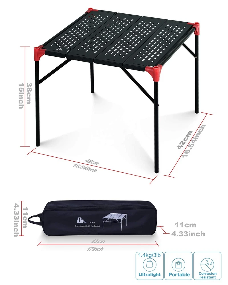 gtin13: Does not apply Weight: 3.33 Pounds Part Number: Ic704 Base Color: Black Package Dimensions LxWxH: 17.63x6.93x4.13 Inches Number Of Boxes: 1 Included Components: Ripstop Carry Bag Color: Black Unit Count: 1.0 Is Foldable: Yes Brand: Iclimb Frame Material: Aluminum Size: S + Hanger Batteries Included?: Yes Top Material: Aluminum Material: Aluminum Maximum Weight Recommendation: 66.0 Table Design: Picnic Table Age Range Description: Adult Item Shape: Rectangular Model Number: Ic704 Style: Modern Indoor Outdoor Usage: Outdoor Top Color: Black Furniture Finish: Black UPC: Does not apply Base Type: Leg Type: Does not apply Pattern: Solid Specific Uses For Product: Camping, Backpacking, Hiking, Traveling, Motorcycling, Beach Care Instructions: Wipe With Damp Cloth