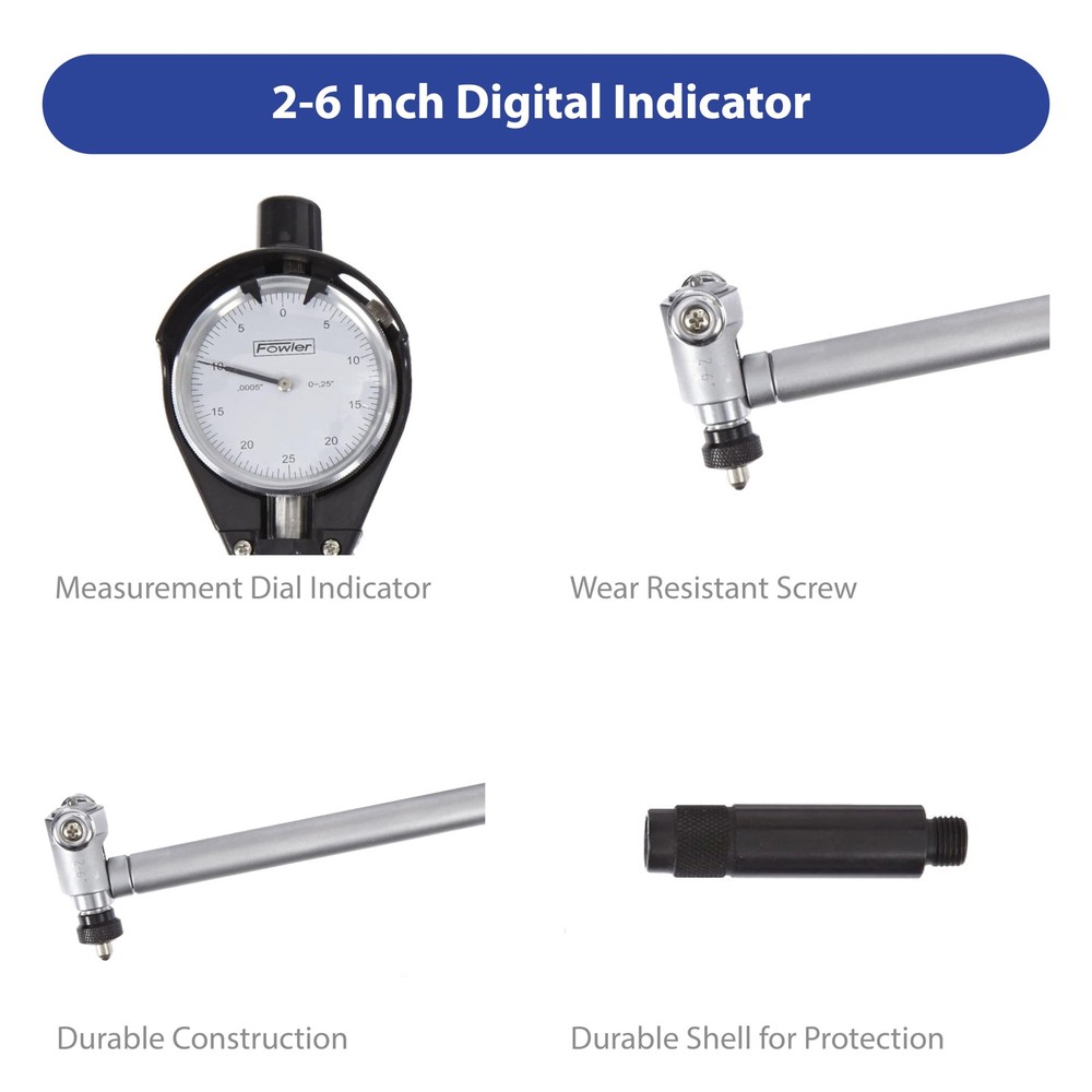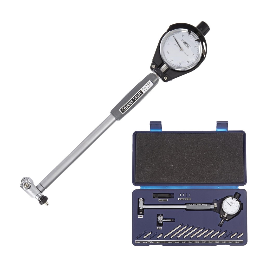 Cylinder Dial Bore Gage with carbide tipped anvils has a measurement range of 1.4 to 6 ". This product has a 1-year warranty offered by High Precision. Bore gages measure holes, or bores, in a workpiece. They can measure the interior diameter of a hole at any depth (within its reach), while internal micrometers can only measure to the depth of their contacts. Bore gages are typically calibrated with a setting ring and come in two types: simple and direct measuring. Simple bore gauges are used with a caliper to transfer the hole measurement, while the more complex gauges take the measurement directly and display it through a vernier, dial, or digital display. Bore gages have a two- or three-point contact, indicating how many points on the gage head touch the inside of the bore. Two-point contacts are better at measuring ovality, while three-point contacts are used to measure lobing or triangular form error. Pistol-grip bore gages are used for fast, single-handed operation with repeatable results from one operator to another. Bore gages can also be used in special applications, such as measuring threads, spline pitch diameters, and deep bores. , an American company, manufactures premium inspection and measurement instruments like electronic indicators, calipers, bore gages, and micrometers. The company, founded in 1946, is headquartered in Newton, MA. ACCURATE MEASUREMENTS: This bore gage features a dial indicator with a graduations of 0.0005" and a measuring depth of 9.5" EXTENDED RANGE: This 1.4-6" range bore gage, with a two-point contact system, is used for measuring hole diameters and also to detect geometry abnormalities such as ovality and taper; carbide-tipped anvil contact points provide extended wear and improved abrasion resistance SELF CENTERING: The easily adjustable bore gauge is self-centering for fast, accurate measurements EASY AND EFFICIENT: This bore gage comes with an insulated grip and a chrome plated handle for easy use. SET INCLUDES: Set comes with two self-centering measuring heads, an extension holder, spacers, and a fitted case