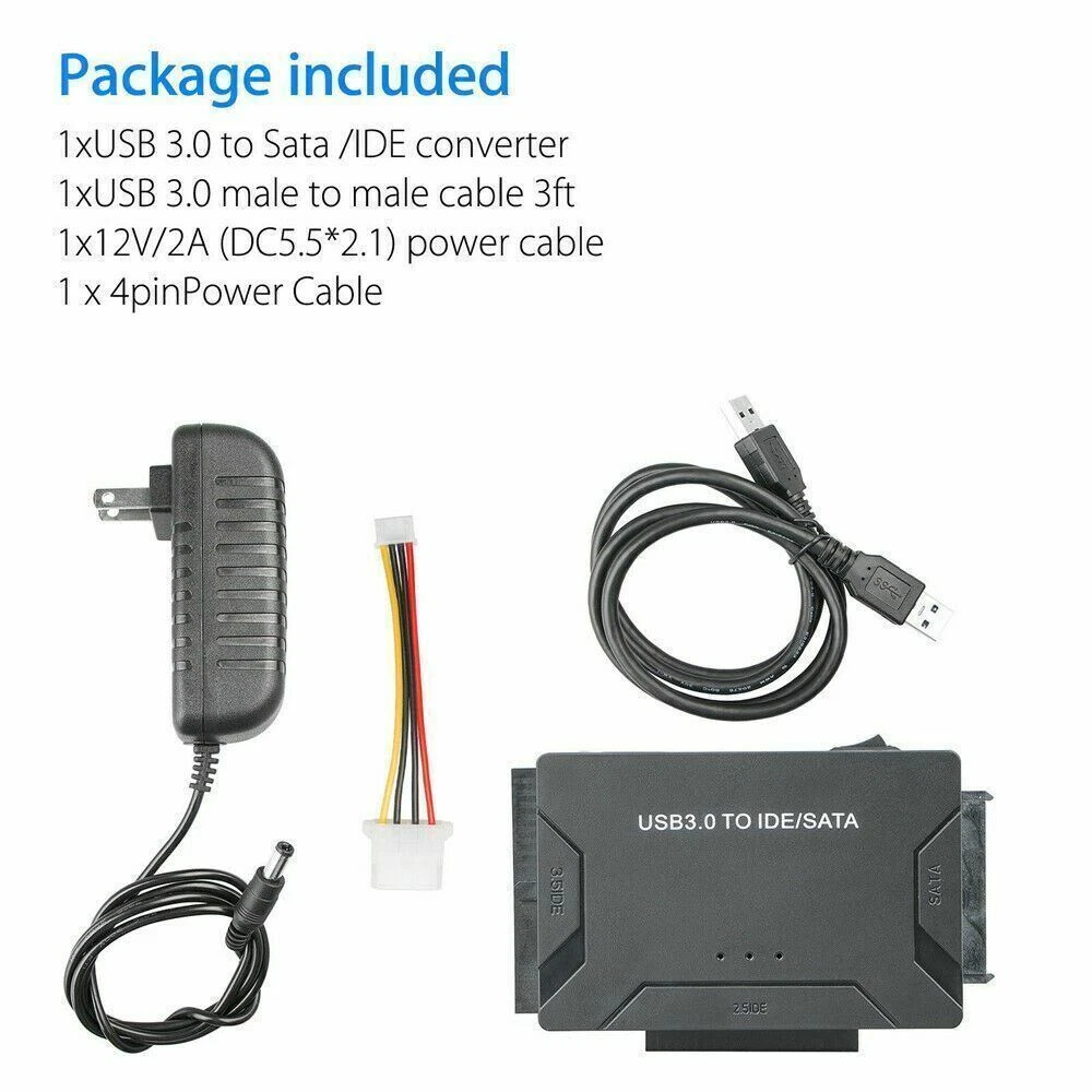 Product Features Get All Your Drives Active Combo's 3.0 to SATA IDE Converter allows you to connect 2.5"/3.5" IDE/SATA hard disks through USB port to the computer. This is a 2. perfect tool to duplicate, copy, backup or transfer large amounts of data from one drive to another. It has a SATA II connector and two IDE connectors (40pin and 44pin). Access to 3 Drives Simultaneously: This USB SATA adapter enables access to all three HDD drives simultaneously or file transfer among the 3 drives. It supports 2.5"/3.5" SATA HDD and SSD; 2.5"/3.5" IDE HDD; DVD-ROM, CD-ROM, CD-RW, DVD-RW, DVD + RW. Superb 5 Gbps Transfer: With USB 3.0 interface, data transfer rates up to 5 Gbps. The USB 3.0 interface is also backwards compatible with USB 2.0 / 1.1. Huge Capacity Supportive: Up to 4TB capacity of the drives supported. The LED indicator of the USB to SATA IDE adapter can monitor the working status. Plug and Play, easy to use. Wide Compatibility: This IDE SATA Adapter is universally compatible with Windows 10/ 8.1/ 8/ 7/Vista/XP, Mac OS 9/ 10, Linux etc. Supports drives with a capacity of up to 4TB. Support speed up to 5Gbps. Backward compatible with USB 2.0/1.1. On/Off Switch for HDD protection. Type Adapter/Converter Supported Drives 2.5"/3.5" SATA HDD/SSD; 2.5"/3.5" IDE HDD; DVD-ROM, CD-ROM, CD-RW, DVD-RW, DVD+RW Compatible Systems Windows8/7/10/Vista/XP/Mac OS 9/10/Linux Power Supply DC 5V/2A for 3.5" devices Features LED activity indicator, Plug & Play, reliable and stable Converter Size 3.93x2.36x0.59 in (100x60x15mm) Net Weight 8oz (226g) Package Weight 9.29oz (264g) Package includes: 1 x USB 3.0 to SATA/IDE converter 1 x USB 3.0 male to male cable 3ft 1 x 12V/2A (DC5.5*2.1) power cable 1 x 4pin Power Cable On Feb 28, 2024 at 02:43:13 PST, seller added the following information:
