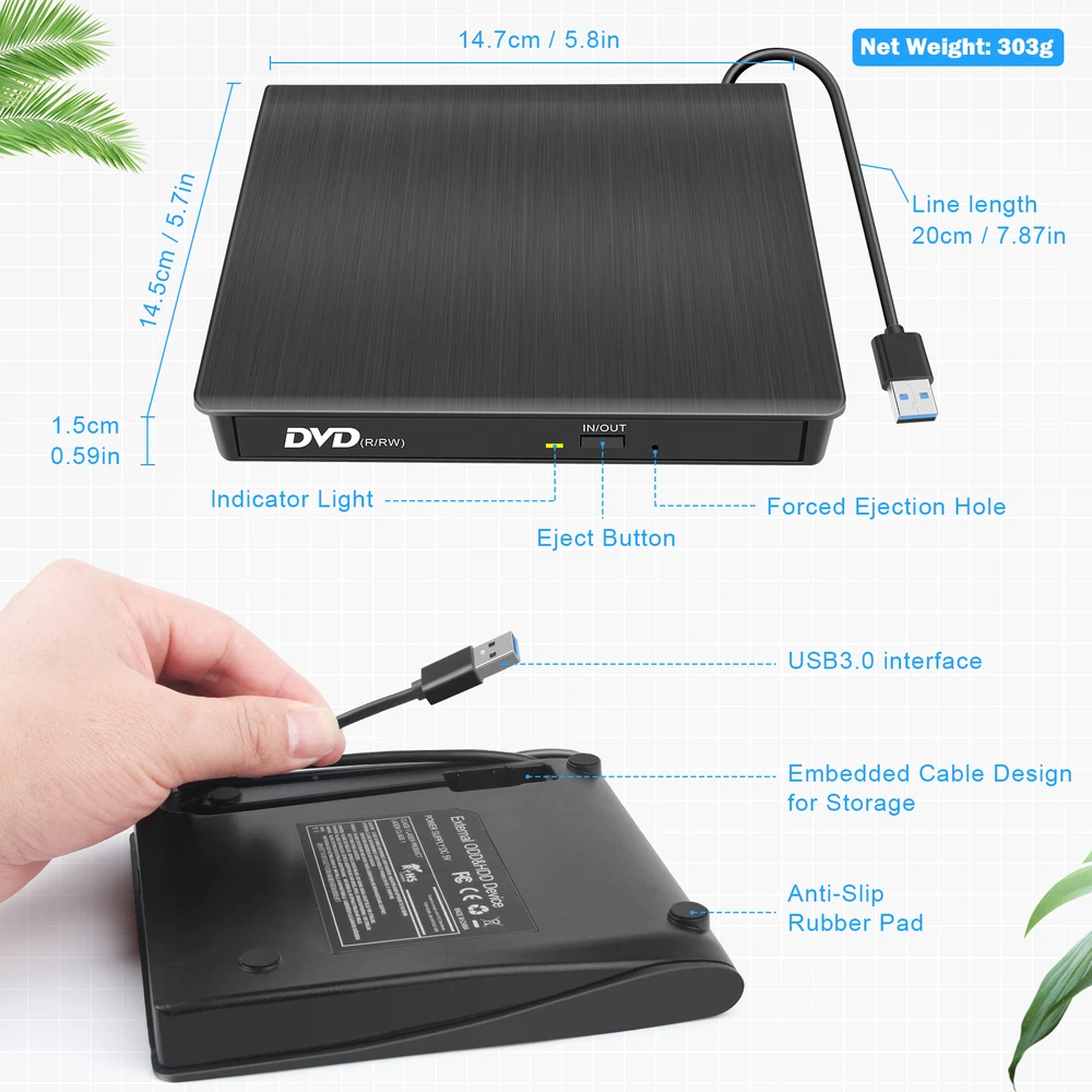 External USB 3.0 DVD RW CD ROM Writer Drive Burner Reader Player For Laptop PC Slim External USB 3.0 DVD RW CD Writer Drive Burner Reader Player For Laptop PC Features: USB3.0 External Slot in USB CD DVD Drive / Burner for PC, mobile PC and Laptop via USB 2.0/3.0 USB interfaceplug and play. Compatible with Windows 98 SE, ME, 2000, XP, Vista, Win 7, Win 8, Win 10, Windows Server 2003, 2003 R2, 2008, 2008 R2, 2012, 2012 R2, Mac OS 8.6, Mac10 OS, 2015 27" retina iMac, Macbook Pro with OS 10.10.5, Macbook Air version 10.9.5, iMac with el capitan - os x 10.11, Surface Pro No need to install the driver program, support plug and play. USB3.0 transmission standard, backward compatible with USB2.0 and USB1.1 data transmission speed stability, up to a maximum of 5Gbps. The data cable adapt the design of embedding into product, the impedance of pure copper mesh technology is low, Shield is strong, data transmission is more stable. Specifications: Color: Black Size: 5.7" x 5.5" x 0.6" Material: Aluminum alloy + Plastic Port: USB 3.0 USB cable length: 23cm Cache: 2MB Voltage: DC 5V Compatible: Windows 98 SE, ME, 2000, XP, Vista, Win 7, Win 8, Win 10, Windows Server 2003, 2003 R2, 2008, 2008 R2, 2012, 2012 R2, Mac OS 8.6, Mac10 OS, 2015 27" retina iMac, Macbook Pro with OS 10.10.5, Macbook Air version 10.9.5, iMac with el capitan - os x 10.11, Surface Pro Supported disc formats: DVD-RAM, DVD-R, DVD-RW, DVD+R, DVD+RW, CD-R, CD-RW, CD-ROM Reading speed: DVD-ROM 8x ;CD-ROM 24x; Burning speed: DVD-R,DVD+R 8X;DVD-RW 4X;CD-R 24x Payment Delivery details Terms of sales About us Contact us Payment We accept payment via PayPal, Visa, Mastercard, Apple Pay, Google Pay etc. Delivery details Shipping time Item located in California and New Jersey of Unites States of America, there are 2 warehouses. Usually, delivery time less than 7 days in California. Except holiday, weekend, weather delay etc. Other states in U.S.A, the whole shipping time may be in 7 to 15 working days. Package sent from which above warehouse according to inventory stock quantity , and post address distance. Send us eBay message if you have shipping time request before you pay, such as send item through other shipping methods. The whole shipping time is an estimated time, it may be different with actual situation. Hope you understand and be patient. 1 to 3 days shipment Currently, delivery successful in California Only. Other states in U.S.A, it may be later delivery in 3 days. Hope you consider carefully before select this shipment. No freight refund, but provide coupon as remedy. ivery detailsy details Terms of sales Order cancellation At purchase history , find paid order and send cancel request. Usually, request would be agree in 24 hours. Item sent , request failed. Let seller know your request through eBay message, try decline package , or ask seller send return label, or provide other better solution. Revised address We only accept shipping address at PayPal's account, per your and ours account security demand. It is better revised your new address at PayPal account, before you made payment. Bother you send eBay message to us, if you forget revised. It may be our service officer is rest. If you have not received our reply in time, accept our apologies sincerely. Replacement We accept 30 days return and refund request, after you get item. You would get a brand new item, or refund full payment, if item is defective. It is better hassle return request through eBay message, and provide photo at message.. We set eBay automatically respond to return request, it may be cause eBay solution is not your and our expected. For example, you want replace item, eBay asked buyer return and refund. Exchange Send eBay message to us, it is better provide photo at message. you would get correct item finally, get return label after exchange, bother you help us return this wrong item. About us All item passed FCC / CE / ROHS certificates. Help buyer reduce the risk of damage, fire, dangerours mostly. We work with a good quality OEM supplier and factory. Help you and us save money greatly. Review / Feedback Please leave Positive Feedback and 5 Star Ratings for us if you are satisfied with our products and service, and we will do the same for you. For any problem, pls do not leave us negative feedback before email us, we sincerely hope every customer can provide a chance for us to solve the problem. Your Satisfaction is our highest priority. Pls contact us if you have any questions, we will try our best to serve for you. Contact us For full details about the warranty, please email us.Please help us do not open the dispute or return request before e-mail us.For any questions, pls also feel free to email us, we will reply you within 1 business day. (not include Public holiday)