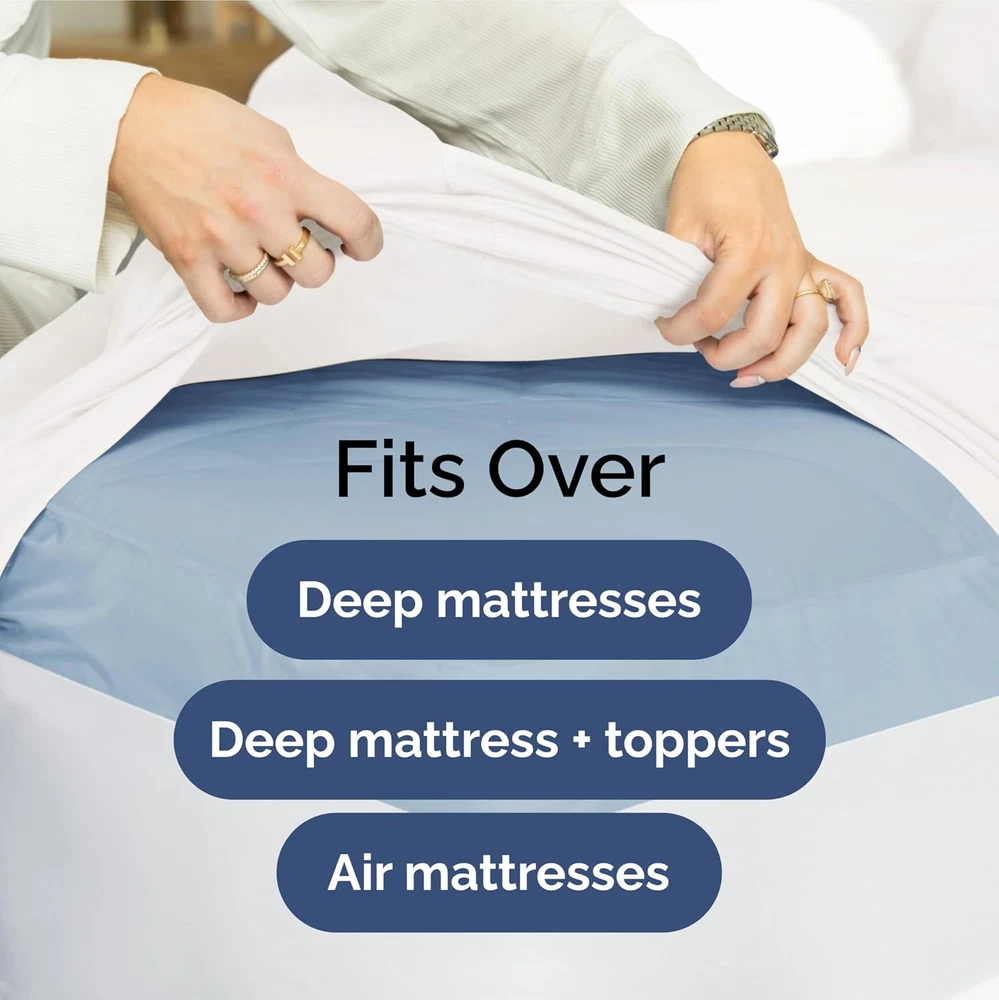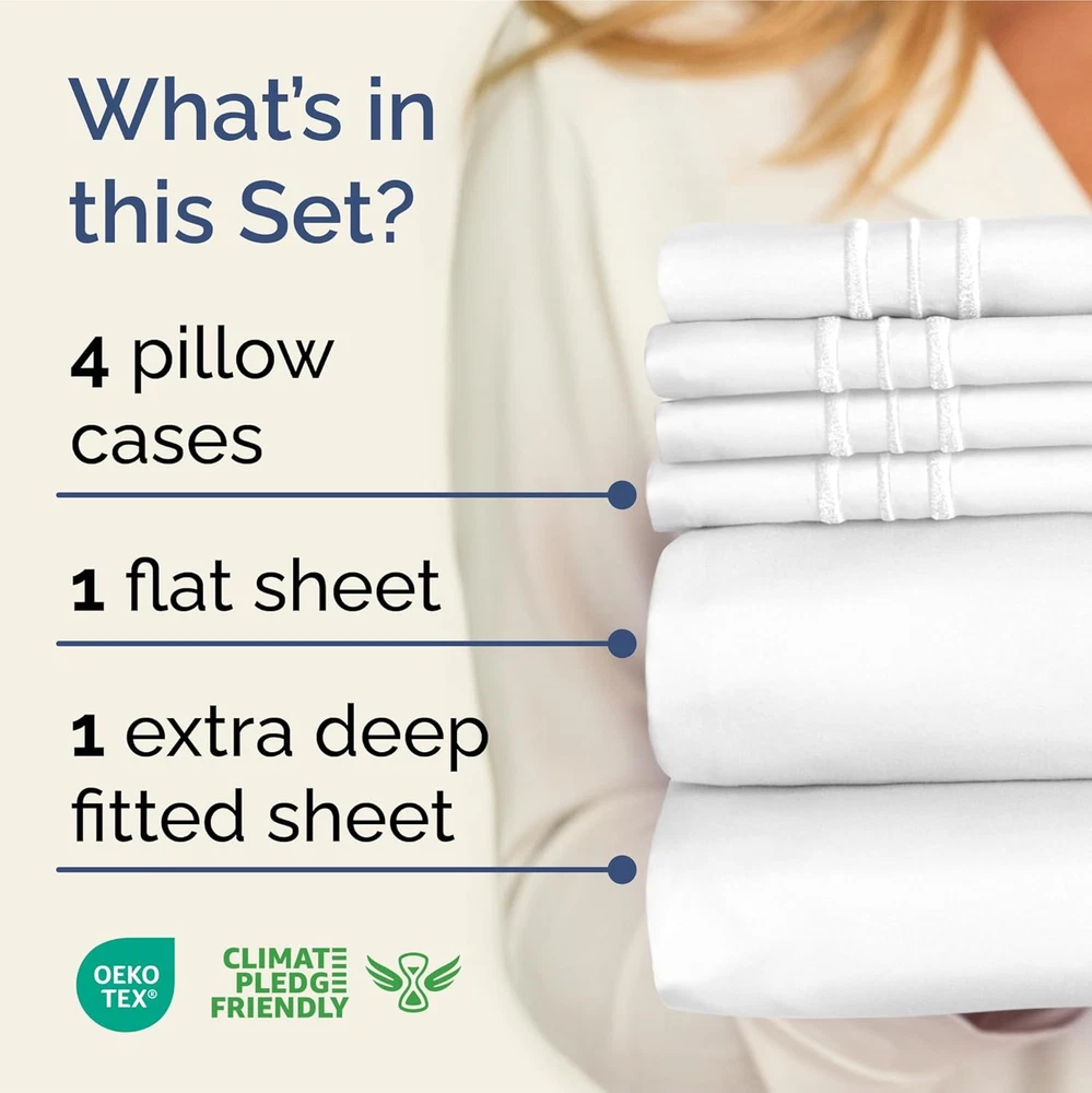Store New Arrivals Add to Favorite View Feedback Contact Fast deliveries to the customer's home Quality customer service John Make the customers happy! Extra Deep King Sheet Set - 6 Piece Breathable & Cooling Sheets - Hotel Luxury Bedding Set W/18-24 Inch Extra Deep Pockets - Easy & Secure Fit - Super Soft, Wrinkle Free and Comfy - White, King Size Description EXTRA DEEP POCKET KING SHEETS / EXTRA DEEP FITTED KING SHEETS: These bed sheets are for very deep pocket mattresses. They fit any mattress with pockets that are 18, 20, 21, 22 and 24 inches deep. There's stretchable elastic around the extra deep fitted sheet which stretches for a nice tug around your mattress. Perfect for extra tall & large mattresses. Rest assured these oversized sheets will stay on tight & stay in place! 6 PIECE SHEET SET: This bed sheet set comes with 4 pillowcases total all with a beautiful decorative embroidery design on each pillow case. The pillow cases have enclosure designs. This bedding set will accommodate your extra thick mattress perfectly. GREAT FOR DOUBLE PILLOW TOP MATTRESS: These bed sheets are perfect for mattresses with a 3 inch or 4 inch topper on top, memory foam toppers, big mattress pads, pillow tops, foam toppers, big foam toppers, pillow top mattresses and memory foam. These sheets will not come off. MICROFIBER: These are the softest type of microfiber bed sheets we have created. Super soft with a light feel. Not crisp like cotton. If you're accustomed to cotton sheets and you've never tried microfiber sheets we recommend you give these a try. They're even softer than cotton! DIMENSIONS & SIZES: Flat Sheet 111 wide and 102 long. Fitted sheet 78 wide and 80 long with 21 inch pockets (has elastic so it can stretch). All four pillow cases are oversized 20 x 40 inch. Product Description The video showcases the product in use. The video guides you through product setup. The video compares multiple products. The video shows the product being unpacked. Shop the CGK Linens catalog of luxury bedding products Add to Cart Add to Cart Add to Cart Add to Cart Customer Reviews 4.4 out of 5 stars 82,954 4.6 out of 5 stars 44,995 4.4 out of 5 stars 3,108 4.6 out of 5 stars 31 Price $59.99 $ 59 . 99 $13.99 $ 13 . 99 $39.99 $ 39 . 99 $192.00 $ 192 . 00 Fits Sizes 18 to 24 Inch Mattress 30" Length x 19" Height Twin, Full, Queen, King 18 to 24 Inch Mattress Triple Embroidered Pillowcases Triple Embroidered Triple Embroidered X Triple Embroidered Envelope Enclosure Pillowcases Envelope Enclosure Envelope Enclosure X Envelope Enclosure OEKO-TEX Certified Yes Yes Yes Yes Product Care Machine Wash Machine Wash Machine Wash Machine Wash Wrinkle Proof Yes Yes Yes Yes Fade Proof Yes Yes Yes Yes Stain Proof Yes Yes Yes Yes Item model number 21InchKingWhite Style 21Inch 6 Pcs Sheet Set Pattern Solid Country of Origin China Theme Solid Number of Pieces 6 Unit Count 1 Count Pillowcase Quantity 4 Material Polyester Age Range (Description) Adult Seasons All Is Discontinued By Manufacturer No Package Dimensions 12.44 x 10 x 4.53 inches Closure Type Pull-On Item Weight 4.13 pounds Special Feature Wrinke-Free, Hotel-Quality Color 01 - White Thread Count 200 Included Components 4 Pillowcases, Fitted Sheet, Flat Sheet Product Care Instructions Machine Wash Size King ABOUT US We offer the best prices around on high quality products. Our E-store includes media such as books, movies, music and games while offering electronics, toys, sporting apparel, clothing, tools, general home, garden items and more. SHIPPING We are always working hard to ensure your package arrives as soon as possible. Please understand that some factors like weather, high postal traffic, and the performance of shipping companies are outside of our control. We offer free shipping to the lower 48 states and ship within 2 business days of payment, usually sooner. We do not accept P.O. Boxes. Please provide a physical address. For shipping outside of the continental USA, we only use eBay's Global Shipping Program. The item is shipped to KY and then sent to the rest of the world. International customers are responsible for all duties and taxes. Continue to 'check out' to calculate costs for shipping the item to your country. Messages regarding eBay's Global Shipping Program MUST be directed at eBay EXCLUSIVELY. RETURNS We offer a 30-Day Return Policy on items in which you are not completely satisfied with. You have the option of a full-refund or an exchange of the item. No returns are available on items shipped outside of the USA PAYMENT We accept PayPal. CONTACT US This page content is yet to come Please ad us to your favorite seller and visit again later Thank You CUSTOMER SATISFACTION We try our very best to make sure every customer is completely satisfied. If there's a problem, message us! We're happy to help. WE ACCEPT