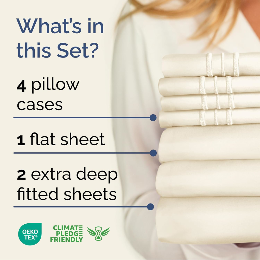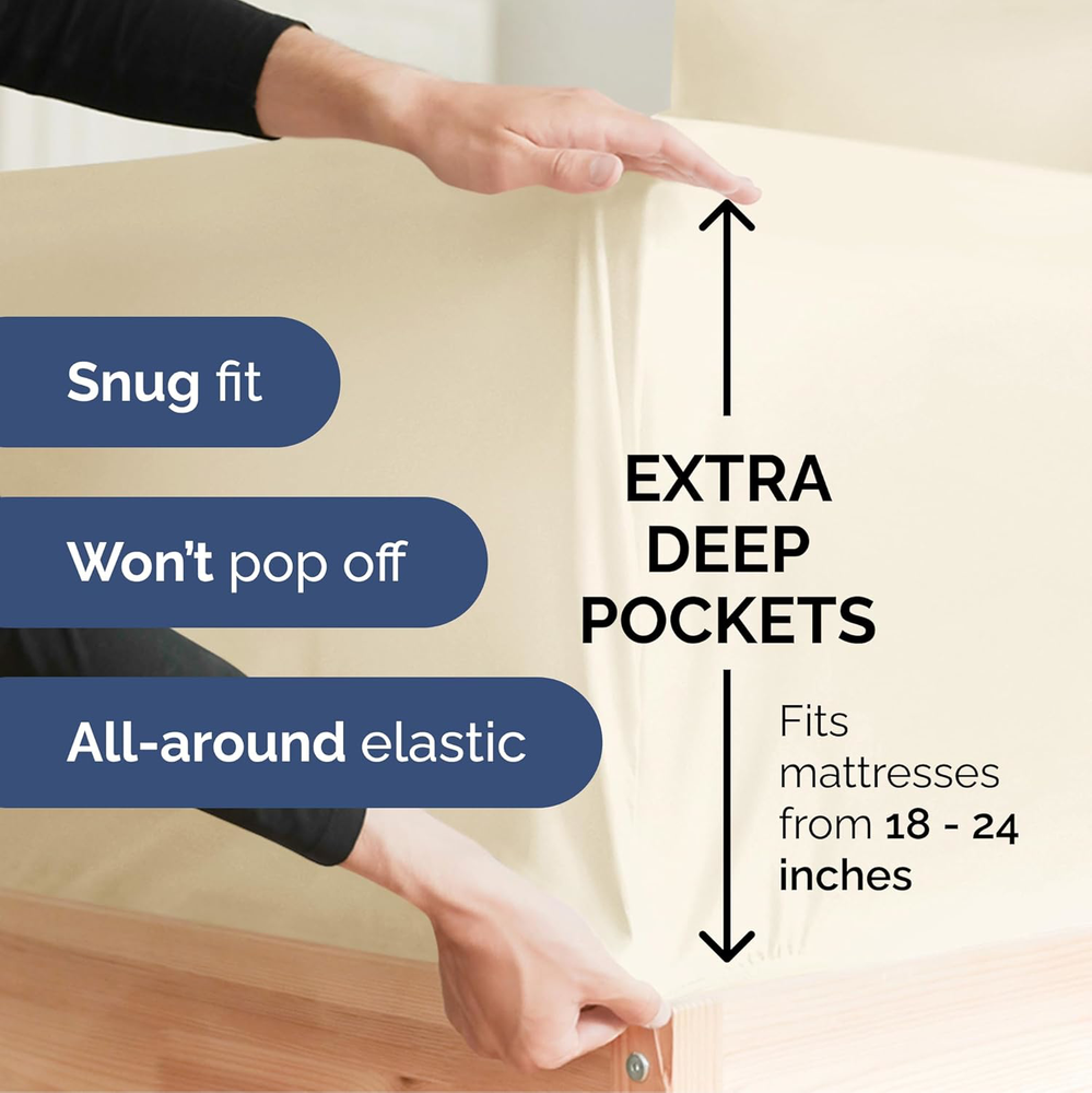 Fast Shipping Great Customer Support Satisfaction Guaranteed DESCRIPTION Shipping Shipping Shipping All domestic packages are shipped for Free (Unless other shipping method was selected during the checkout) Most items ship and arrive much sooner than the estimate delivery date. Usually within 2-3 days from payment. However, we have longer estimates to compensate for the occasional delay or supply chain breakdown. We do not accept P.O. BOXES - PLEASE PROVIDE A PHYSICAL ADDRESS Return Return Return In the event that you would like to return your purchase, we allow returns that are processed within the defined return date (the return date is to be found in the return policy/shipping and handling section) Please contact us for a return authorization and the return shipping address. Payment Payment Payment PayPal is our preferred method of payments it's the quickest, easiest and most secure way to pay for your goods or services online. PayPal offers buyer and seller protection should there be a problem. If you do not have a PayPal account, to get started and buy your first item with us is very easy. Simply click on the 'Buy It Now' button and follow the eBay checkout steps. Select PayPal as the payment method you then will be given the chance to enter your card details in to PayPal's secure checkout in order to pay for your order. Once the payment has been made, you will then be given the opportunity to make your own PayPal account to make paying for your items in the future very easy. Should there be a problem with payment please do let us know. Feedback Feedback Feedback Customer satisfaction is very important to us. If you have any problem with your order,please contact us and we will do our best to make you satisfied, please do not leave a negative feedback before we resolve your problem. We guarantee that your issue will be solved quickly. As long as you are happy with your purchase of , please leave us a positive feedback. Your feedback is very important to us it affects our search placement on eBay. We will leave a positive feedback for you in return automatically once we receive your feedback. Contact Us Contact Us Contact Us If you have any queries, please contact us via ebay. We usually respond within 24 hours on weekdays. Thank you for visiting our ebay store! EXTRA DEEP POCKET SPLIT KING SHEETS / EXTRA DEEP FITTED SPLIT KING SHEETS: These bed sheets are for very deep pocket mattresses. They fit any mattress with pockets that are 18, 20, 21, 22 and 24 inches deep. There's stretchable elastic around the extra deep fitted sheet which stretches for a nice tug around your mattress. Perfect for extra tall & large mattresses. Rest assured these oversized sheets will stay on tight & stay in place! 7 PIECE SHEET SET: This bed sheet set comes with 4 pillowcases total all with beautiful decorative embroidery design on each pillow case. The pillow cases have enclosure designs. This bedding set will accommodate your extra thick mattress perfectly. GREAT FOR DOUBLE PILLOW TOP MATTRESS: These bed sheets are perfect for mattresses with a 3 inch or 4 inch topper on top, memory foam toppers, big mattress pads, pillow tops, foam toppers, big foam toppers, pillow top mattresses and memory foam. These sheets will not come off. MICROFIBER: These are the softest type of microfiber bed sheets we have created. Super soft with a light feel. Not crisp like cotton. If you're accustomed to cotton sheets and you've never tried microfiber sheets we recommend you give these a try. They're even softer than cotton! DIMENSIONS & SIZES: Flat Sheet 113 wide and 102 long. Fitted sheet 39 wide and 80 long with 21 inch pockets (has elastic so it can stretch). All four pillow cases are oversized 20 x 40 inch. Extra Deep Split King Sheet Set - 7 Piece Cooling Bed Sheets - Off White Click here to see description Fast Shipping Great Customer Support Satisfaction Guaranteed DESCRIPTION Shipping All domestic packages are shipped for Free (Unless other shipping method was selected during the checkout) We ship within two business days of payment, usually sooner Standard FREE shipping takes between 3-5 business days Expedited shipping takes between 2-3 business days Overnight shipping takes between 1-2 business days We do not accept P.O. BOXES - PLEASE PROVIDE A PHYSICAL ADDRESS We Ship Globally using ebay's GSP, the item is sent to a logistic center in KY and shipped from there to the rest of the world. International customers are responsible for all duties and taxes Contact your local authority for questions related to the amount of duties or taxes you will be responsible for Return In the event that you would like to return your purchase, we allow returns that are processed within the defined return date (the return date is to be found in the return policy/shipping and handling section) Please contact us for a return authorization and the return shipping address. Please contact us for a Return Merchandise Authorization (RMA) number. We advise you to use a reputable carrier service when returning your goods. Please pack all returns appropriately. We ship globally Via eBay's global shipping program (GSP). Thus we don't cover returns for items shipped globally. Buyers returning such items will be refunded ONLY for the item's cost and not for the shipping. please check the Voltage information and make sure it matches the one in your country. In case it's not stated in the description, do ask us. Payment PayPal is our preferred method of payments it's the quickest, easiest and most secure way to pay for your goods or services online. PayPal offers buyer and seller protection should there be a problem. If you do not have a PayPal account, to get started and buy your first item with us is very easy. Simply click on the 'Buy It Now' button and follow the eBay checkout steps. Select PayPal as the payment method you then will be given the chance to enter your card details in to PayPal's secure checkout in order to pay for your order. O