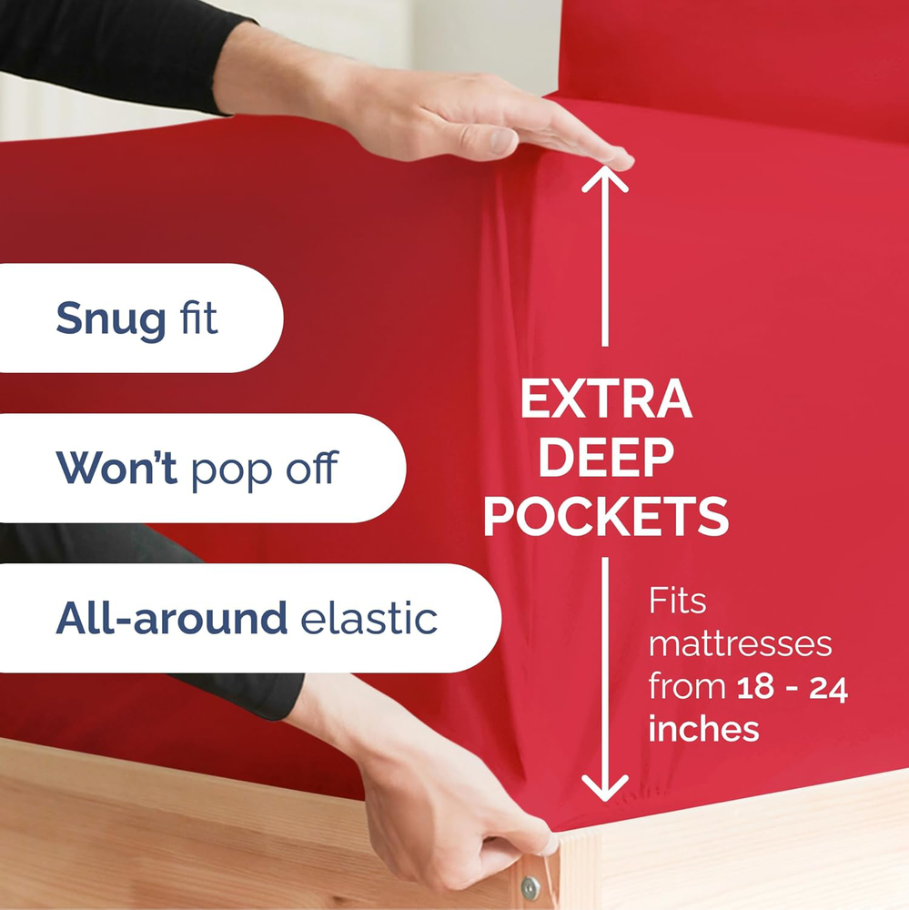 Fast Shipping Great Customer Support Satisfaction Guaranteed DESCRIPTION Shipping Shipping Shipping All domestic packages are shipped for Free (Unless other shipping method was selected during the checkout) Most items ship and arrive much sooner than the estimate delivery date. Usually within 2-3 days from payment. However, we have longer estimates to compensate for the occasional delay or supply chain breakdown. We do not accept P.O. BOXES - PLEASE PROVIDE A PHYSICAL ADDRESS Return Return Return In the event that you would like to return your purchase, we allow returns that are processed within the defined return date (the return date is to be found in the return policy/shipping and handling section) Please contact us for a return authorization and the return shipping address. Payment Payment Payment PayPal is our preferred method of payments it's the quickest, easiest and most secure way to pay for your goods or services online. PayPal offers buyer and seller protection should there be a problem. If you do not have a PayPal account, to get started and buy your first item with us is very easy. Simply click on the 'Buy It Now' button and follow the eBay checkout steps. Select PayPal as the payment method you then will be given the chance to enter your card details in to PayPal's secure checkout in order to pay for your order. Once the payment has been made, you will then be given the opportunity to make your own PayPal account to make paying for your items in the future very easy. Should there be a problem with payment please do let us know. Feedback Feedback Feedback Customer satisfaction is very important to us. If you have any problem with your order,please contact us and we will do our best to make you satisfied, please do not leave a negative feedback before we resolve your problem. We guarantee that your issue will be solved quickly. As long as you are happy with your purchase of , please leave us a positive feedback. Your feedback is very important to us it affects our search placement on eBay. We will leave a positive feedback for you in return automatically once we receive your feedback. Contact Us Contact Us Contact Us If you have any queries, please contact us via ebay. We usually respond within 24 hours on weekdays. Thank you for visiting our ebay store! EXTRA DEEP POCKET SPLIT KING SHEETS / EXTRA DEEP FITTED SPLIT KING SHEETS: These bed sheets are for very deep pocket mattresses. They fit any mattress with pockets that are 18, 20, 21, 22 and 24 inches deep. There's stretchable elastic around the extra deep fitted sheet which stretches for a nice tug around your mattress. Perfect for extra tall & large mattresses. Rest assured these oversized sheets will stay on tight & stay in place! 7 PIECE SHEET SET: This bed sheet set comes with 4 pillowcases total all with beautiful decorative embroidery design on each pillow case. The pillow cases have enclosure designs. This bedding set will accommodate your extra thick mattress perfectly. GREAT FOR DOUBLE PILLOW TOP MATTRESS: These bed sheets are perfect for mattresses with a 3 inch or 4 inch topper on top, memory foam toppers, big mattress pads, pillow tops, foam toppers, big foam toppers, pillow top mattresses and memory foam. These sheets will not come off. MICROFIBER: These are the softest type of microfiber bed sheets we have created. Super soft with a light feel. Not crisp like cotton. If you're accustomed to cotton sheets and you've never tried microfiber sheets we recommend you give these a try. They're even softer than cotton! DIMENSIONS & SIZES: Flat Sheet 113 wide and 102 long. Fitted sheet 39 wide and 80 long with 21 inch pockets (has elastic so it can stretch). All four pillow cases are oversized 20 x 40 inch. Extra Deep Split King Sheet Set - 7 Piece Cooling Luxury Red Sheets Click here to see description Fast Shipping Great Customer Support Satisfaction Guaranteed DESCRIPTION Shipping All domestic packages are shipped for Free (Unless other shipping method was selected during the checkout) We ship within two business days of payment, usually sooner Standard FREE shipping takes between 3-5 business days Expedited shipping takes between 2-3 business days Overnight shipping takes between 1-2 business days We do not accept P.O. BOXES - PLEASE PROVIDE A PHYSICAL ADDRESS We Ship Globally using ebay's GSP, the item is sent to a logistic center in KY and shipped from there to the rest of the world. International customers are responsible for all duties and taxes Contact your local authority for questions related to the amount of duties or taxes you will be responsible for Return In the event that you would like to return your purchase, we allow returns that are processed within the defined return date (the return date is to be found in the return policy/shipping and handling section) Please contact us for a return authorization and the return shipping address. Please contact us for a Return Merchandise Authorization (RMA) number. We advise you to use a reputable carrier service when returning your goods. Please pack all returns appropriately. We ship globally Via eBay's global shipping program (GSP). Thus we don't cover returns for items shipped globally. Buyers returning such items will be refunded ONLY for the item's cost and not for the shipping. please check the Voltage information and make sure it matches the one in your country. In case it's not stated in the description, do ask us. Payment PayPal is our preferred method of payments it's the quickest, easiest and most secure way to pay for your goods or services online. PayPal offers buyer and seller protection should there be a problem. If you do not have a PayPal account, to get started and buy your first item with us is very easy. Simply click on the 'Buy It Now' button and follow the eBay checkout steps. Select PayPal as the payment method you then will be given the chance to enter your card details in to PayPal's secure checkout in order to pay for your order. Once t