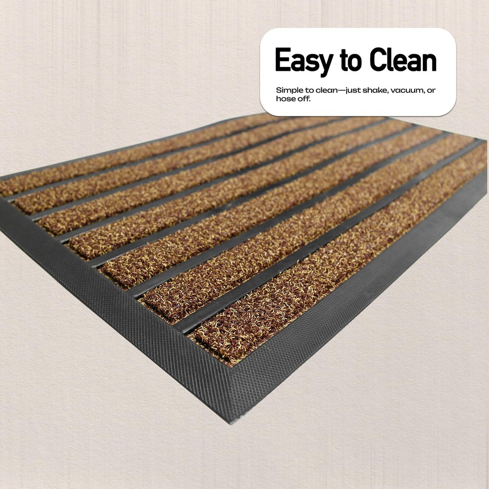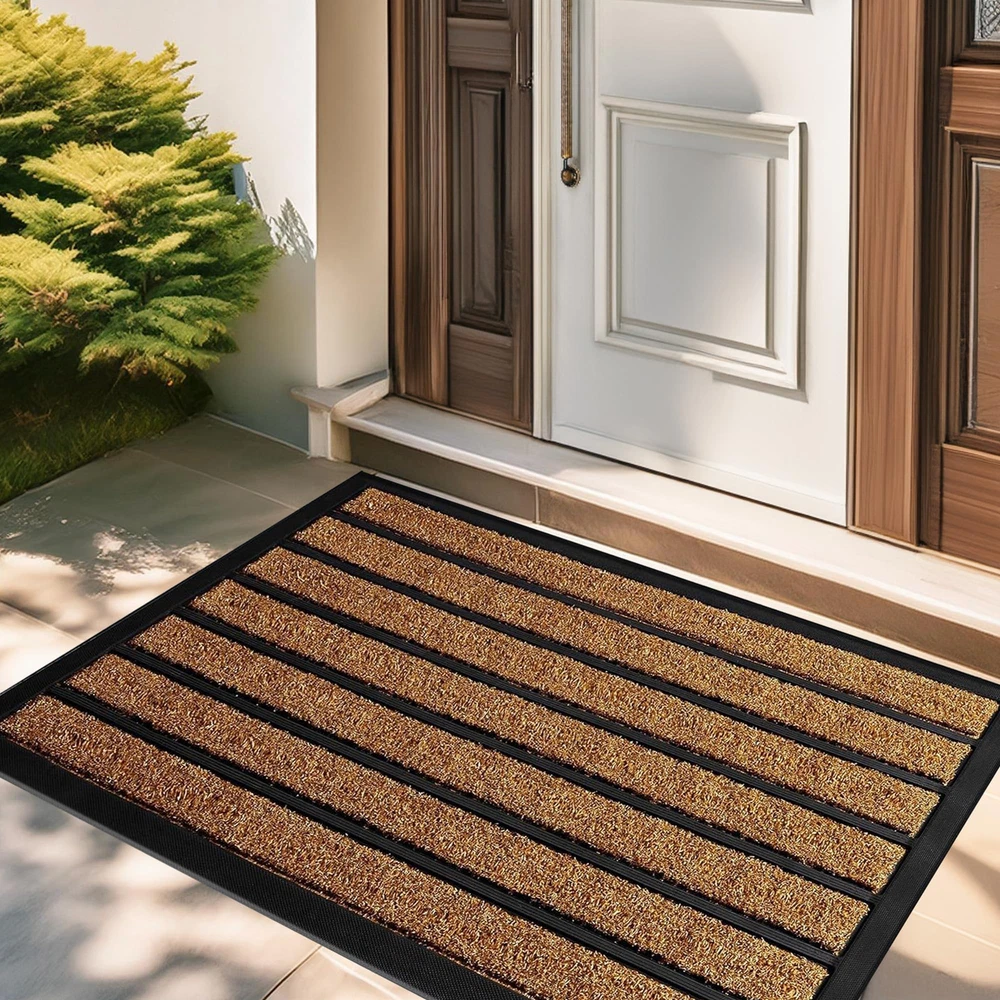 Perfect Dirt Trapper: Our innovative design combines high quality artificial grass and durable rubber strips for an effective mud removing outdoor door mat. Outdoor front door mats outdoor will keep your doorstep clean and tidy. Extra-Large Coverage Doormat: Perfect for wide entryways, large patios, or commercial entrances, this mat offers maximum surface area to keep dirt and moisture out. Heavy-Duty Construction: Made from premium all-natural rubber and durable woven polypropylene, built to withstand heavy foot traffic. Traps Dirt and Moisture: The raised patterned grooves and beveled rubber border effectively capture mud, dirt, and water, keeping your floors clean. Non-Slip Stability: Strong rubber backing ensures the mat stays firmly in place, providing safety on any surface. Weather-Resistant: Designed to endure harsh outdoor conditions—rain, snow, or sun—without fading or cracking. Low-Profile Design: Fits neatly under doors without obstructing movement, perfect for high-traffic areas. Easy to Clean: Shake off dirt, vacuum, or hose down for a hassle-free clean. !CAUTION: Prevent Falls: Ensure mat lies flat before using. To flatten, roll mat in opposite direction overnight (or until flat).