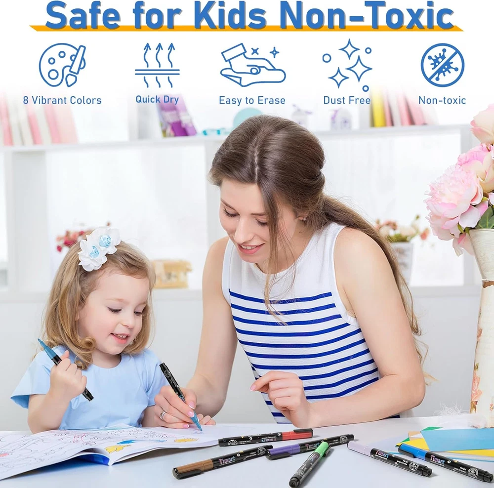 Store New Arrivals Add to Favorite View Feedback Contact Fast deliveries to the customer's home Quality customer service John Make the customers happy! Extra Fine Tip Chalk Markers (8 Pack 1Mm Point), Liquid Chalk Pens - Dry Erase Marker Pens for Blackboard, Chalkboards, Windows, Glass, Bistro, Cars, Signs, Chalkboard Labels Included Description Super Thin 1mm Ultra Fine Point Chalk Marker - Time to replace the old dusty chalk with chalk ink markers. 8 Vivid Neon Colors - Timart fine chalk pens use new upgraded ink that brings more fluorescent colors to our customers. All colors are extremely pigmented, vibrant, and long lasting. Wipe Off Easily - Our Fine tip liquid chalk markers can be erased easily by wiping the area with a damp cloth or paper towel.(ERASABLE ON NON-POROUS SURFACE ONLY!) Fun And Easy To Use -These fine tip chalkboard markers make great window markers and dry erase markers! Use these chalk markers for glass, tile, contact paper, stickers, whiteboards, plastic, and metal with ease. The bright liquid chalk is sure to please. Please Note - Our erasable chalk markers work perfectly with bright colors and vivid colors on ALL non-porous surfaces. it's recommended to try them first on small areas and always follow the cleaning instructions provided.NOT ALL CHALKBOARDS ARE SUITABLE FOR THE USE OF CHALK MARKERS. PLEASE TRY THE MARKERS ON SMALL AREAS FIRST TO AVOID RUINING YOUR BOARD. Product Description TIMART 1mm extra fine tip liquid chalk pens use new upgraded ink that brings more fluorescent colors to our customers. All colors are extremely pigmented, vibrant, and long lasting. Make beautiful artwork to creating holiday decorations for Christmas, 4th of July, Halloween, Birthdays, graduation car decorations, first day & last day of school and more. Have fun and be creative! Made for Everyone - Whether you're a Teacher, Mom, Student, Artist, Kid, Business, Office or Restaurant Owner our markers make creating beautiful messages easy. Package Includes: 8 x chalk markers & chalkboard labels PLEASE NOTE - Our chalk markers work perfectly with bright and vivid colors on ALL non-porous surfaces. it's recommended to try them first on small areas and always follow the cleaning instructions provided. NOT ALL CHALKBOARDS ARE SUITABLE FOR THE USE OF CHALK MARKERS. PLEASE TRY THE MARKERS ON SMALL AREAS FIRST TO AVOID RUINING YOUR BOARD. Timart Liquid Chalk Markers are the perfect way to do it. For use in your home or business, the vivid colors create eye-catching designs on your writing surface to make a lasting impact. Fine, bright, and fun liquid chalk markers. Perfect for adults and kids, this pack of 8 markers offers lively colors. Ideal for businesses, crafts, events, and every day. Perfect for hand lettering and freestyle designs, 8 vibrant colors to help your designs, messages, and slogans pop off of chalkboards or whiteboards. These markers are easy to use and erase. Frequently Asked Questions (FAQs) 1. Why my liquid chalk markers will not come off my chalkboard? Our chalk markers work perfectly with bright and vivid colors on ALL non-porous surfaces. As a result, it is important to determine if your chalkboard has a porous or non-porous surface. If your chalkboard is made from a non-porous material (like slate chalkboards, glass, mirrors, etc.) liquid chalk markers are extremely easy to erase with just a damp cloth. For porous chalkboard surfaces, the pigment can get absorbed by the surface causing a shadow to be left behind when removed. PLEASE TRY THE MARKERS ON SMALL AREAS FIRST TO AVOID RUINING YOUR BOARD. 2. The chalk markers seem to be drying out and won’t write or they are too watery. What should I do? When they appear to be dry or watery, shaking them vigorously for at least 30 seconds usually resolves the problem. Make sure the cap is on tight before shaking. Then prime the tip by pumping it on a clean surface until ink flows smoothly. If you got any damaged ones, pls message us at anytime. 3. My problem is not listed above, how can I ask for help? Please feel free to send us a message anytime. we will respond to it promptly, We’re happy to help! Closure Snap Item Weight 3.84 ounces Number of Items 8 Color 1MM Fine Tip Line Size 1 millimeters Manufacturer Part Number TIM-CM-06 Ink Color Multicolor Recommended Uses For Product Drawing, Writing Point Type Extra Fine Package Dimensions 5.04 x 3.86 x 0.71 inches Size 1 Count (Pack of 8) ABOUT US We offer the best prices around on high quality products. Our E-store includes media such as books, movies, music and games while offering electronics, toys, sporting apparel, clothing, tools, general home, garden items and more. SHIPPING We are always working hard to ensure your package arrives as soon as possible. Please understand that some factors like weather, high postal traffic, and the performance of shipping companies are outside of our control. We offer free shipping to the lower 48 states and ship within 2 business days of payment, usually sooner. We do not accept P.O. Boxes. Please provide a physical address. For shipping outside of the continental USA, we only use eBay's Global Shipping Program. The item is shipped to KY and then sent to the rest of the world. International customers are responsible for all duties and taxes. Continue to 'check out' to calculate costs for shipping the item to your country. Messages regarding eBay's Global Shipping Program MUST be directed at eBay EXCLUSIVELY. RETURNS We offer a 30-Day Return Policy on items in which you are not completely satisfied with. You have the option of a full-refund or an exchange of the item. No returns are available on items shipped outside of the USA PAYMENT We accept PayPal. CONTACT US This page content is yet to come Please ad us to your favorite seller and visit again later Thank You CUSTOMER SATISFACTION We try our very best to make sure every customer is completely satisfied. If there's a problem, message us! We're happy to help. WE ACCEPT