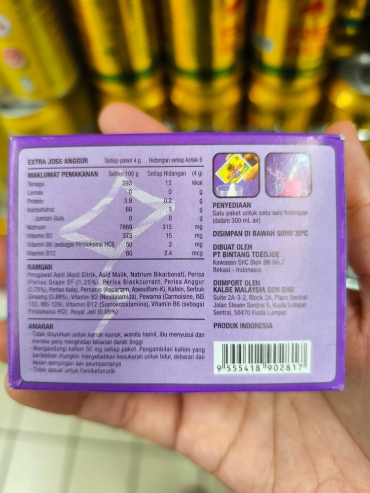 120 Sachet Extra Joss Grape Flavour Sugar Free Energy Drink Powder- Boost Your Energy Description: Looting for a refreshing and sugar free Energy Boost? Extra Joss Grape Energy Drink Powder is here for You Flavor: Grape Sugar free: Perfect for a healthier lifestyle Energy boost: Helps you to stay active and focused Quantity: 120 sachets (read mix with water) Portable: Easy to carry sachet for on the go convenience How to use: 1. Open one sachet 2. Mix with 200ml of water 3. Stir well and enjoy
