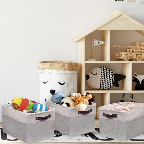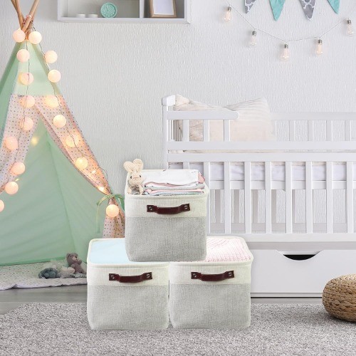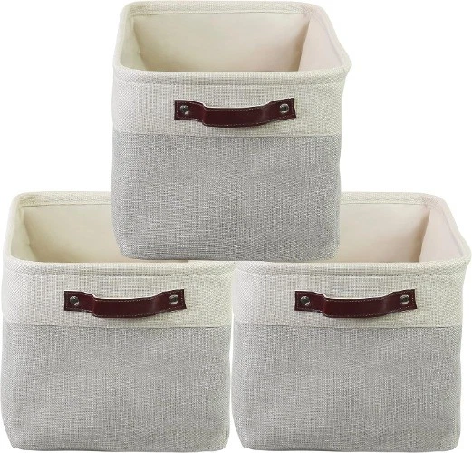 Sturdy Side Handle: 2 leather like handles with eyelets for a comfortable grip Multi-Purpose: Great for storage your clothes, baby products, toys and pet products to keep your space neat Durable Material: Linen upper with EVA baking and reinforced bottom base for bins keep its shpae while staying soft Simple and Decorative: Ideal to fit with interior decoration and put in your bathroom, living room, bedroom, or kitchen. Collapsible bins to save on space when not in use Dimension: 15" L x 11" W x 9.5" H