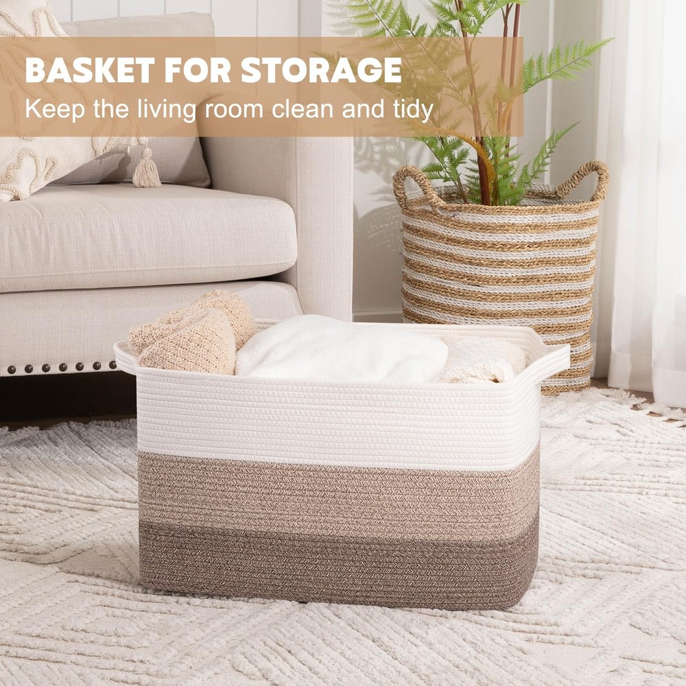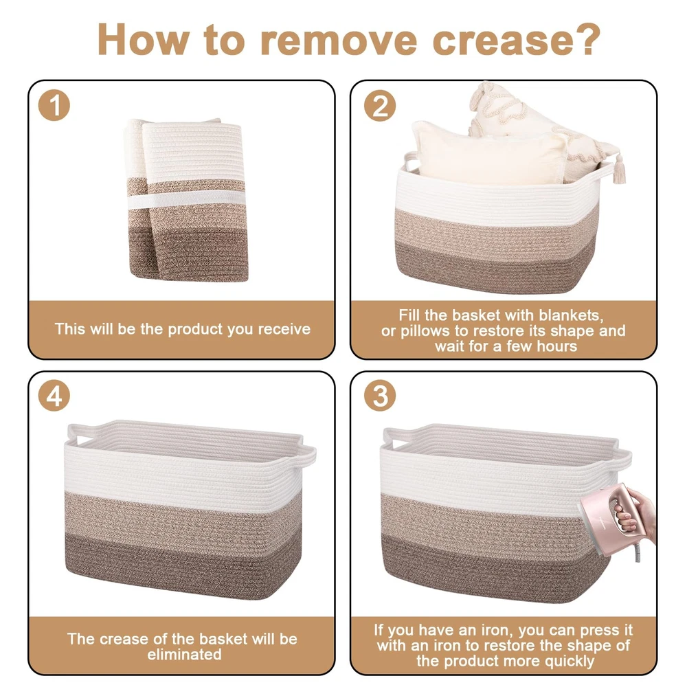 Blanket Basket for Living Room: This decorative laundry basket is more stable and easier to restore its shape after you receive the package. The size of the large storage basket is 24’’ x 17’’ x 14’’, it can be used to store blankets, clothes, toys, etc Cotton Rope Storage Basket:woven toy basket are made of 100% natural cotton, soft and odor free, there are no sharp or hard edges to scratch floors, and safe for kids and pets. Also it is more firm than plastic basket Large Basket With Handles: This rope basket is equipped with sturdy handles, which is sewn with double reinforced threads. It can support heavy objects, or it can be dragged. It is convenient for you to take it from upstairs to the rooms Foldable Laundry Baskets for Storage: toy storage bin are soft and sturdy enough, it can be folded to save space when not in use. The basket is widely used in bedrooms, living rooms, nurseries, laundries and bathrooms Washable Laundry Basket: This storage basket can be washed by hand or machine. NOTE: These baskets are folded when shipping, but it will turn back to its elegant shape quickly if you fill it with some clothing, and iron is great idea to remove the creases