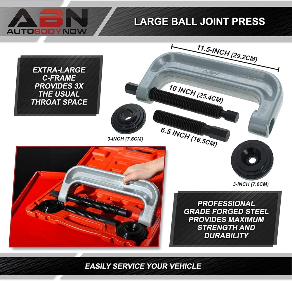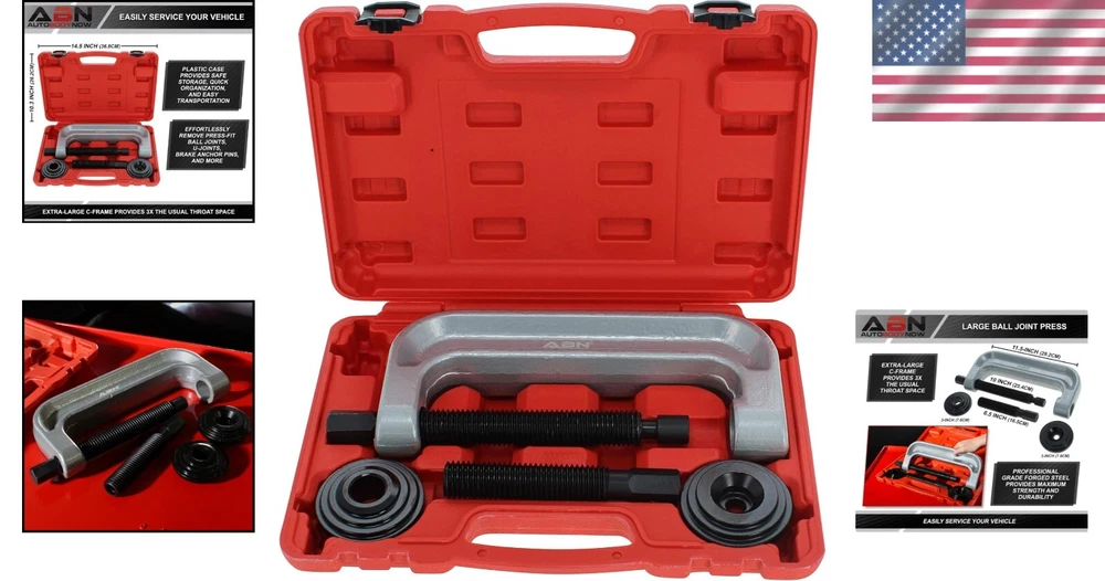 Extra Large Ball Joint Press Tool with 3 Adapters for Domestic & Imported Cars ‹ › ‹ › ‹ › ‹ › ‹ › ‹ › ‹ › ‹ › ‹ › Extra Large Ball Joint Press Tool with 3 Adapters Specifically designed to make your vehicle servicing efficient and effective, this versatile tool is essential for any automotive enthusiast. Features: Service your vehicle's suspension system effortlessly by replacing worn or rusted ball joints. Multi-functional use as a ball joint puller kit, control arm bushing tool, U joint press kit, or tie rod and track pin press set. Heavy-duty design fits most 2 and 4 wheel-drive domestic and imported cars, pickup trucks, SUVs, and even tractors. Constructed from professional-grade forged steel, offering maximum strength and durability. Features a black oxide finish to resist elemental damage and wear, ensuring longevity. Specifications: Dimensions: 11.5 inches (29.2cm) tall with a robust C-frame. Includes 2 interchangeable pressure screws and a 3.5-inch (8.9cm) pressure screw head adapter. Two 3-inch (7.6cm) wide stepped automotive press adapters fit 10 and 6.5-inch (25.4 and 16.5cm) pressure screws. Convenient Storage: Comes with a 14.5 by 10.3-inch (36.8 x 26.2cm) plastic blow-molded carrying case for safe storage. Quick organization with a compartment for each ball press kit piece. Easy to transport for on-the-go servicing. Why Choose Our Extra Large Ball Joint Press Tool? Empower yourself with this essential tool that combines quality, durability, and convenience for all your automotive needs. Replace ball joints with ease and confidence while ensuring your vehicle’s suspension system operates smoothly. Whether you're a professional mechanic or a DIY enthusiast, this heavy-duty kit is tailored to meet your expectations. Upgrade your workshop with our Extra Large Ball Joint Press Tool today and experience the effortless service of your vehicle! Shipping Free & Fast Shipping - We offer free shipping to most of the USA with a normal delivery time of 3-7 days. However, due to the current situation, additional delivery time (up to 3 weeks) may be required for some items. Alternative Carriers - We may use alternative carriers (e.g. USPS, FedEx, UPS, etc.) to ensure your package arrives safely and on time. Due to the use of multiple carriers, we are unable to provide a tracking number automatically. Handling Time - Orders are processed and shipped within 1-2 business days of receiving cleared payment. Shipping Restrictions - Shipping to Alaska, Hawaii, Puerto Rico, Guam, and other US territories may incur shipping charges or delivery restrictions. Please contact us before ordering, or your order can be refunded/cancelled. State Restrictions - There may be restrictions based on your state of purchase. For example, certain items may not be shipped to California due to state regulations. Contact for Tracking Updates - If you require tracking updates or have any concerns about the delivery of your order, please feel free to contact us, and we will be happy to assist you. Return Please see our eBay Return Policy. Thank you. Payment We accept all major credit cards, PayPal, and Apple Pay for your convenience. Your payment information is secure and encrypted to ensure a safe and seamless transaction. Please complete your payment within 3 days of purchase to avoid any delays in shipping. Feedback Your feedback is extremely important to us. We strive to provide the best products and customer service possible. If you are satisfied with your purchase, please take a moment to leave us a positive review. If you have any concerns or issues with your order, please contact us before leaving negative feedback. We are committed to resolving any problems and ensuring your satisfaction. Contact Us If you have any questions or concerns, please feel free to reach out to our customer support team. You can contact us through the eBay messaging system. We are available Monday to Friday, 9:00 am to 5:00 pm EST, and we will do our best to respond to your inquiry within 24 hours. Thank you for supporting our small family business! Manufacturer Part Number: Ball Joint Press Kit UPC: Not Set Unit Quantity: 18.94 Type: Ball Joint Splitter,Ball Joint Press Kit,Wheel Bearing Press Kit,Ball Joint Separator,Ball Joint Removal Tool Set,Ball Joint Puller Kit,Control Arm Bushing Tool,U Joint Press Kit,Tie Rod Press Set,Track Pin Press Set Brand: Unbranded Warranty: 1 Year Country/Region of Manufacture: Not Set Unit Type: lb