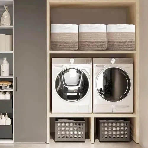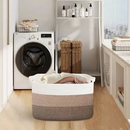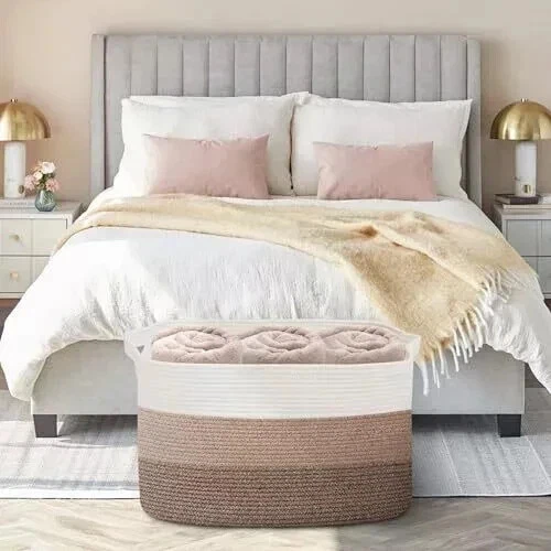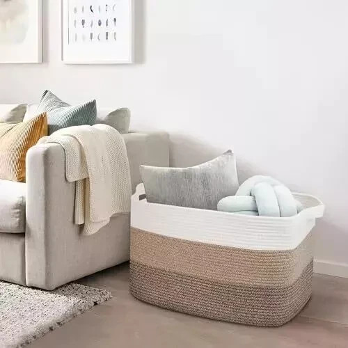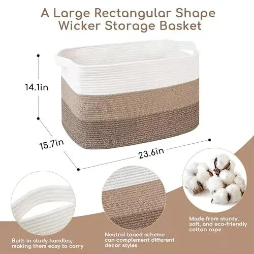 Material Cotton Color 3-toned Brown Brand MEGASKET Shape Rectangular Product Dimensions 15.7"D x 23.6"W x 14.1"H About this item LARGE BASKET FOR BLANKETS: 23.6"L x 15.7"W x 14.1"H, Giant rectangular floor basket offer accessible blanket storage for living room and bedroom. This huge space-saving blanket holder has an 87 liters capacity and can hold tons of blankets and other bedding. Minimum of 5-6 throw blankets or 3 throw sized quilts at once. UNIQUE RECTANGLE DESIGN: Unlike the round basket, this is a rectangular shape woven baskets for storage. Its unique design allows this storage organizer to be placed not only on the floor but also to fit perfectly on a shelf for shoes or inside a closet for laundry. Decorative basket in neutral tones is perfect for modern, rustic, bohemian, farmhouse, vintage or marine room decor. A sweet baby gift for a family. PREMIUM NATURAL COTTON ROPE: The large wicker storage basket is braided from organic natural cotton rope, making it a soft, textured storage bin that'll look great in living room, bedroom, kids room, laundry room and nursery. The rope basket is safe to baby for no unpleasant chemical smells. No hard edges will keep your floors and walls free of scratches. VERSATILE USE ROPE BASKETS FOR ORGANIZING: The wide open designed wicker baskets is exceptionally big, making it perfect for storing various items. Not only is it a choice for keeping throws and blankets, but its versatility also allows you to use it for storing baby clothes, baby diaper, decorative pillows, extra towels, kids toys, and even as a laundry basket in a guest room. WOVEN BASKET WITH STURDY HANDLES: The woven storage container features two sturdy but soft carrying handles. You easily move the woven storage basket from one place to another, allowing you to move items conveniently even when full of blankets and toys. The basket is washable. It comes in folded, you can iron the basket to remove the creases.