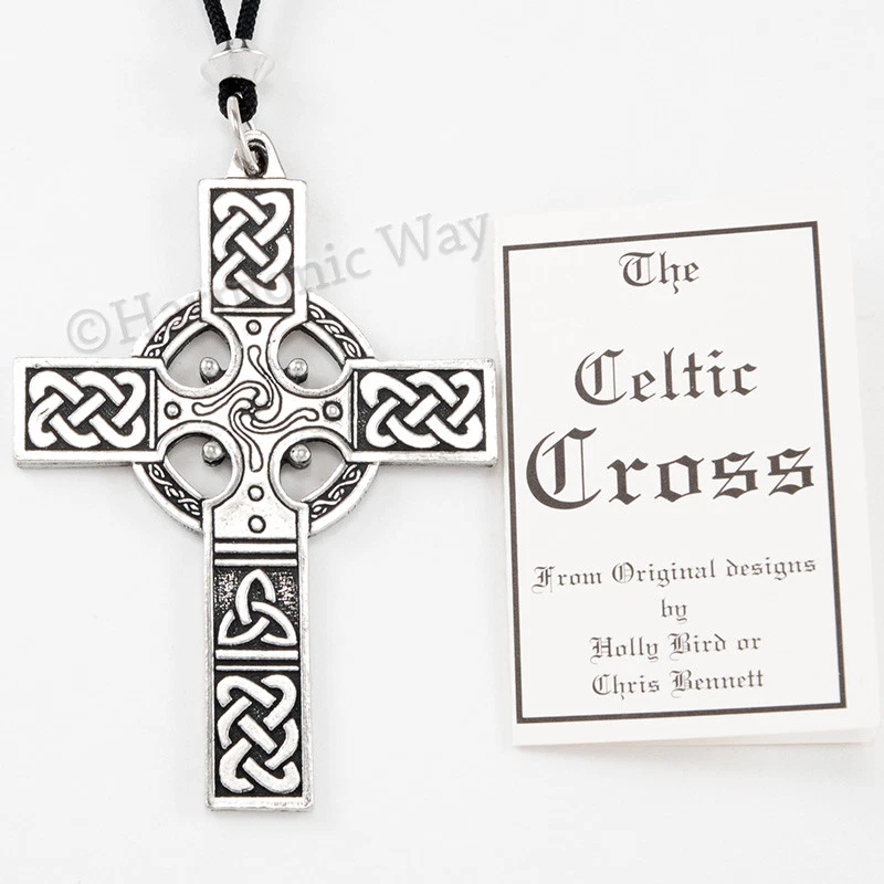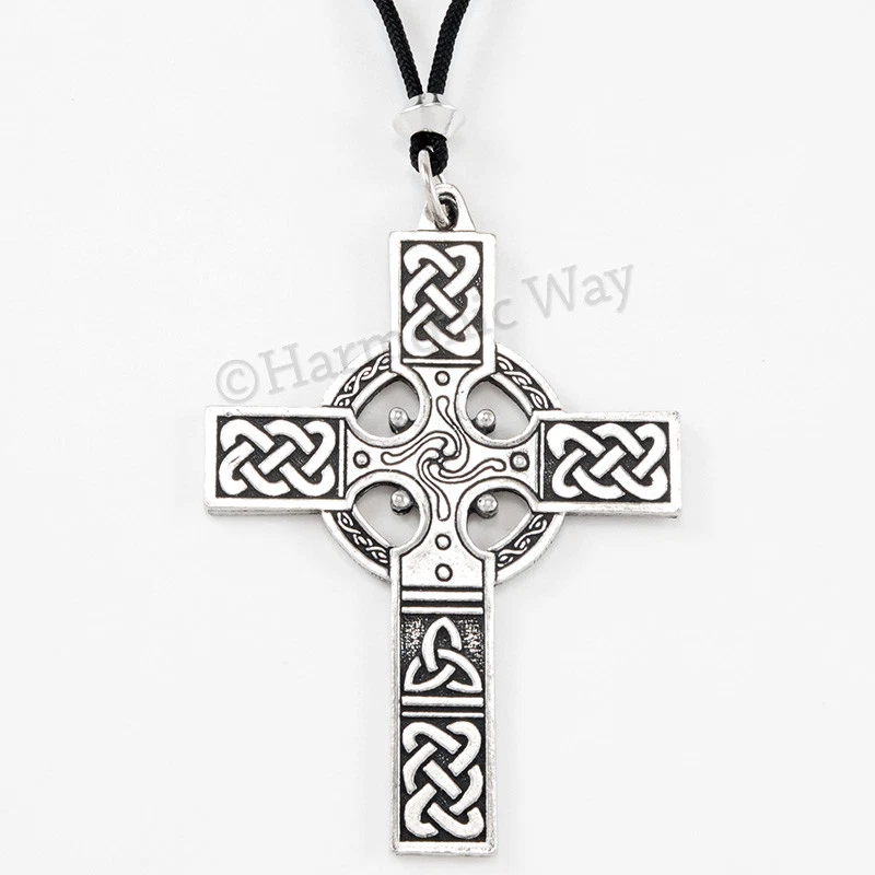 "Extra Large" Celtic Cross Necklace A Smaller Version of this Cross is available in our ebay store. Ancient symbol of Balance. The never-ending knot work of Celtic designs represents the eternal process of man's spiritual growth. Beauty and symbolism combine to make this a very appealing and wonderfully wearable piece! This piece is Superbly hand-crafted in the highest quality lead-free Pewter available. A unique finishing process is used resulting in one of the most beautiful lines of jewelry you can find! This pendant is brand new, detailed on both sides and comes with a 36" black cord with accent bead. 3" h x 2 1/4" w approx.