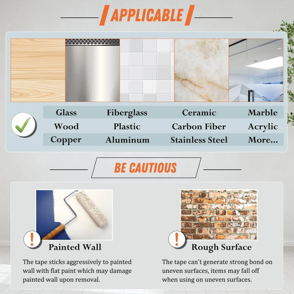 Wotec double sided heavy duty mounting tape is made of premium acrylic gel material via advanced nano-tech, our industrial strength tape bonds instantly and holds permanently. ·Size: 1.18 x 160 x 0.08 inch ·Removable & No residue ·Advanced nano-tech ·Reusable 【Strong Adhesion】: Our heavy duty double sided tape is made of premium acrylic gel via advanced nano tech with great holding power. Getting your mounting activities done fast and securely without drilling and nails, a must have for dorm room essentials. 【Removable and No Residue】: Our removable double sided tape heavy duty leaves no sticky residue and won't damage most surfaces upon removal such as glass, metal, plastic, marble, wood. No need to clean the mess like other kind of adhesive, totally renter friendly. 【Weatherproof】:Our heavy duty adhesive double sided tape with high temperature and solvent resistance will stick to almost any smooth surfaces and works perfectly indoor and outdoor. It's perfect for mounting or repairing items such as pictures hanging strips, frames, festival decorations, LED plates, nameplates, posters, hooks, shelves, phone holders, carpets, flowerpots, power sockets, DIY items, home & office decor and so on. Perfect for classroom, college dorm room decor. 【Easy Storage and Dirt-free】: With our innovative protective PC holder, our strong viscosity double-sided tape won't stick to any other things when lying down, making it easier for storage. It can be easily cut to any size and mounted on wall for convenient hanging. 【Caution to Use】: Please be cautious when using the tape on painted wall due to strong adhesion and the nature of painted wall, which may peel off painted wall upon removal. Please keep the mounting surface dry, clean and free of oil when mounting to make instant and permanent bond and get great water and moisture resistance ability. Applying the tape vertically on the items can make stronger bonds.