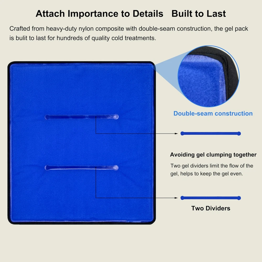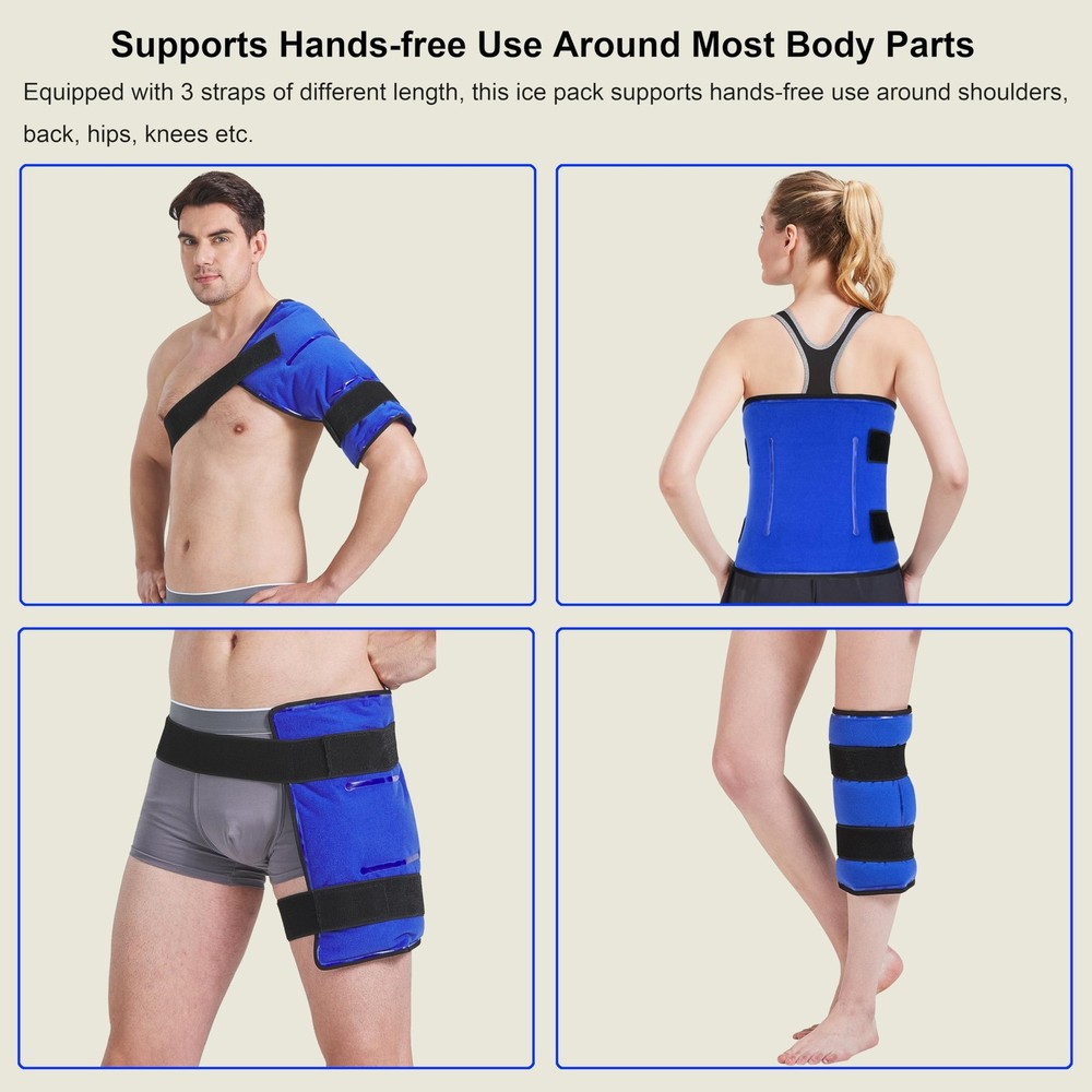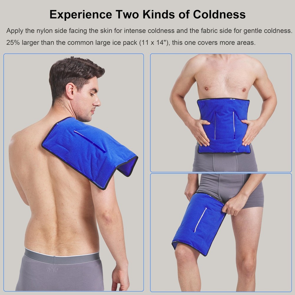 XL Ice Pack, the right ice pack you are looking for. Don't settle for a small or lighter gel pack. Grab large all-in-one ice pack for hot & cold therapy! Features: ✓ 25% larger than 11" x 14" (L) ✓ Double-sided materials—nylon and fabric ✓ Excellent cold-keeping ability ✓ Reusable and microwaveable ✓ Flexible and soft at -4°F(-20°C) ✓ Compatible for shoulders & arms, back, belly, Hips, thighs, knees, shins etc. Cold therapy instructions Cold therapy is perfect for sports injuries, back ache, joint pain, fever, headaches, toothaches and minor burns etc. and should be applied in the first 48 hours after the injuries. ✓ Store the gel ice pack in the freezer for at least 2 hours. Hot therapy instructions Hot therapy is perfect for sprains, strains and stiffness, muscle pain and spasms, mild arthritis, menstrual cramps etc. and should be applied 48 hours after the injuries. Microwave heating ✓ Heat the gel pack in the microwave according to the detailed instructions on the gel pack. Includes: 1 nylon gel pack (13.1" x 14.7", 2.45 lbs) 3 elastic straps of different length OUR GUARANTEE ✓ With , you're taking on absolutely no risk. 1-Year Warranty (Free No-Hassle Replacement!) ✓ Best customer service. Please get in touch with us for any questions. Warm Prompt Use the fabric side first for several minutes to adapt the ice and then the other side. If you use the nylon side directly when it is taken from the freezer, please place a towel between the ice pack and the skin in case of burns. XL Hot Cold Dual-use Ice Pack. This XL ice pack measures 13.1 x 14.7 inch and is 25% larger than the common large ice pack (11 x14 inch). It can cover about 70% of the whole back and 75% of the knee circumference. Unlike most single-cold ice pack, this gel ice pack supports microwaving heating for hot therapy. Innovative Dual-temperature Ice pack. Crafted from durable nylon and special fabric, this ice pack can innovatively provide two-level coldness. The nylon side provides intense coldness and the fabric side provides soothing coldness. You can use the ice pack directly without wrapping a towel. Use the fabric side first for several minutes to adapt the ice and then the other side. Hands-free Application of Cold Therapy. This ice wrap is versatile and can be used around many body parts such as the shoulder, back, belly, hip, thigh, knee, shin etc. Moreover, it comes with 3 removable elastic straps which help secure the ice pack in place. Even you can keep moving when applying the cold pack. Flexible and Long-lasting Ice Pack. Containing premium gel with unique formula, this gel ice pack remains pliable after frozen even at -4°F (-20℃), easy to morph into the shape fits the specific body parts. In addition, filled with enough 2.45 lbs of high-performance gel, this ice pack can absorb more energy in the freezer, thus can deliver up to 30 minutes of pain relief. Compared to some 20-minute brands, this ice pack has clear advantage. One Year Warranty. Wide edge and double-seam construction enable the ice pack to withstand hundreds of quality cold treatments. 30-day unconditional return and free replacement within one year. Your 100% satisfaction is always our goal. Please purchase with confidence.