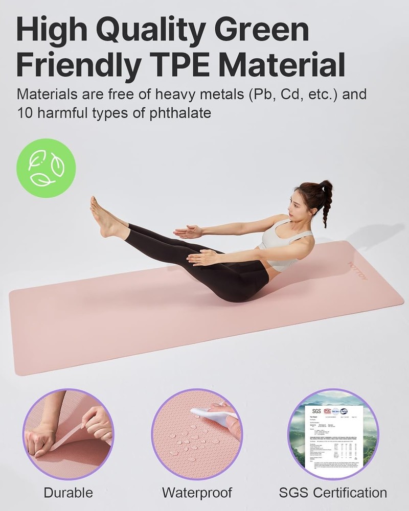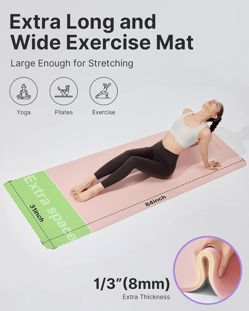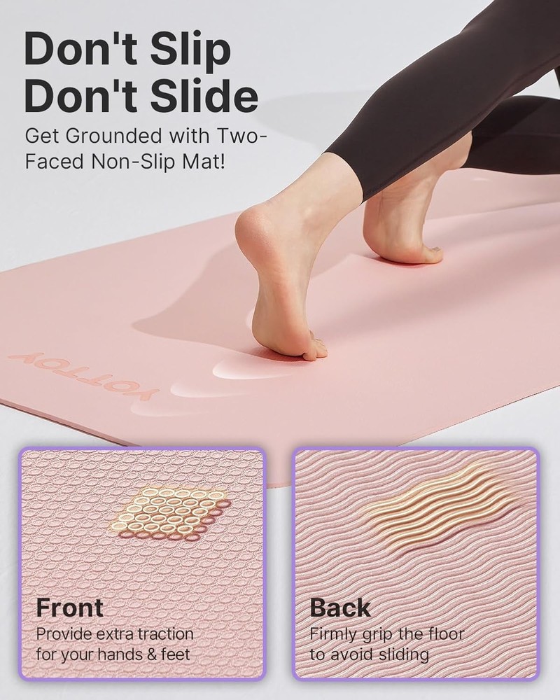 This extra-large yoga mat is a game-changer! The generous size and thick cushioning make every move comfortable, whether I'm stretching, doing yoga, or floor exercises. The non-slip surface keeps me steady, even during sweaty workouts, and the water ripple texture on the bottom adds extra grip. It’s durable, easy to clean, and perfect for anyone who wants space and stability. Love how it stays put on hardwood floors—no more annoying adjustments mid-pose. A must-have for serious yogis or anyone who values comfort and safety during workouts!