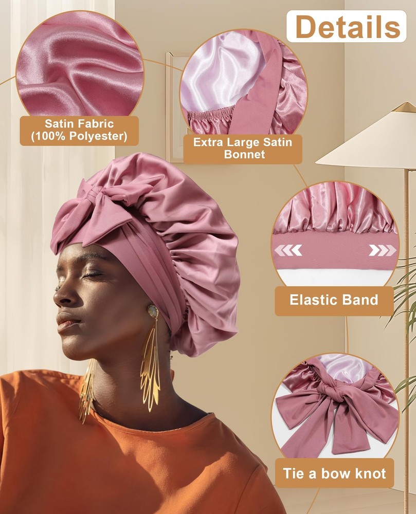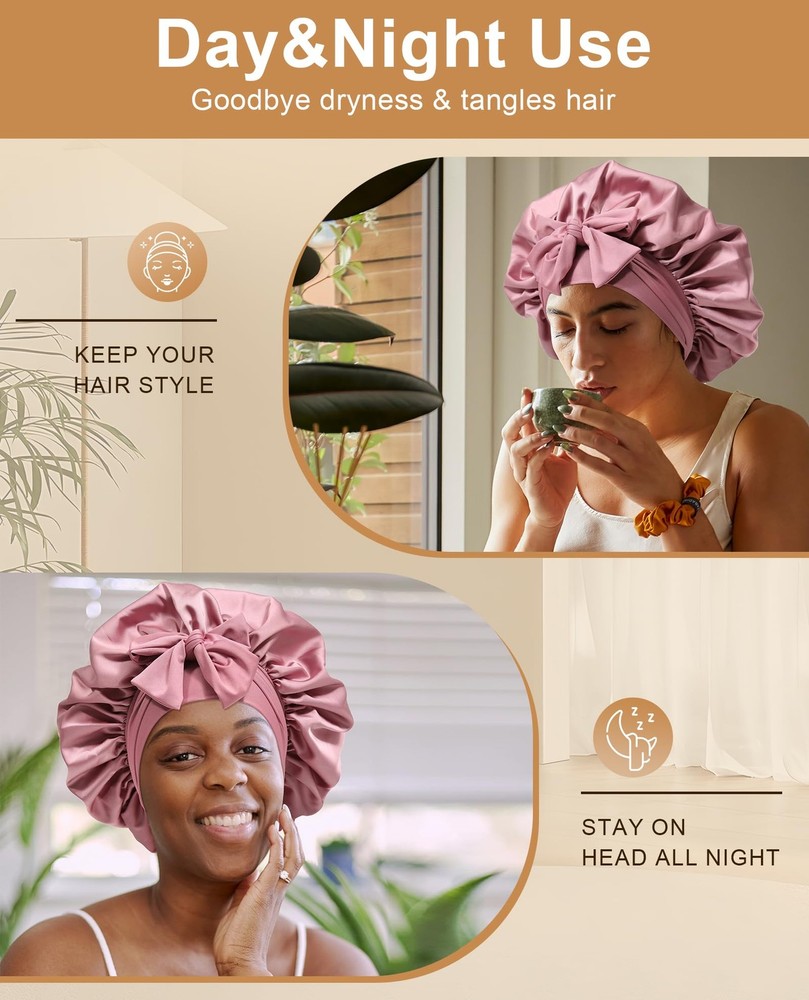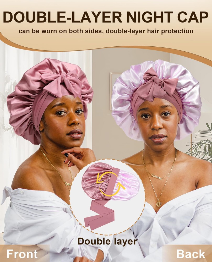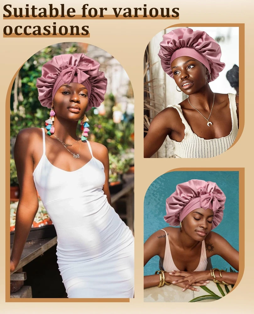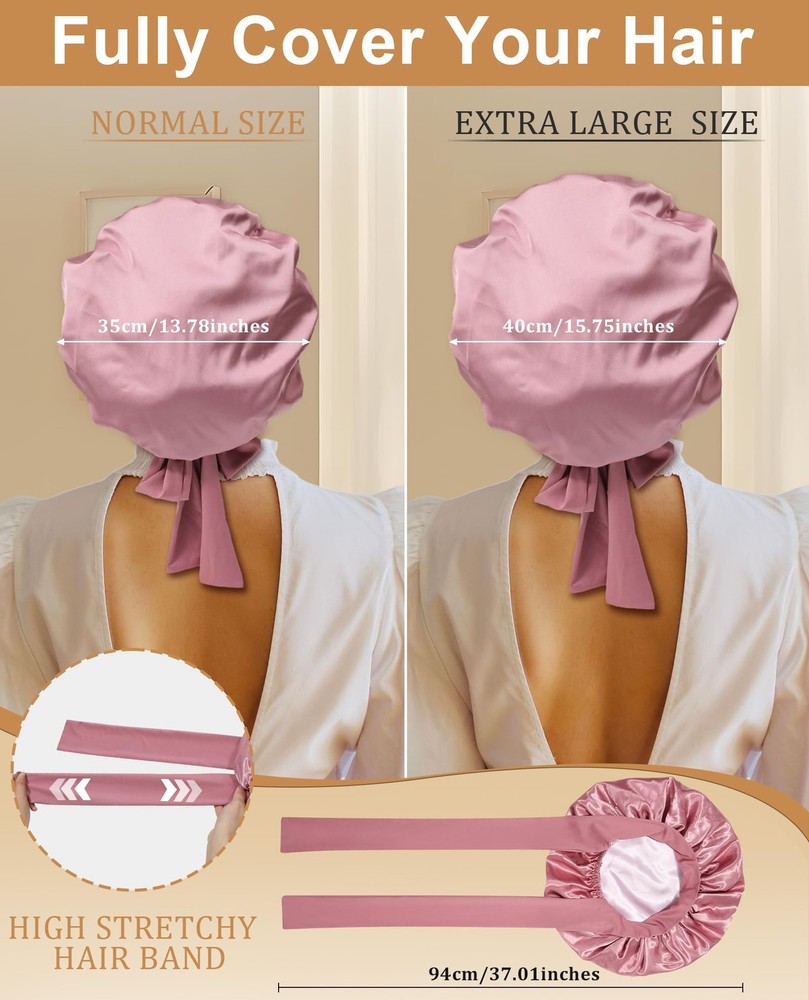 Features: *Material for this Satin Silk Hair Bonnet: soft, breathable.The satin fabric is soft enough,well keep hair moisture. *Suitable size for most people: Satin Silk Hair Bonnet flat diameter up to: 40cm/15.75inches.This is adjustable size bonnet,widely used for Women or men curly hair,wigs, natural hair,etc,suitable for most of women or men hairs. *Prevent The Bonnet slip off while sleeping as night cap:Satin Silk Hair Bonnet attached with a wide stretchy Tie Band made of high elastic soft fabric, you can easily Tie and adjustable and fix the Satin Silk Hair Bonnet on head for Women hair , usually you can make the bonnet stay on hair all over night.The long, soft strap also makes a pretty bow on the forehead or side. *You can make a beautiful bow or wrap on head, make you comfortable and women more beautiful too.perfectly fix the Bonnet on head and protect your hair while sleeping, very soft skin-friendly Band, you will feel much more comfortable. *The wide soft Tie Band of Satin Silk Hair Bonnet, protect the edge well and keep both edge and hair in good conditions. *Wide use of our Satin Silk Hair Bonnet: usable for both Sleeping,houseworks,any sports: yoga, running,gym,etc,it would not fall off. *Usable for any size of head by it's adjustable stretchy Ties Band,including girl and adult women hair. Note: *Manual measurement of size, minor differences please ignore. *As the picture shows, Different materials will have slight chromatic aberration under Extra Large Size:Satin extra large bonnet measures 40 cm / 15.75 inches. The size is large enough to accommodate a variety of hair styles, including braids, curly hair, natural hair, braids, waves, long hair, and afros Adjustable Elastic Tie:Women satin bonnet has 6.5 cm / 2.56 inches extra-wide adjustable straps with two straps, can be stretched to suit different head sizes, making it easy to tie a beautiful bow on the forehead or side Double-layered and Double-sided Use:Jumbo silk bonnet has a double-layered design. Different colors on both sides can be switched according to needs.Made of high-quality polyester, soft and breathable for year-round use Protect Hair All Night Long:Sleep cap can protect hair to the maximum extent at night, stay on the head all night without slipping, help lock in hair moisture, maintain hair style, prevent hair from knotting, dryness or curling Wide Range of Uses:Curling hair bonnet is suitable for sleeping,convenient for daily use. Can be used during makeup, face washing, skin care, housework, work, and yoga. Also suitable for chemotherapy patients