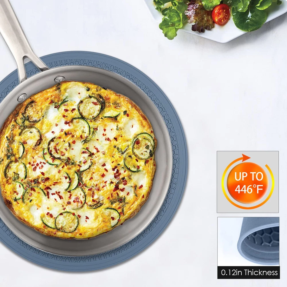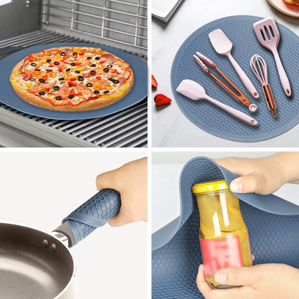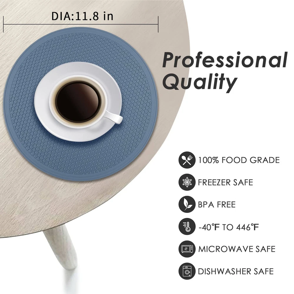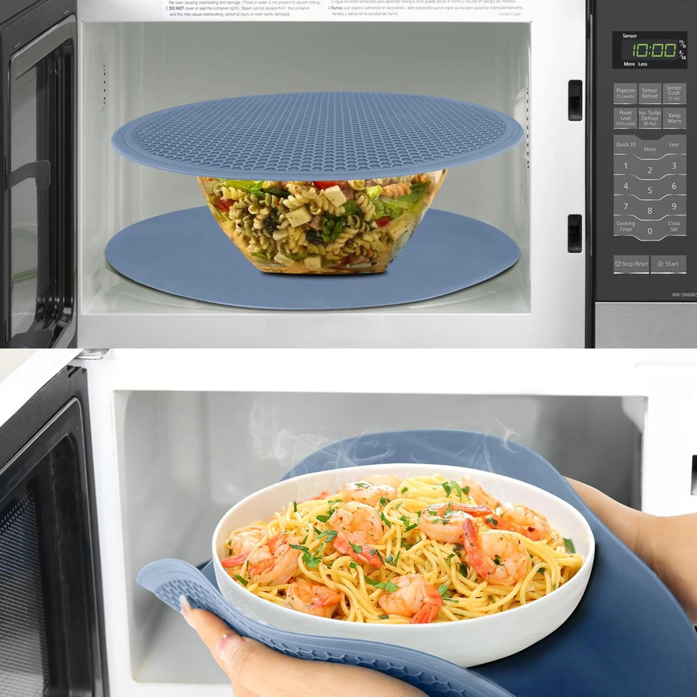 【PREMIUM SAFE MATERIAL】- Our microwave mat bowl holder is made from 100% BPA-free food-grade silicone, safe for food. Non-slip, this microwave silicone cover is flexible enough to comfortably grab a hot dish or pan. 【LIGHTWEIGHT & HEAT RESISTANT】- This silicone splatter mat is heat protection and insulated as a protector for countertops, tables, stoves or others. Heat-resistant temperature from -40°F-446°F(-40°C to 230°C), safe for use in the oven, freezer, microwave and as a pot holder, trivet, jar opener, spoon rest or anywhere you need extra grip or extreme heat. Microwave mat as a splatter guard prevents overflow in the microwave. 【LARGE DIAMETER & DURABLE】- This microwave non slip mat is very flexible, great to grab, tensile property is good and the service life is long. The blue microwave mat is 11.8 inches large diameter and fits standard glass turntables. 0.12in thickness Honeycomb designed silicone mat with a large diameter can for dish drying and holding a lot. Notched edges to prevent water from flowing onto the table. 【MULTI FUNCTION TRIVET MATS】- These microwave liners not only protect your countertop&table top but also as bowls mat, pot mats, coasters, teapot mats, table mats, coffee mats, jar openers, hot pot holder, large coaster, hot mitts, spoon rest, dish drying mat or anywhere you need extra grip or extreme heat or cold protection. 【EASY TO CLEAN & 】- Easy to clean, safety wash in dishwasher, waterproof and also easy to dry by squeezing out or shaking. These microwave mats are easy to and can be rolled up for storage or stacked for storage without taking up much space.