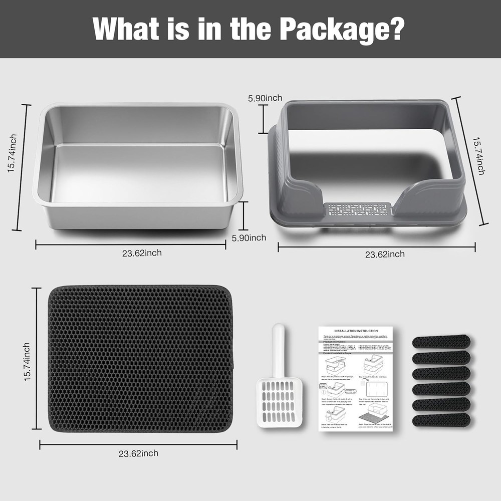 Super Large Capacity: This stainless steel cat litter box features an jumbo interior space (23.6L'' × 15.7W'' × 11.8H''/60 × 40 × 30cm), suitable for medium & large cats. Ensuring 2 medium or 1 big cats have enough to move and can use it for long periods without frequent litter box changes & offering large room for your cat to move around comfortably. High Sided Fence Design: Fence design to prevent urine from being spilled out and keeping the surrounding area clean, you will never worry about your cats urinating at a higher level. Also the high edges can effectively prevent your curious cat from accidentally kicking the litter out while they're busy at digging or covering up. No More Mess: Not only can the high sided fence help prevent the litter splashing out, but also the entrance pedal can help reduce the litter being taking out, In additional, we offering a litter mat placing in front of the litter box, no worry about cat litter being scattered all over the floor! Eight Clasps: The stainless steel basin is tightly connected to the fence with eight clasps, forming a sturdy structure that ensures it won't sway or shake every time your furry friend visits. If you wanna to cleaning it, just pull the clasps and you can easily install the lid from the stainless steel litter tray base. Non Skid: Non-Slip silicone pads sticking to the base can prevent accidental movements. No matter your cat using or you cleaning the metal toilet, it will keep in the same place still, making your cleaning job much easier. Easy to Clean: Made from high-quality materials with a smooth surface, the litter box is easy to clean and maintain, requiring just a quick wipe to restore its cleanliness. Complete Set for Convenience: Everything you need for your cat's litter box is right here! Our cat litter box comes complete with a handy cat litter shovel and a trapping mat. The shovel makes scooping out waste a cinch, and the mat catches any stray litter that your cat might track out, providing a tidy and convenient solution for both you and your pet.