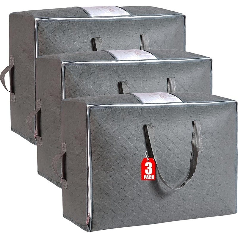 Heavy Duty 40 Gallon Wheeled Industrial Tote W/ Drip Resistant Lid Storage New 30.64 USD 32.95 USD Free shipping 7% off Cozy Electric Heating Blanket Faux Fur Soft Warm Throw Home Office Use 41.74 USD 44.88 USD Free shipping 7% off Bagless Upright Vacuum 720W Lightweight Multi Surface Cleaner 25ft Cord New 67.52 USD 72.6 USD Free shipping 7% off 10 Piece Glass Mixing Bowls Set W/ Lids Food Storage Prep Serving Dish New 19.31 USD 20.76 USD Free shipping 7% off Soft Heated Blanket Twin Sherpa Electric Auto Off 5 Heat Settings Comfortable US 41.84 USD 44.99 USD Free shipping 7% off Electric Heated Blanket Soft Warm Auto-Off 5 Heat Settings Safe Eco-Friendly New 41.75 USD 44.89 USD Free shipping 7% off Convertible Futon Sofa Bed 3 Adjustable Positions Stain Resistant Compact Design 142.22 USD 152.92 USD Free shipping 7% off Large Gravity Pet Waterer Dogs Cats Easy Clean Hydration System 4 Gallon New 32.86 USD 35.33 USD Free shipping 7% off Adjustable Freestanding Rifle Rack Holds 10 Guns Easy Assembly Gun Display Stand 46.26 USD 49.74 USD Free shipping 7% off 300ct Baby Wipes Light Fresh Chamomile Hypoallergenic Soft Thick Resealable New 11.09 USD 11.92 USD Free shipping 7% off Premium BBQ Apple Wood Chunks Smoking Grilling 500 Cu In Natural Flavor New 14.51 USD 15.6 USD Free shipping 7% off Wet Dog Food Chopped Ground Dinner Beef Canned Adult Nutrition 4 Pack 22oz Cans 15.34 USD 16.49 USD Free shipping 7% off About this item Extra Large Storage Capacity: Measuring 27.5" (L) x 12" (W) x 20" (H), this 105L Large storage bag offers ample space to store oversized comforters, bedding sets, blankets, pillows, seasonal clothing, plush toys, sweaters, and other soft items. Its roomy design keeps your belongings neatly organized. Premium Material: Crafted from odorless, triple-layered composite non-woven fabric, this storage bag combines softness with durability. The reinforced material resists wear, moisture, and dust while protecting contents. A clear viewing window allows quick identification of stored items. 4 Reinforced Handles for Easy Transport: Features 2 top handles for lifting and 2 side handles for sliding the bag in tight spaces. All handles are double-layered with thickened fabric for enhanced weight capacity and long-term use. Heavy-Duty Zipper: Equipped with a smooth-gliding #5 stainless steel zipper, this bag ensures secure closure even when fully packed. The two-way zipper design simplifies opening/closing without compromising durability. Space-Saving Foldable: Perfect for closets, under-bed storage, dorms, attics, or basements. This collapsible bag (no rigid frame or base) folds compactly into drawers when not in use, maximizing storage flexibility. › Brand: Material: Fabric Color: Grey Product Dimensions: 27.5"L x 12"W x 20"H Special Feature: Lightweight Recommended Uses For Product: Bedding Storage, Blanket Storage, Closet Organization, Clothes Storage, Comforters Storage, Pillow Storage See more Closure Type: Zipper Shape: Rectangular Number of Items: 3 Size: 3pack You may also like Animal Drawing Set 12 Colored Pencils Learn to Draw Butterflies Art Supplies New 27.48 USD 29.55 USD Free shipping 7% off Durable Stainless Steel Griddle Spatula 2-Pack Ergonomic Handle Dishwasher Safe 33.03 USD 35.52 USD Free shipping 7% off Aluminum Square Cake Pan Set W/ Lids 8 inch Disposable Baking Pans 3 Count New 58.55 USD 62.96 USD Free shipping 7% off Non-Stick Fry Pan Ergonomic Handle Induction Safe Dishwasher Safe Cookware New 58.07 USD 62.44 USD Free shipping 7% off Soft Bait Binder Fishing Tackle Organizer W/ Heavy Duty Sleeves & Storage Bags 41.64 USD 44.77 USD Free shipping 7% off Non-Stick Jumbo Muffin Pan Baking Tray Durable Cupcake Tin Easy Release 6-Cup US 25.5 USD 27.42 USD Free shipping 7% off 3 Tier Wall Shelf Wooden Bracket Decorative Display Unit Home Organization New 30.5 USD 32.8 USD Free shipping 7% off Adjustable Height Plastic Folding Table 40" Black Portable & Easy to Clean New 61.29 USD 65.9 USD Free shipping 7% off Preschool Activity Assembly Toy Set Bolts Electric Drill Kit Transparent Base 53.45 USD 57.47 USD Free shipping 7% off Universal Packing Box TVs Mirrors Art Includes Foam Corners Bubble Roll New 35.98 USD 38.69 USD Free shipping 7% off 3-Tier Industrial Metal End Table W/ Storage Shelves Living Room 2-Pack New 111.61 USD 120.01 USD Free shipping 7% off Reflective Premium Dog Collar Metal Buckle Heavy Duty Olive Green Extra Small US 16.46 USD 17.7 USD Free shipping 7% off