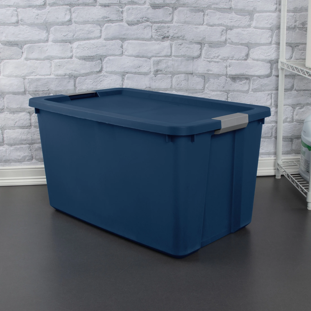 Step up to Sterilite's versatile 34 Gallon Storage Bin with latching lid, ideal for a variety of household storage challenges! The deep recessed lid surface allows totes to stack securely to efficiently use vertical storage space. Large latches keep the lid attached to the base, so contents stay safely stored inside, and provide a comfort grip when carrying. The sturdy design makes it a great option for garages, basements and attics, where you might need a bit more durability. This large size plastic storage container is perfect for storing and concealing blankets, sleeping bags, seasonal clothing, sporting gear, and more! The overall assembled dimensions of this item are 31 5/8" L x 20" W x 17 1/4" H. Sterilite 34 Gallon Latch Tote, Stackable Plastic Storage Bin with Latching Lid, Blue Outside Dimensions: 31 5/8" x 20" x 17 1/4" Interior Dimensions at bottom: 26" x 16 1/2" x 16 1/8" Large latches secure lid to base, keeping contents safely stored inside Deep recessed lid allows for secure stacking, maximizing vertical storage space Comfortable in-molded handles make lifting and transporting easy Use good judgment when stacking items, keep heaviest bin at the bottom BPA-free and phthalate-free