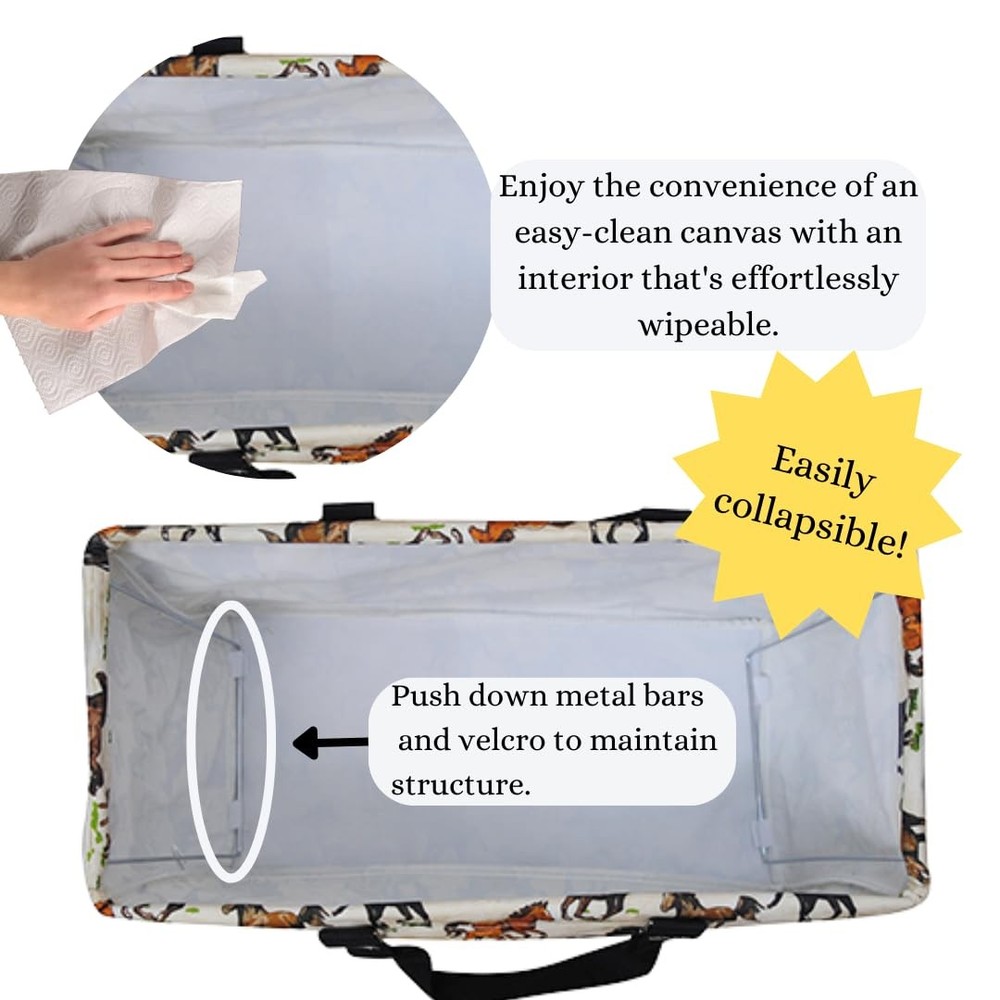 Cute multi purpose classic utility tote bag. Collapse when not used. Constructed with water resistant nylon material. Push down metal bars and velcro to maintain the shape of the bag. Open basket style. Size of the bag is 23 x 10 x 10. Extra large size classic open utility tote bag. Can be used as shopping bag (warehouse clubs), overnight, weekender bag, beach bag, storage basket, craft bag, closet organizer basket and more! Haul your tools, groceries, beach towels, or camping gear on the go. Open top makes it easier to throw and pick up things in the bag. Convenient side mesh pockets and mini open pocket for small items. Double carrying handles. Handle drop approximately 13". Monogram Ready (Monogram sold Separately). Great gift idea for your friends and family. ① Cute multi purpose classic utility tote bag. Collapse when not used. ② Constructed with water resistant canvas material. Push down metal bars and velcro to maintain the shape of the bag. Open basket style ③ Size of the bag is 23 x 10 x 10. Extra large size classic open top utility tote bag. Can be used as shopping bag (warehouse clubs), overnight, weekender bag, beach bag, storage basket, craft bag, closet and shelf organizer basket and more! ④ Double carrying handles. Handle drop approximately 13". Monogram Ready (Monogram sold Separately). Great gift idea for your friends and family. Not intended for children 12 years and younger.