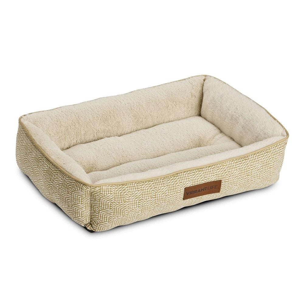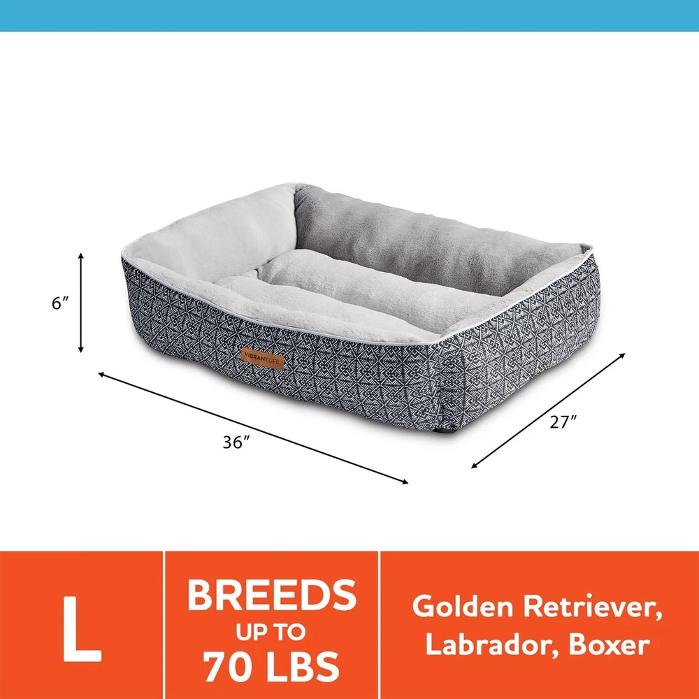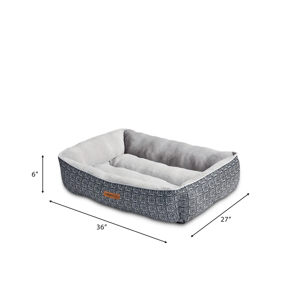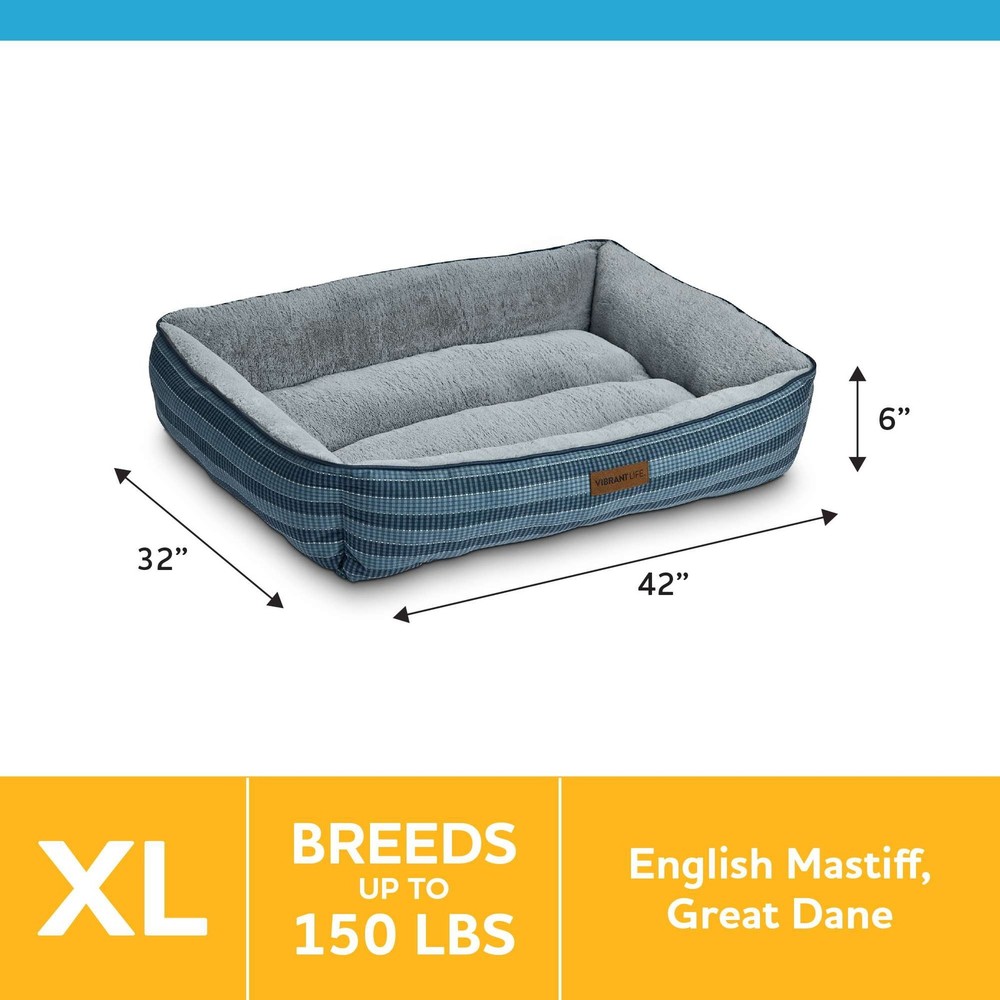 The Vibrant Life Extra Large Lounger Dog Bed will provide your pet with a cozy and tranquil space to unwind. Measuring 42" by 32", this comfy dog bed is ideal for extra large dogs up to 150 pounds like English Mastiffs and Great Danes. This contemporary dog bed has reinforced walls that give your pet support and comfort as well as a soft place to sleep. You will rest easy, too, knowing that this washable dog bed is made with 100% recycled fill material. Soft & Cozy Sleep Area Bolstered Walls for Comfort & Support Machine Washable