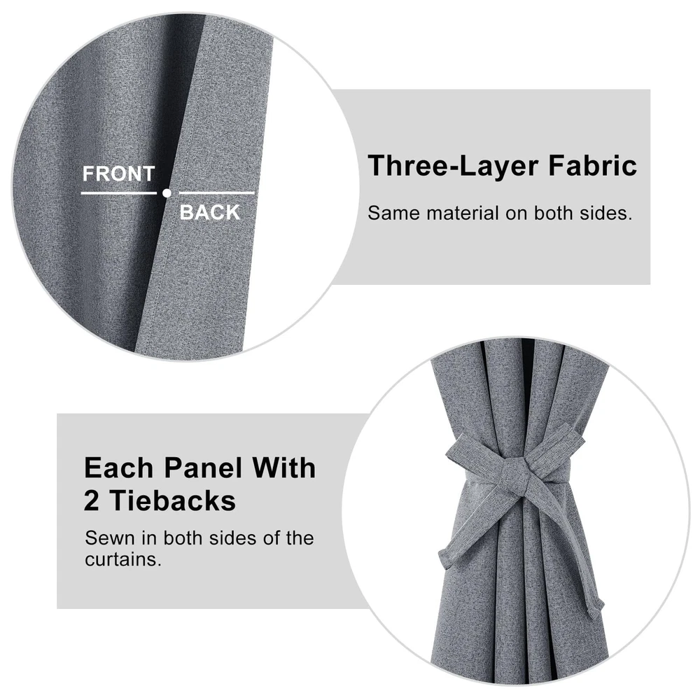 100% blackout curtains designed with 2 linen fabrics outside, between which is blackout lining, so the back side and front side are same. The textured faux linen curtains convey an image of nature and tranquility. The curtains are soft and thick which can create a luxury atmosphere for your home decor, especially for farmhouse decor. Silky touch considerately upgrades your purchasing experience and sets the mood for the rest of the day. PACKAGE INFO: For each packing, there will be 2 panels inside. Each contains 2 faux linen curtains in size 52W x 120L, equipped with 8 standard silver grommets with 1.6-inch inner diameter. BETTER SLEEPING EXPERIENCE: total blackout curtains adapts 3-layer combined fabric, 2 outside layers are linen look and the middle layer is 100% blackout fabric. For doing so, it can block UV ray, creating a great environment for lighter sleepers/ night workers/ babies, which enable them to sleep through the night. UPGRADED COMFORT: tieable curtains are various in sizes and in colors. Both sides of curtains look same. Those linen blackout curtains are good at thermal insulation, keeping your room warm in winter while cool in summer. Our curtains are suitable for bedroom, living room, office, kitchen, baby room, study room and so on, especially for farmhouse style. TIEBACK DESIGN: Both 2 panels are separately sewn with a tieback, so that you can tie them up without purchasing any other ropes and let sunlight in whenever you want to. They are fixed in curtains, and uneasy to loose. MACHINE WASHABLE:For a better purchasing experience, please wash in cold water, tumble dry on low and ironing at low temperature (if needed). Don’t bleach. Any other questions, do not hesitate to contact us.