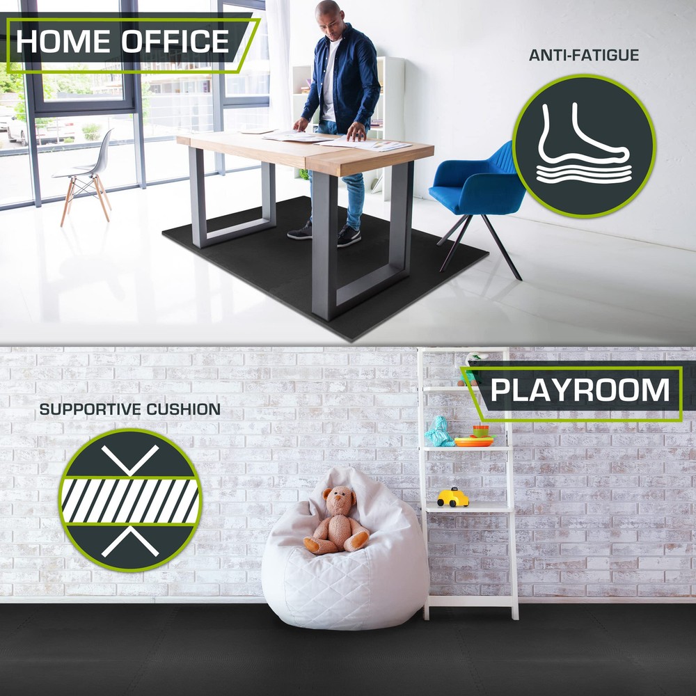 Transform any space into a comfortable workout area with the Exercise Puzzle Mat 3/4" or Exercise Puzzle Mat 1". Six extra-thick tiles create protective flooring over wood, concrete, or carpet for workouts and gym equipment. This is the perfect solution for anyone looking for an exercise mat or multipurpose flooring thicker than 1/2" thick. Both mats have great durability, but the 1" creates more protection for heavier gym equipment and higher traffic. The textured surface has a soft feel with non-skid traction that is low maintenance. Interlocking pieces are easy to assemble, covering 96 square feet. 12 border pieces help to create a flawless finish. Built to absorb impact and provide cushion to sensitive joints while reducing noise. EVA foam contains no toxic phthalates. Use just a few tiles for smaller spaces, or purchase multiple sets for large areas. Perfect for fitness studios, home gyms, commercial use, children's play areas, gymnastics or wrestling practice, yoga and more! PROTECTIVE, PORTABLE FLOORING – Dense, durable tiles protect floors and withstand gym equipment and heavy use DIFFERENT LEVELS OF COVERAGE - Each tile measures 24”x24”x3/4” or 24"x24"x1"; 2 sets are available for each thickness. The ¾"offers pack of 6 tiles (24 SQ Ft) or 24 tiles (96 SQ FT) and the 1" offers pack of 6 tiles (24 SQ Ft) or 18 tiles (72 SQ Ft) SIMPLE ASSEMBLY – Lightweight pieces quickly connect; easy to disassemble and move. Great for gyms, fitness studios, or play areas. HIGH QUALITY FOAM - High-density EVA foam provides excellent support and cushion; Contains NO toxic phthalates SAFE & LOW-MAINTENACE – Non-skid textured surface provides traction; Water-resistant and noise-reducing design.