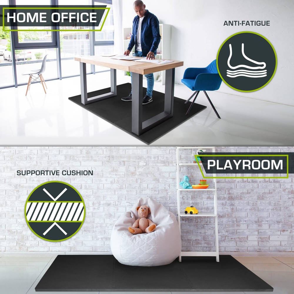 Transform any space into a comfortable workout area with the Exercise Puzzle Mat ¾” or Exercise Puzzle Mat 1". Six extra-thick tiles create protective flooring over wood, concrete or carpet for workouts and gym equipment. This is the perfect solution for anyone looking for an exercise mat or multipurpose flooring thicker than ½” thick. Both mats have great durability, but the 1" creates more protection for heavier gym equipment and higher traffic. The textured surface has a soft feel with non-skid traction that is low-maintenance. Interlocking pieces are easy to assemble, covering 24 square feet. 12 border pieces help to create a flawless finish. Built to absorb impact and provide cushion to sensitive joints while reducing noise. EVA foam contains no toxic phthalates. Use just a few tiles for smaller spaces, or purchase multiple sets for large areas. Perfect for fitness studios, home gyms, commercial use, children’s play areas, gymnastics or wrestling practice, yoga and more! PROTECTIVE, PORTABLE FLOORING – Dense, durable tiles protect floors and withstand gym equipment and heavy use COVERS 24 SQ. FT. - Each tile measures 24” x 24” x 3/4”-thick or 24" x 24" x 1"-thick Includes 6 tiles and 12 end borders for a polished look SIMPLE ASSEMBLY – Lightweight pieces quickly connect; easy to disassemble and move. Great for gyms, fitness studios, or play areas. HIGH QUALITY FOAM - High-density EVA foam provides excellent support and cushion; Contains NO toxic phthalates SAFE & LOW-MAINTENACE – Non-skid textured surface provides traction; Water-resistant and noise-reducing design.