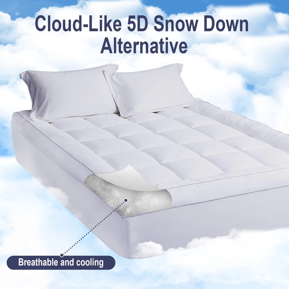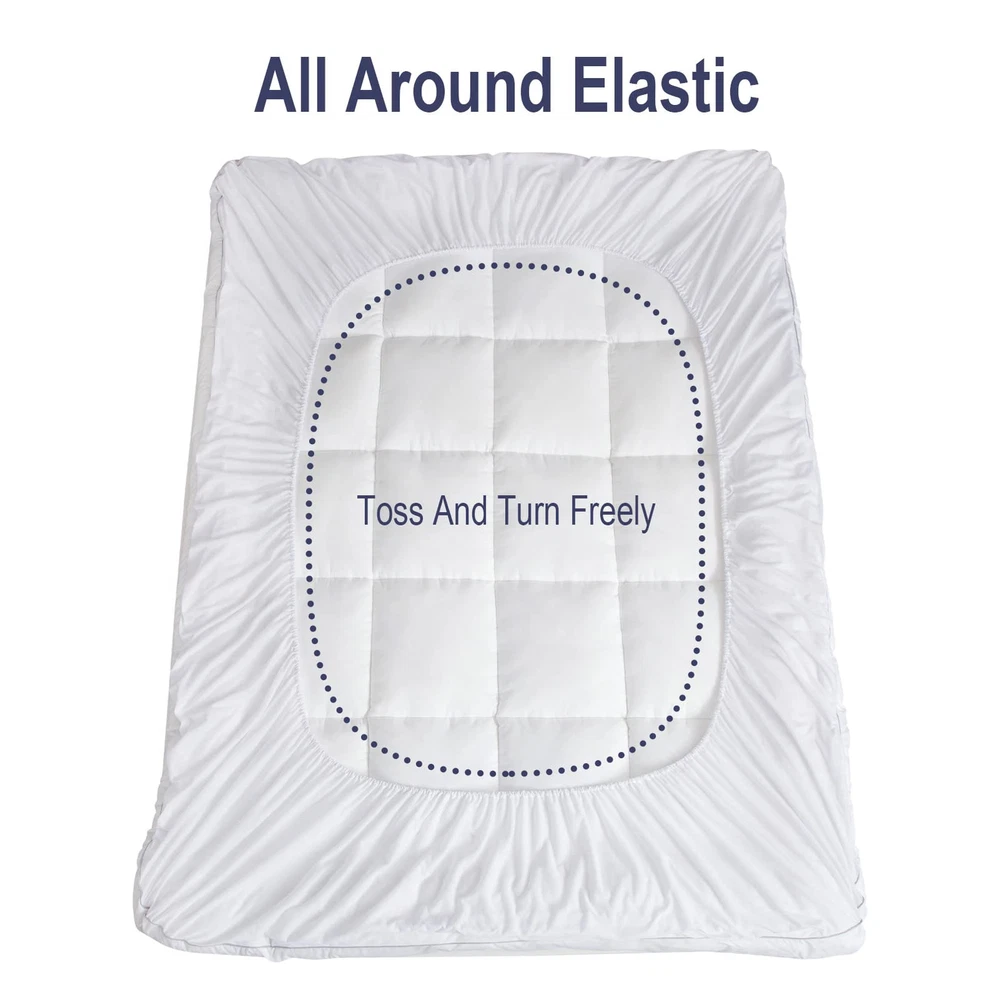 Extra Thick Mattress Topper - Our Mattress Topper is filled with 1300 GSM down alternative fiber, which is twice as much as many other mattress toppers on the market. With this extra filling. 100% Cotton Top & Premium Filling Fibre - The topper's shell is made of 100% cotton, providing a soft and durable surface that wicks away moisture for a comfortable night's sleep. Our cotton mattress topper boasts a premium filling fiber. Non-Slip and Deep Pocket - Our pillow top mattress topper comes with a non-slip, all-around stretchable elastic skirt that fits any mattress up to 24" deep. which ensures a snug fit and prevents the topper from popping off at the corners. Instantly Upgrade Your Old Mattress - Adding a fluffy mattress topper could be the easiest way to personalize your mattress and get the ultimate in luxury slumber. With our cloud-like plush down alternative mattress topper. Product Care - Delivered in a vacuum sealed package, the mattress topper may look thinner after opening. To fluff it up quickly, just shake it, and leave it for several hours.