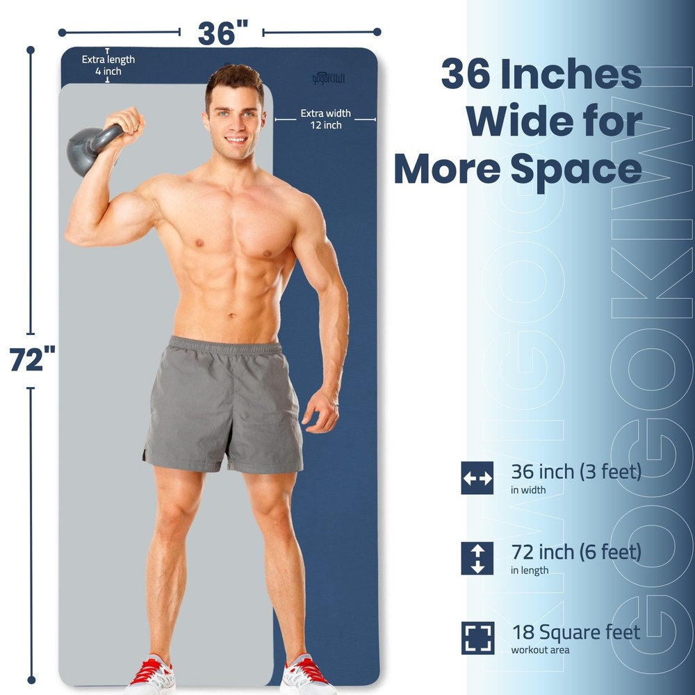 【Extra Space for Extra Comfort】 With a size of 72x36 inches, our extra large yoga mat is 50% wider than traditional mats, offering ample space for men and plus-size women to move freely and comfortably during their workout. 【Eco-friendly & Recyclable】Crafted from 100% recyclable premium Recfoam, our large exercise mat is not only durable but also kind to the environment, ensuring no harm to our planet during its lifecycle. 【Dual-sided Non-slip Design】Our workout mats for home gym features two different colors and patterns, enhancing its anti-slip properties and allowing you to switch sides based on your mood and workout needs. 【Center Alignment Line for Balance】The unique center alignment line helps you position your moves accurately and maintain balance, enhancing your yoga experience. 【Lightweight & Portable with Yoga Strap】Weighing just 2.7 pounds, our fitness mat is easy to carry and store. It comes with a yoga strap that can be used for carrying the mat or for stretching exercises.