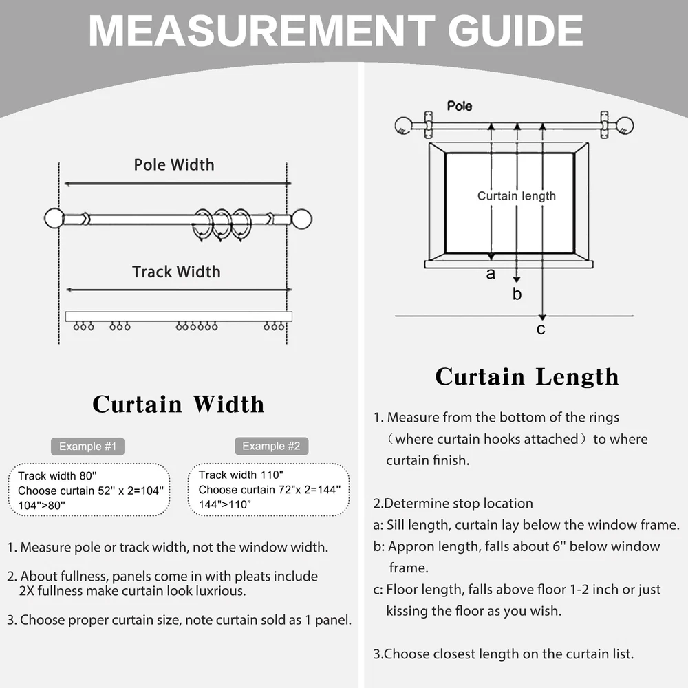 Fabric Composition: 100% Polyester Easy to install: Pinch pleat, tieback and 3"H plastic pin hooks included. Rings are not included. Put the hook through the hole on the traverse rod, or just install the curtain on the curtain rod through the curtain rings. Hooks can move curtain up and down within 3 inches to cover rod or track. Easy Care: Hand wash is recommended and machine wash is possible in cold water on gentle cycle and hang to dry or dry clean. pinch pleat curtain is plenty thick to block 80% to 95% sunlight. Their existence protect the privacy and balances room temperature by insulating against summer heat and winter chill. If there is any quality issues, please feel free to email us, we will make it right for you. Our pleated curtains are crafted from a premium super soft and thick triple weaved polyester fabric. Using three layers of woven technology, the curtains are delicate, fade-resistant and comes with a textured feel. Same color on both sides. READY MADE: One package includes 1 panel only. Panel width is the width that pleats already set. Tieback and pinch pleat hooks included. Hooks height adjustable within 3". But the curtain rings are Not included, which need to be purchased separately. Pleats / hooks quantity: 6 pleats for 38" width; 9 pleats for 52" width; 13 pleats for 72" width; 15 pleats for 84" width; 17 pleats for 100" width. ENERGY SAVING: The curtain is thick enough to block 80-95% sunlights and UV rays (Dark color works well) for maximum privacy and undisturbed sleep. Also balances room temperature by insulating against summer heat and winter chill, reducing air conditioning costs. Protect your furniture, floors and artwork from the ravages of the sun. EXTENSIVE USE: Pinch Pleat curtains hanging in the room look great. These pleated curtains are suitable for different places, such as kitchen, living room, bedroom, home office, kids room and nursery room, which can match various decor styles. EASY CARE: Some packing creases / wrinkles will fall off immediately after ironing. Hand wash is recommended and machine wash is possible in cold water on gentle cycle and hang to dry or dry clean. Do not bleach.